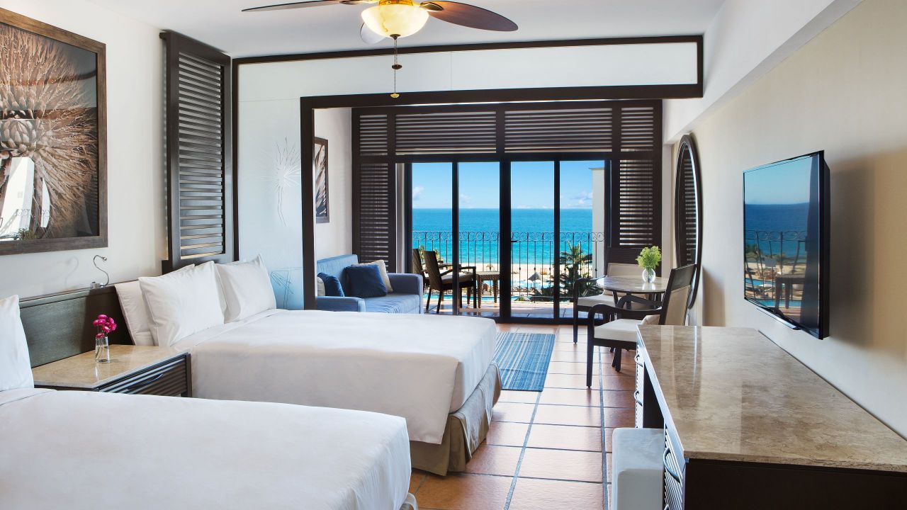 Ein spektakuläres, 54 m² großes Zimmer mit zwei Doppelbetten, Schlafsofa, Erfrischungscenter und einer Terrasse mit indirekter Sicht auf den Golf von Kalifornien.