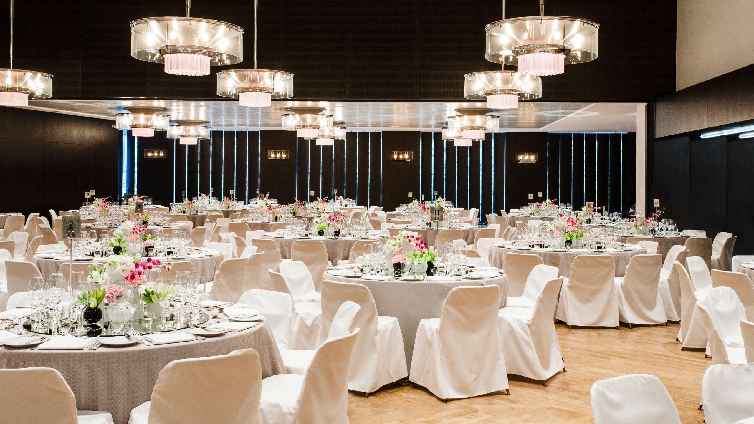 Our spacious Grand Ballroom features innovative lighting, a dance floor, and ceilings up to 6m high. The venue can be flexibly divided into Ballroom A and B, suitable for more intimate events of up to 120 guests. Elegant parquet flooring and a sophisticated ambiance create the ideal setting for unforgettable celebrations.