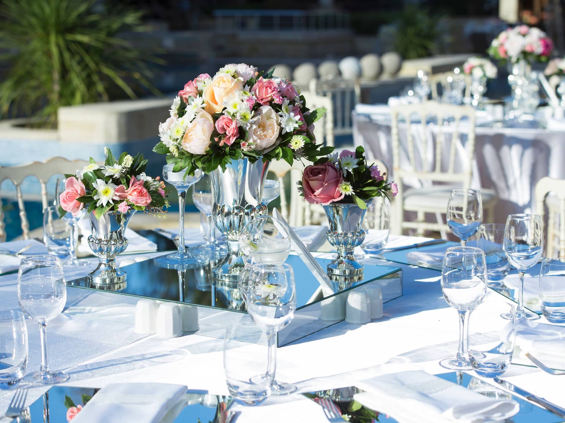 We provide complimentary white chair covers, white tablecloths, white napkins, menu cards and candelabra with candles to create the perfect ambience.