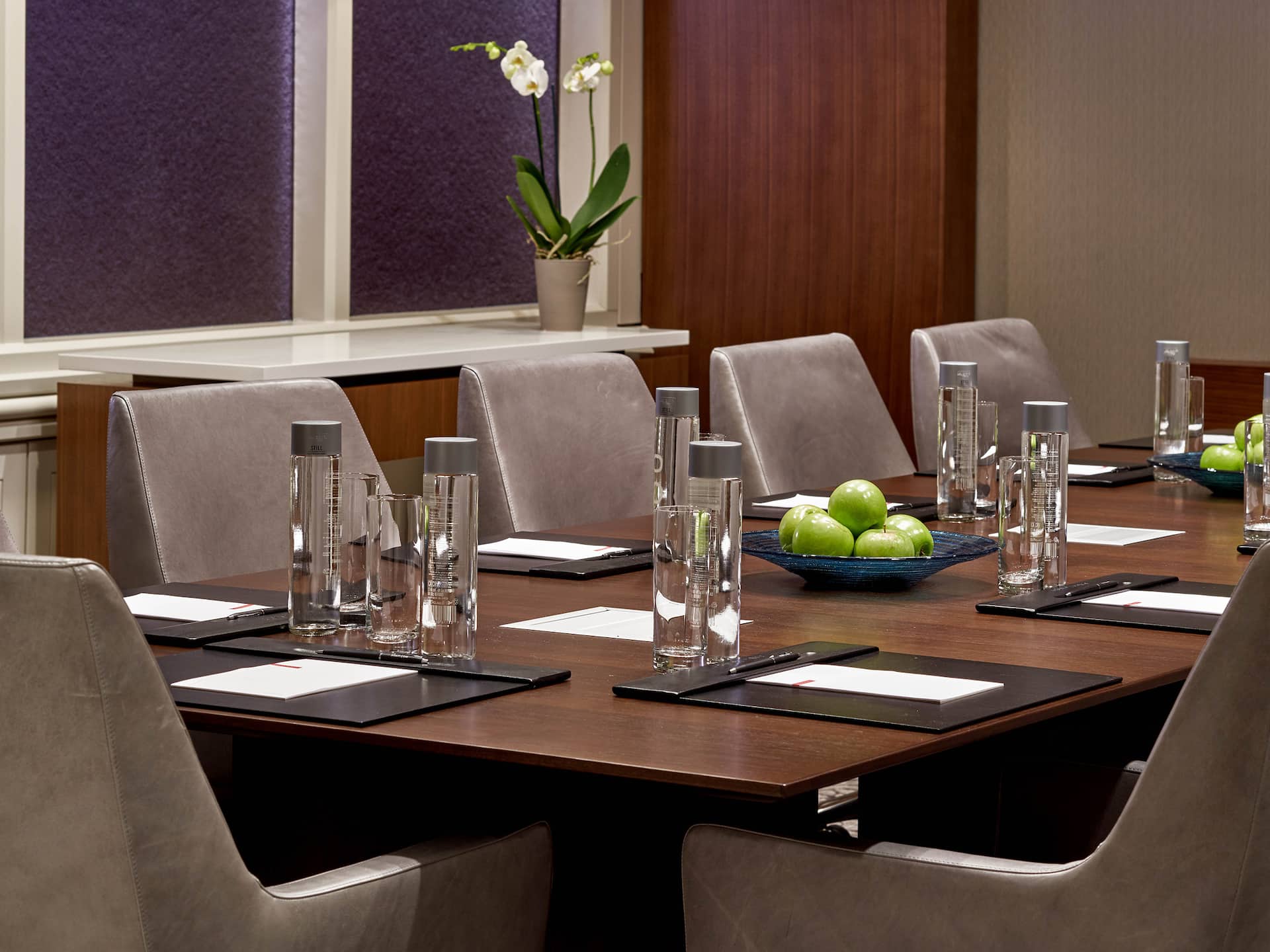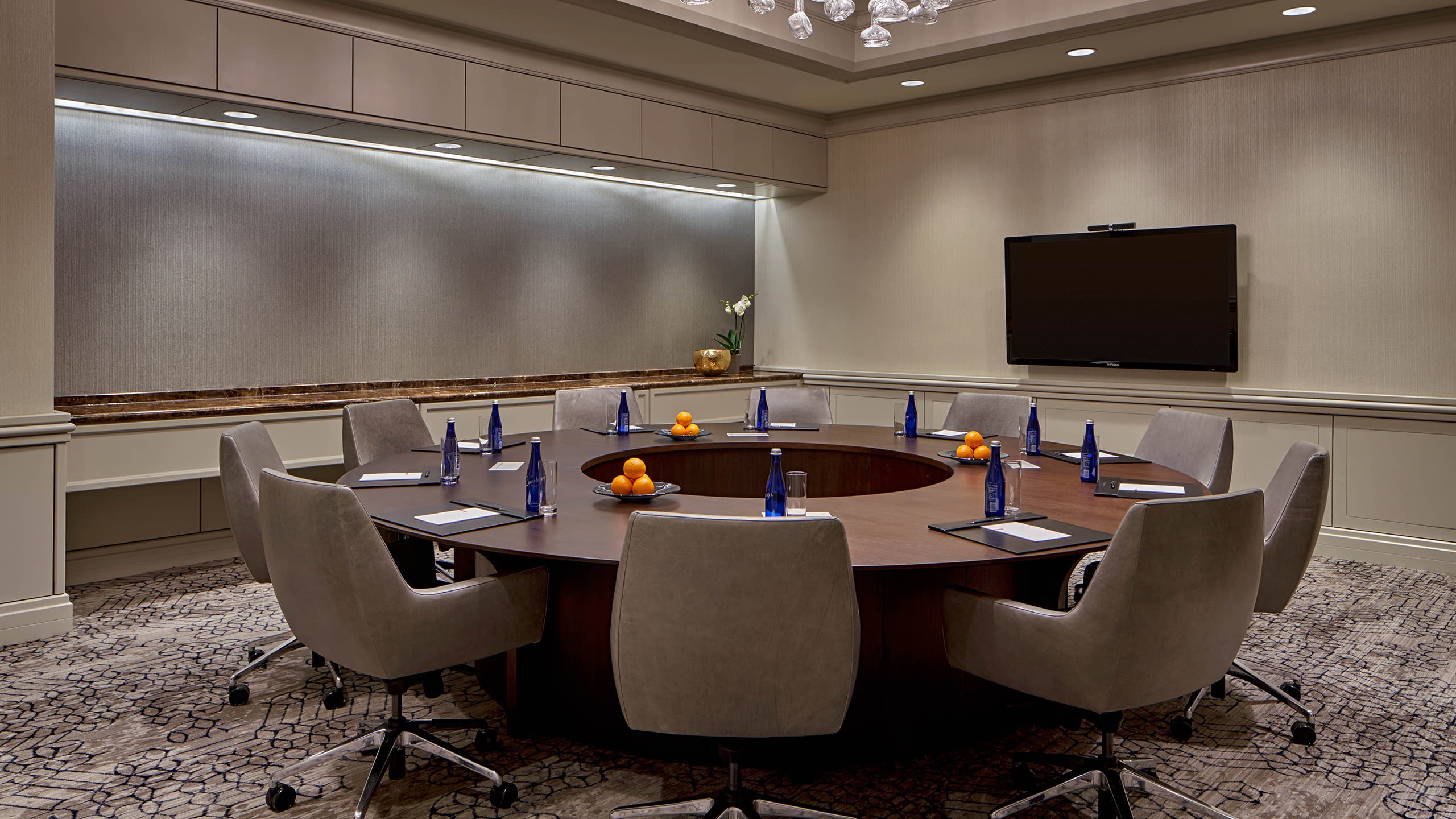 This 467-square-foot boardroom comfortably seats 14 guests for your meeting or other VIP function. Leather blotters and other upscale amenities are available.