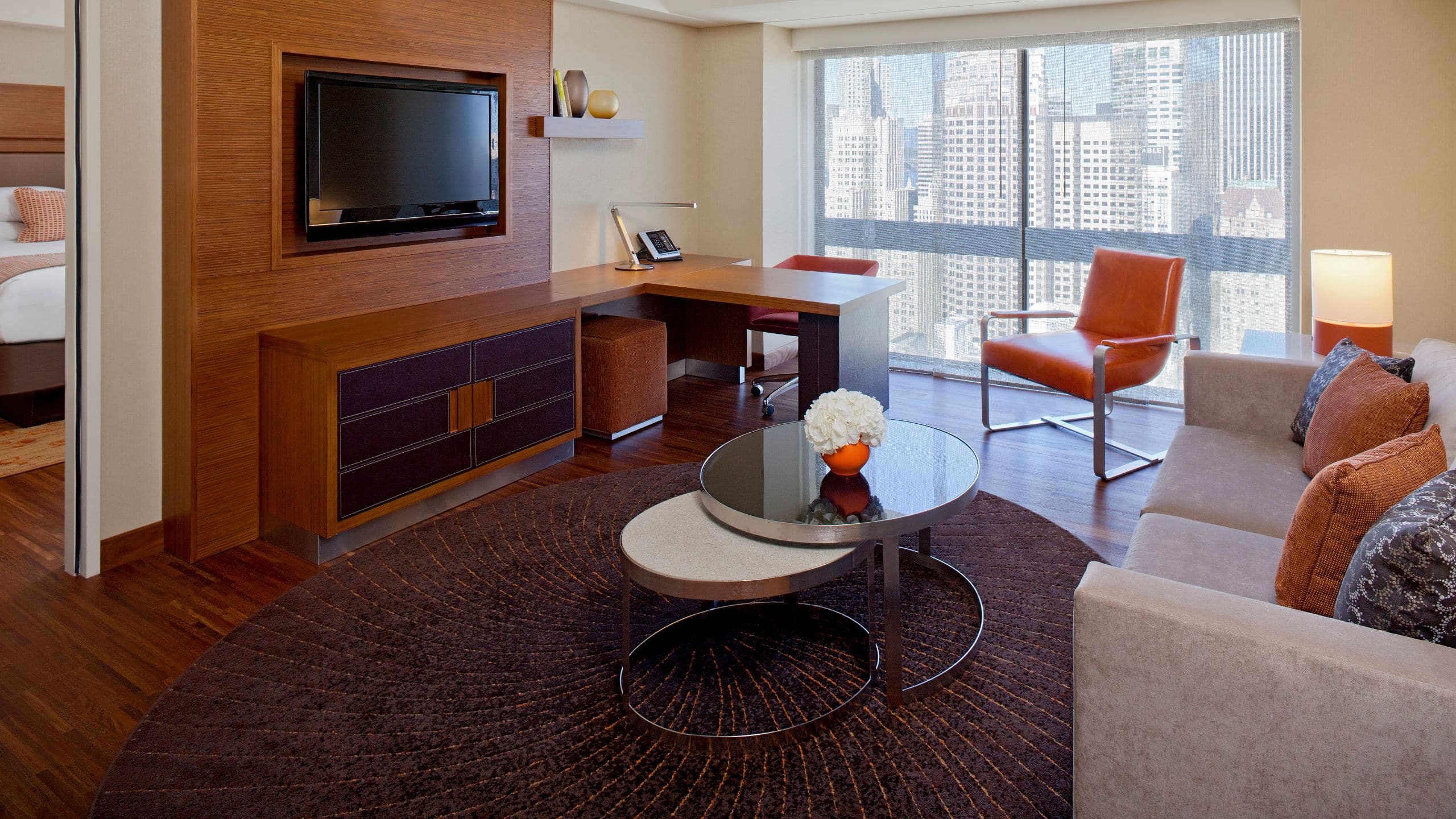 ユニオンスクエア滞在日数中に究極のリラクゼーションをお届けする、広さ29m2のバリアフリー客室ホテル。フローリングの床が美しいお部屋には、キングベッド1台、広々としたワークデスク、独立したリビングエリア、レジデンシャルスタイルの家具、機能的な照明を備え、フロア床から天井まで届く窓からは市区郡名ビューをお楽しみいただけます。バリアフリーのバスルームには、手すり付きの車椅子用シャワーと固定式シートをご用意しています。