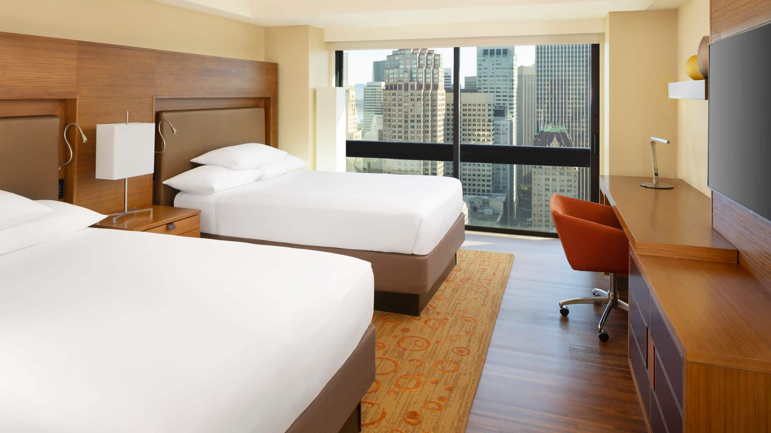 ゆったりとお寛ぎいただける広さ29m²の客室。ダブルベッド2台、ワークデスク、リビングエリアを備えているほか、床から天井までの大きな窓からサンフランシスコ市街の眺めをお楽しみいただけます。14~30階に位置し、全室にバスタブとシャワーを完備しています。