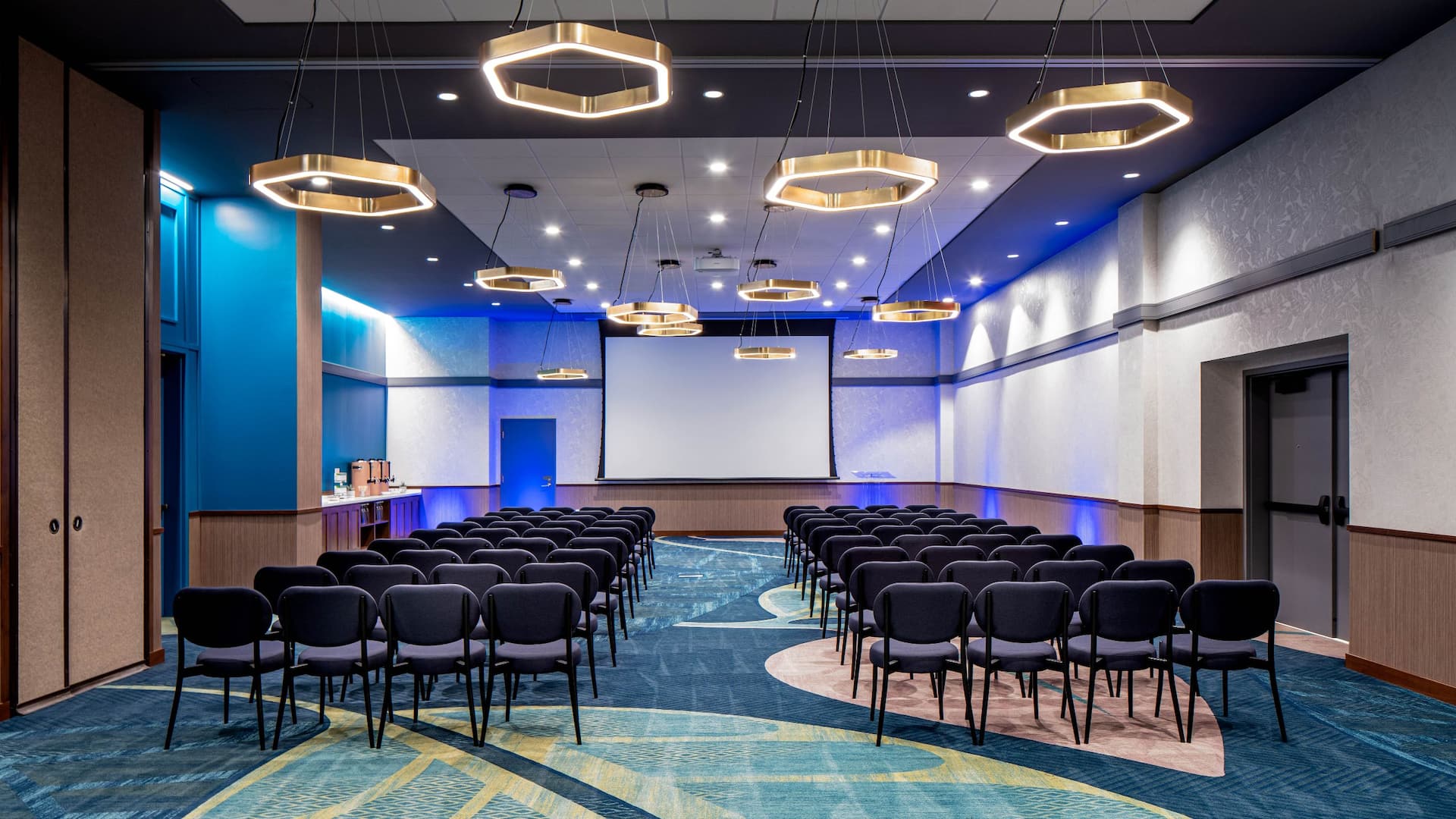 Plan intimate meetings and events within this standalone space. With 717 square feet, the room can comfortably host 20 to 90 guests, making it the perfect venue for presentations with its built-in screen and projector system.