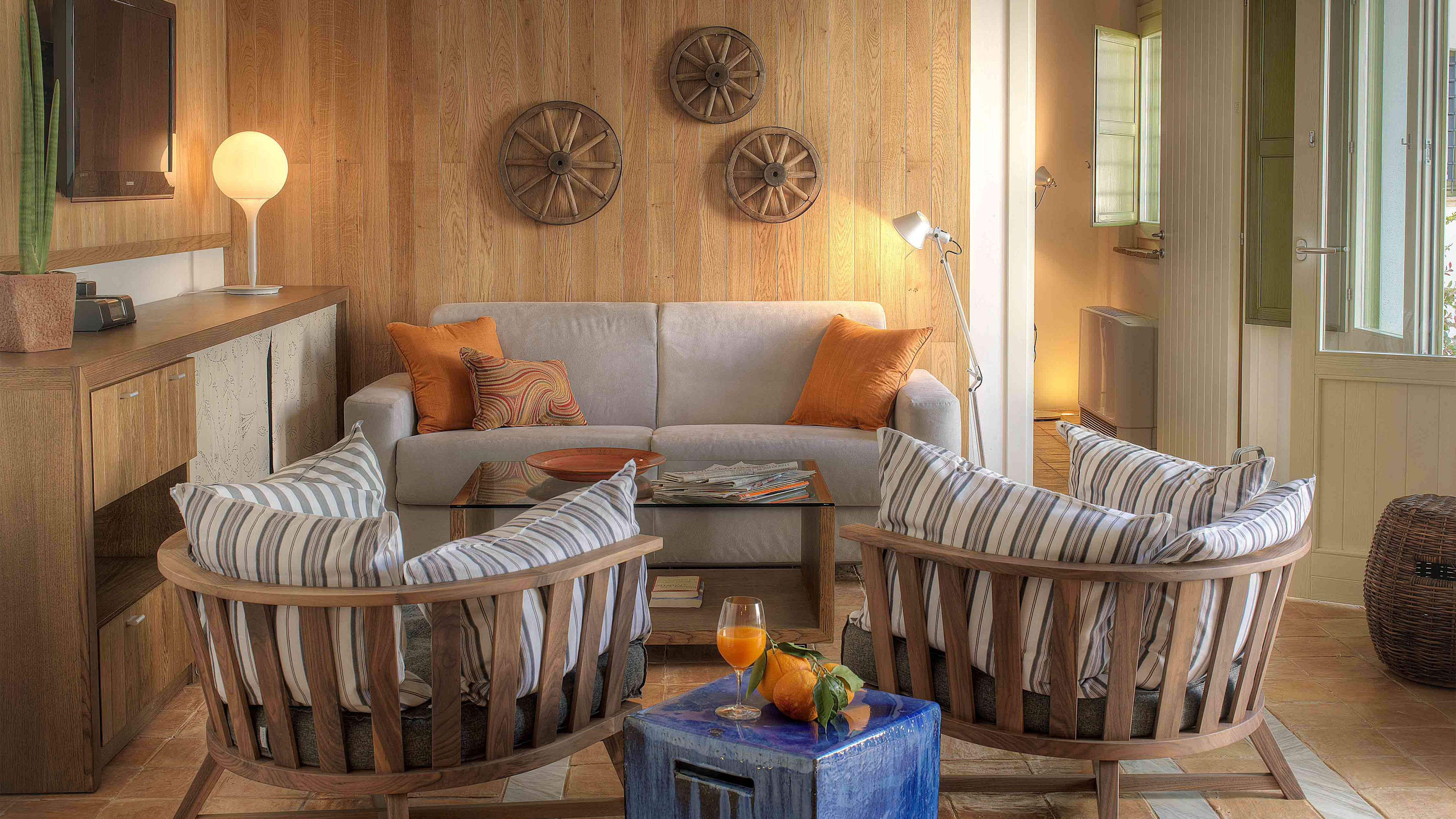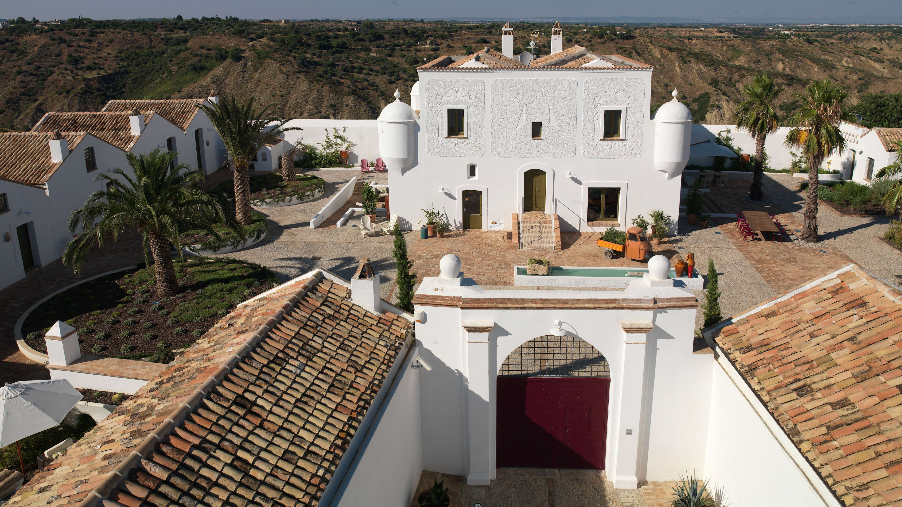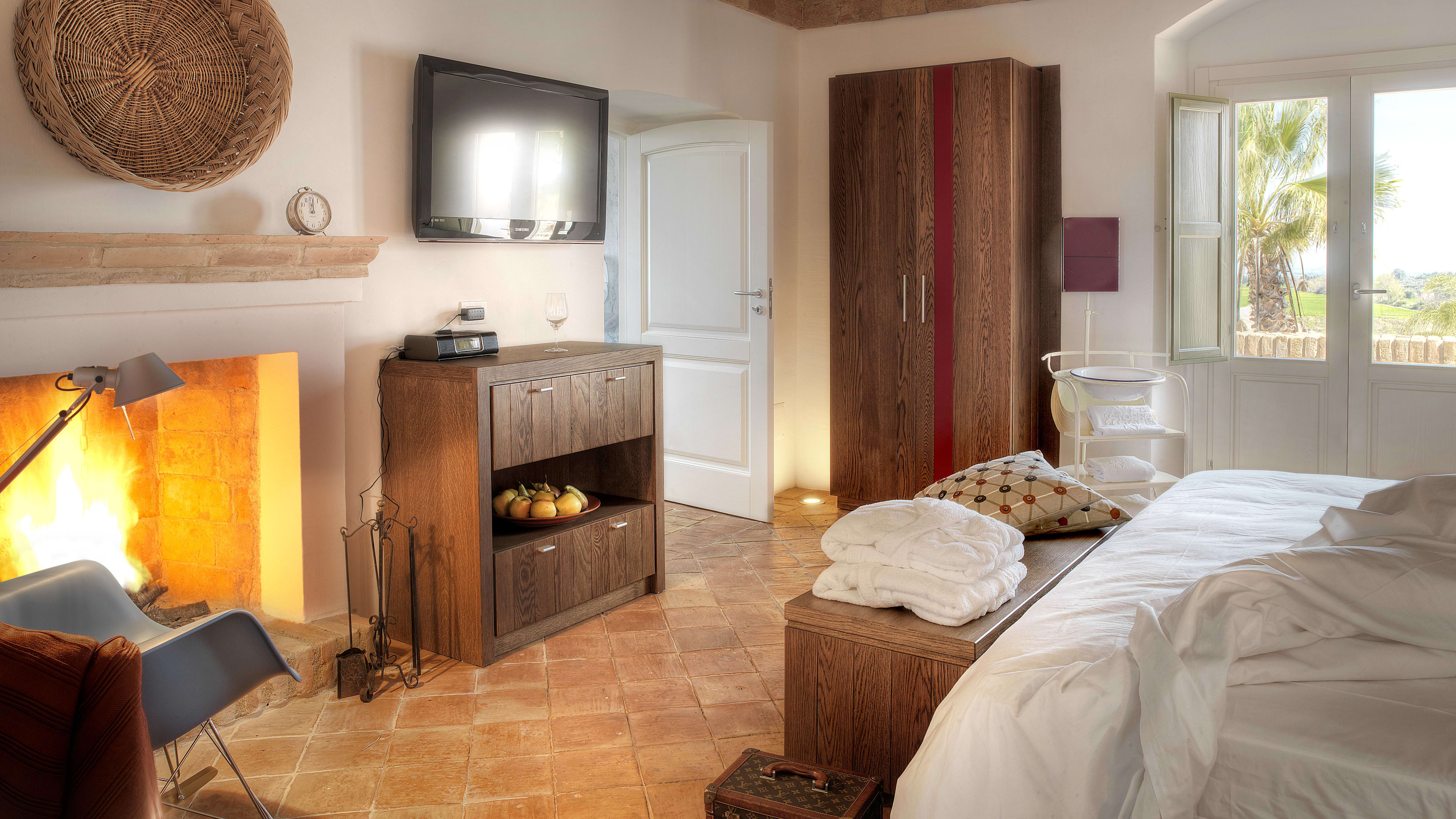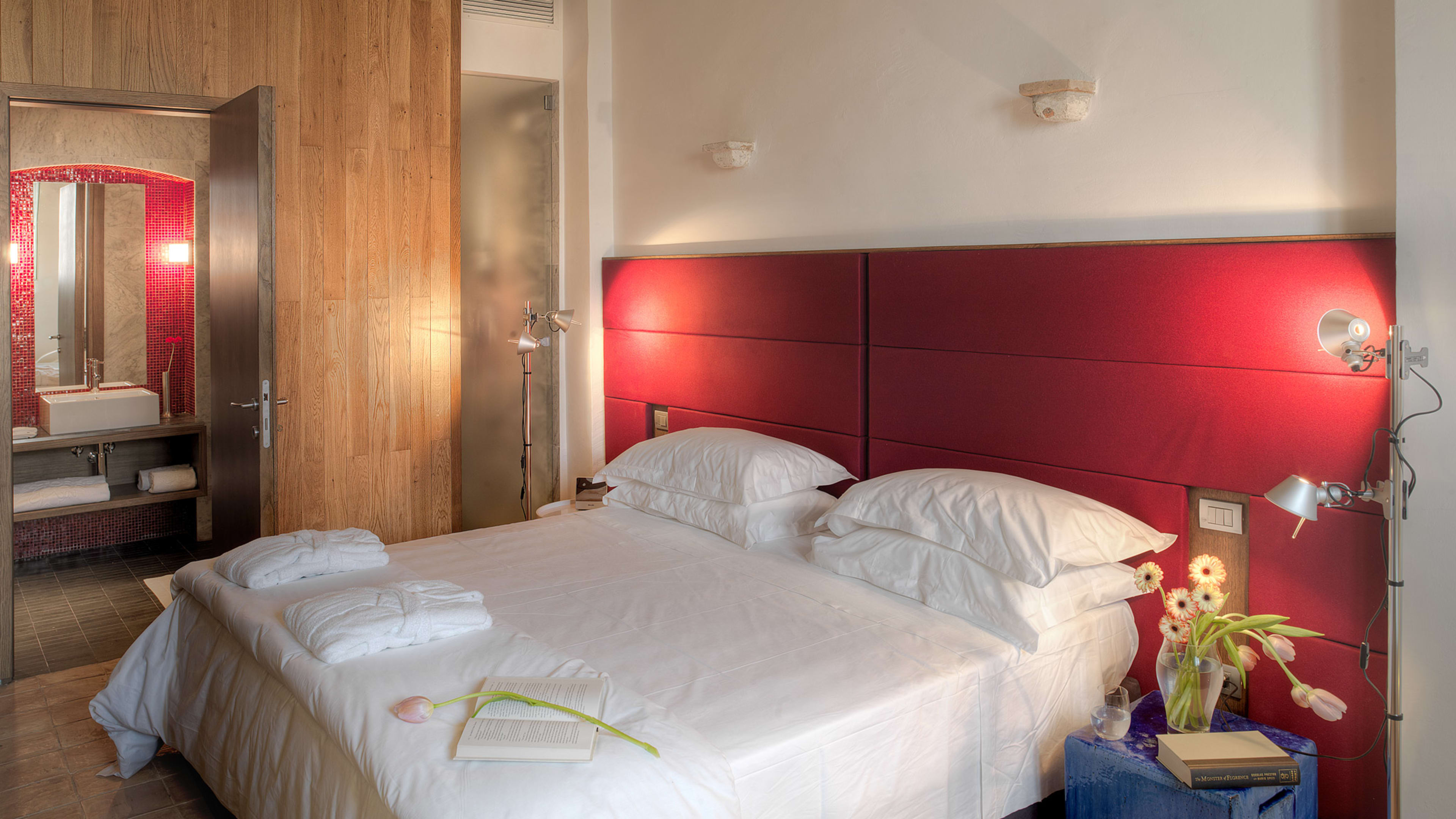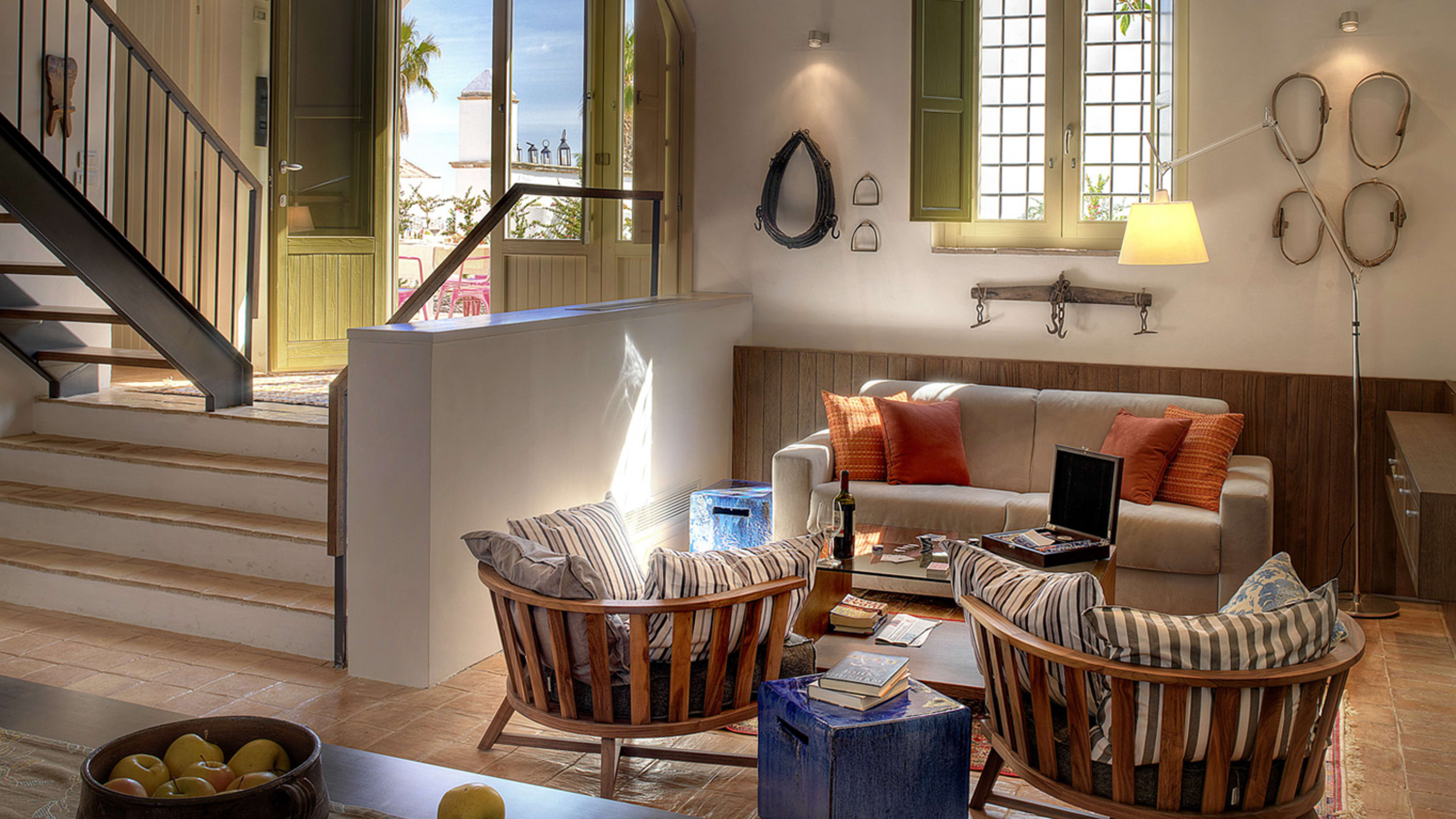 Each room is unique, thanks to the creative eye of the owner’s brother, and several incorporate symbolic features: the lines of marble between the terracotta tiles in Suite 3, for example, represent the Ottoman invasion of Basilicata. Suite 13, the caretaker’s former home, is perhaps the most epic: the tower has four turrets and two terraces for admiring the Campari-coloured sunsets over the valley and piazza. Suite 8 is the former chapel and retains a subtle religious theme, and in the three stable rooms you’ll find stirrups strung from the walls. The La Stall suite sleeps up to five guests and has its own outdoor seating area.