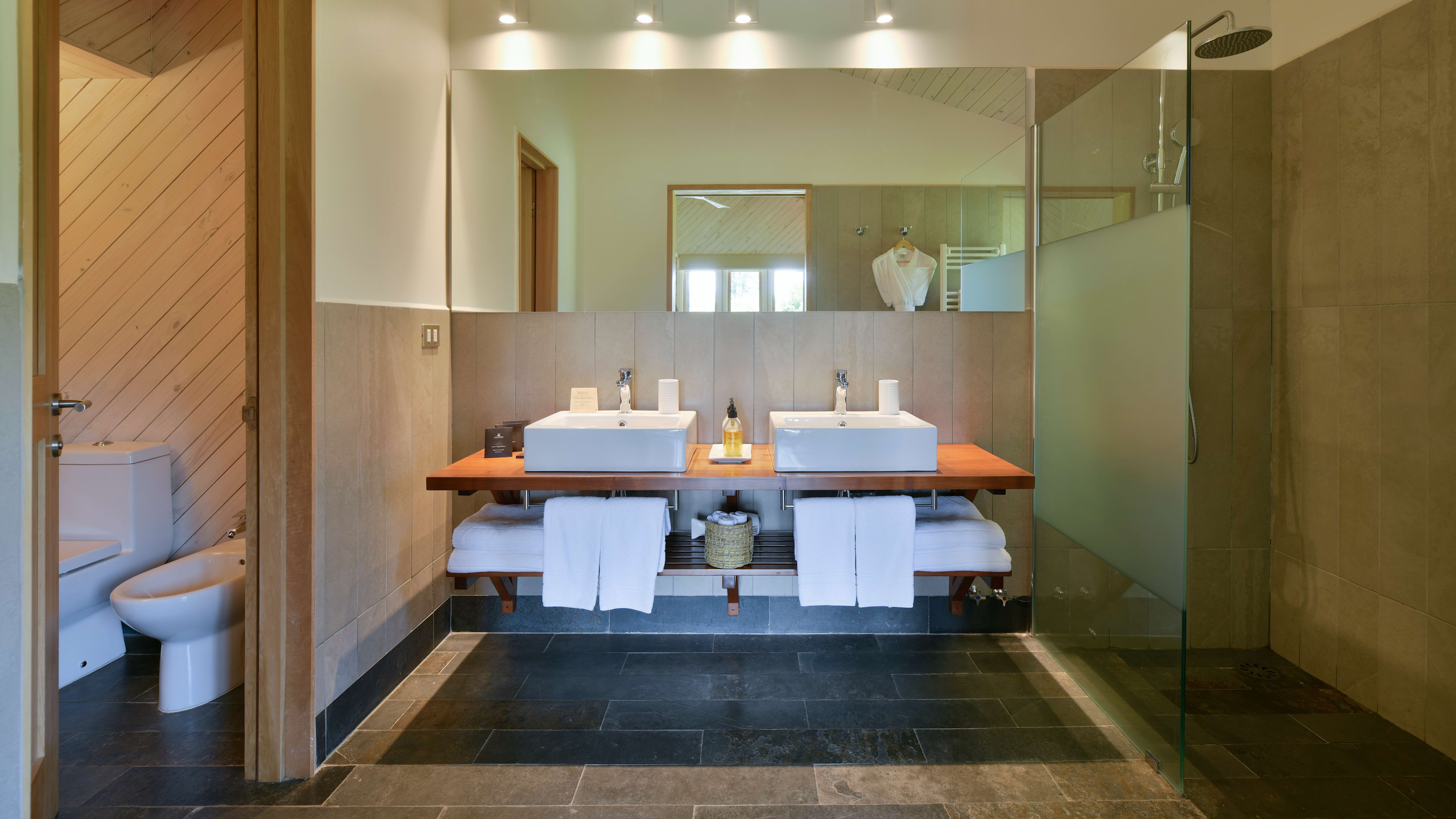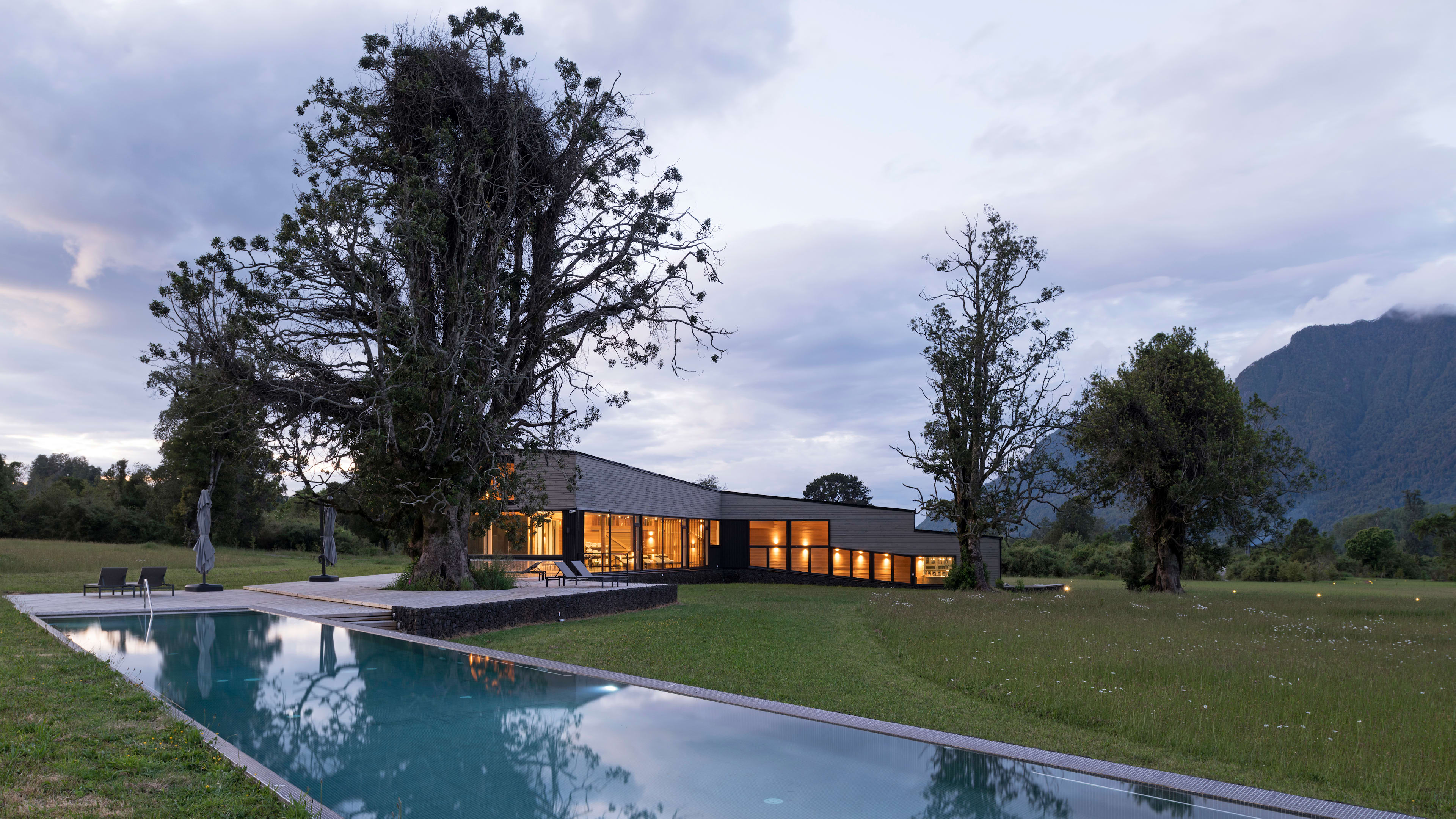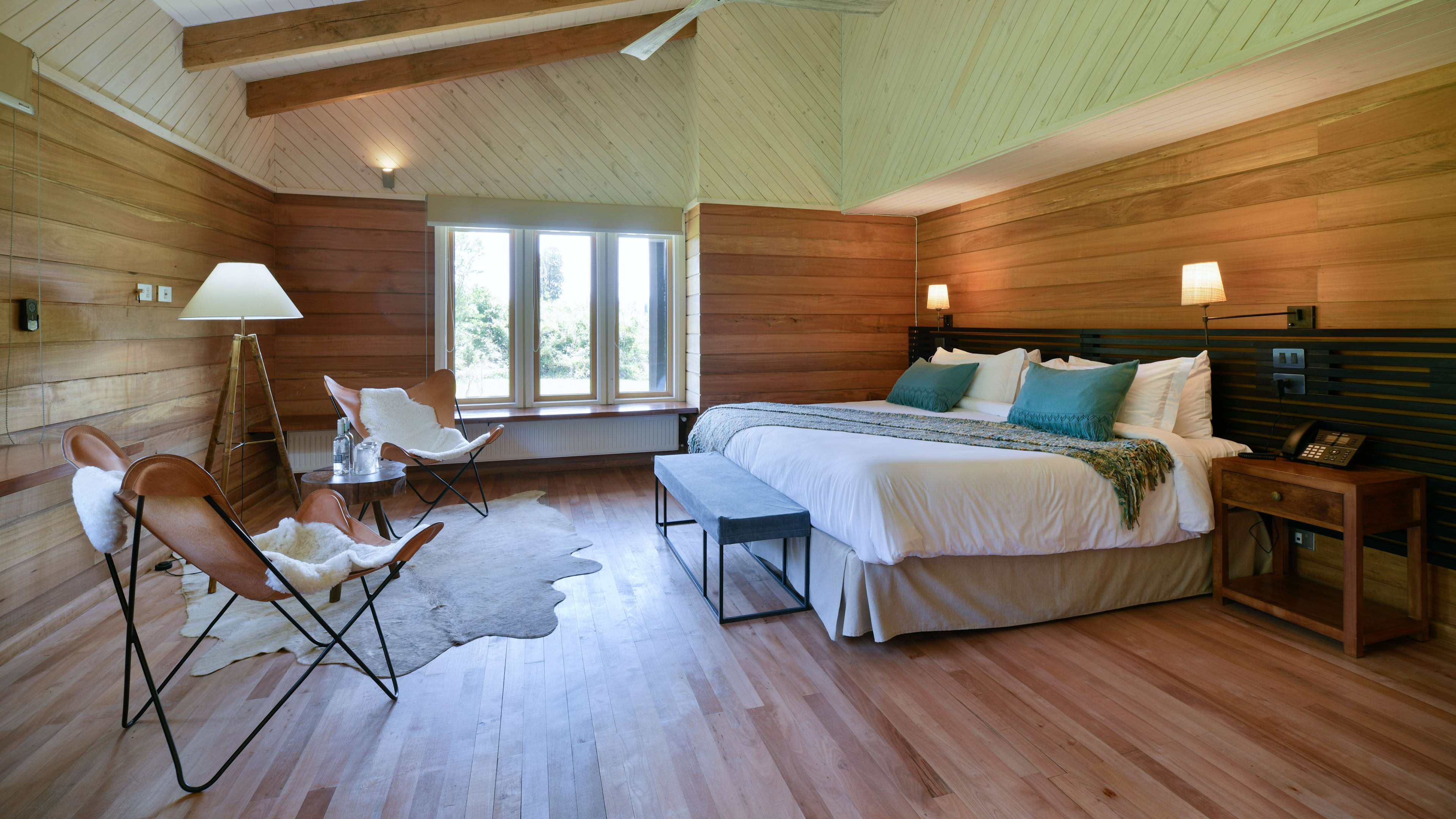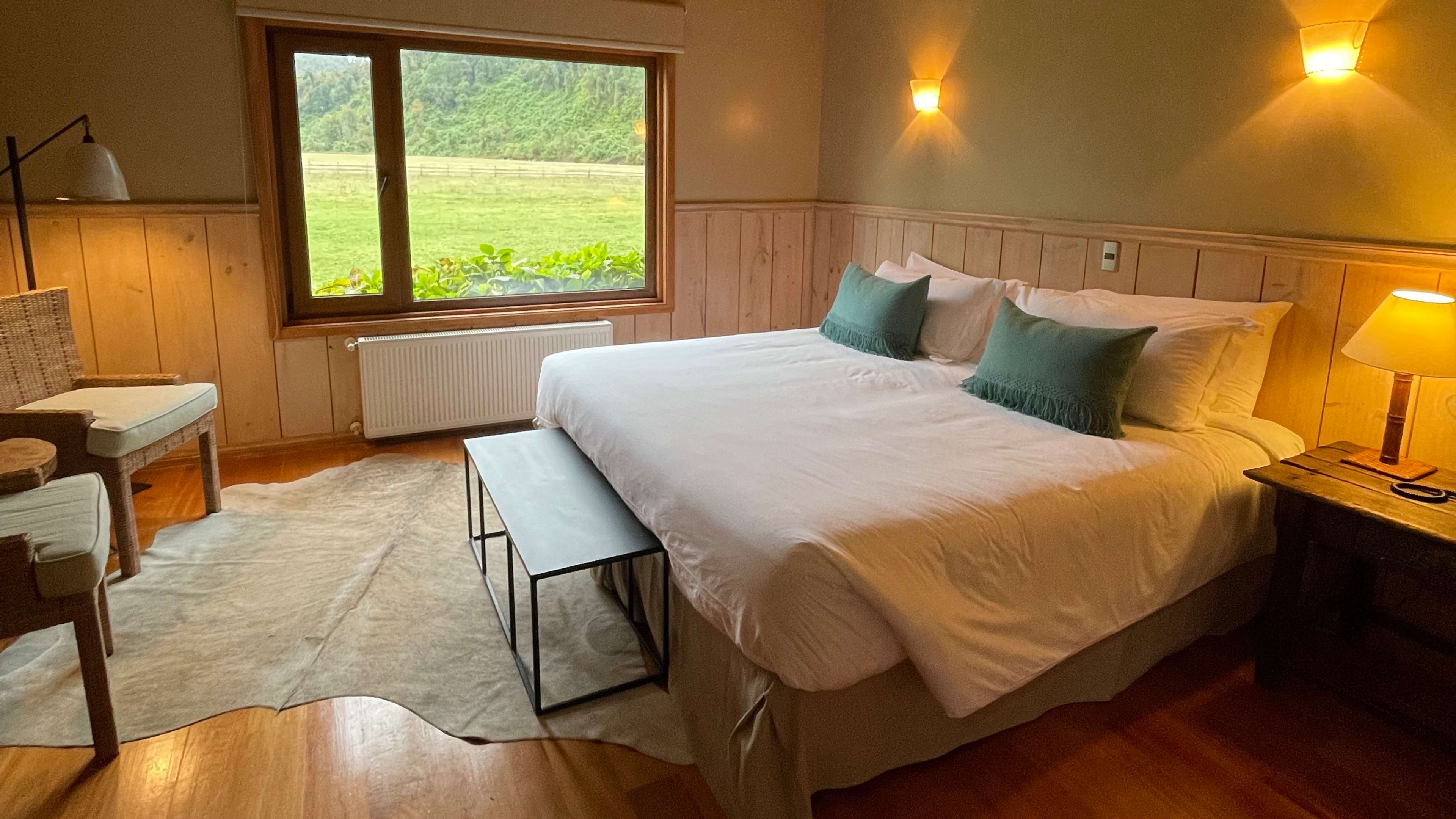 Clad from floor to ceiling in native timber, the rustically minimalist rooms look like a cross between an Alpine chalet, gaucho hut and Californian beach house. Every room has picture windows with uninterrupted views of the oak-dotted gardens, meadows and distant mountains; a wooden sill runs beneath each window, creating the perfect place to pen a postcard. The Exploradores Rooms, housed in a separate block about 120 metres from the main building, have views of the Rupumeica granite towers. For extra legroom, go for one of the suites, which have living areas with cowhide lounge chairs.