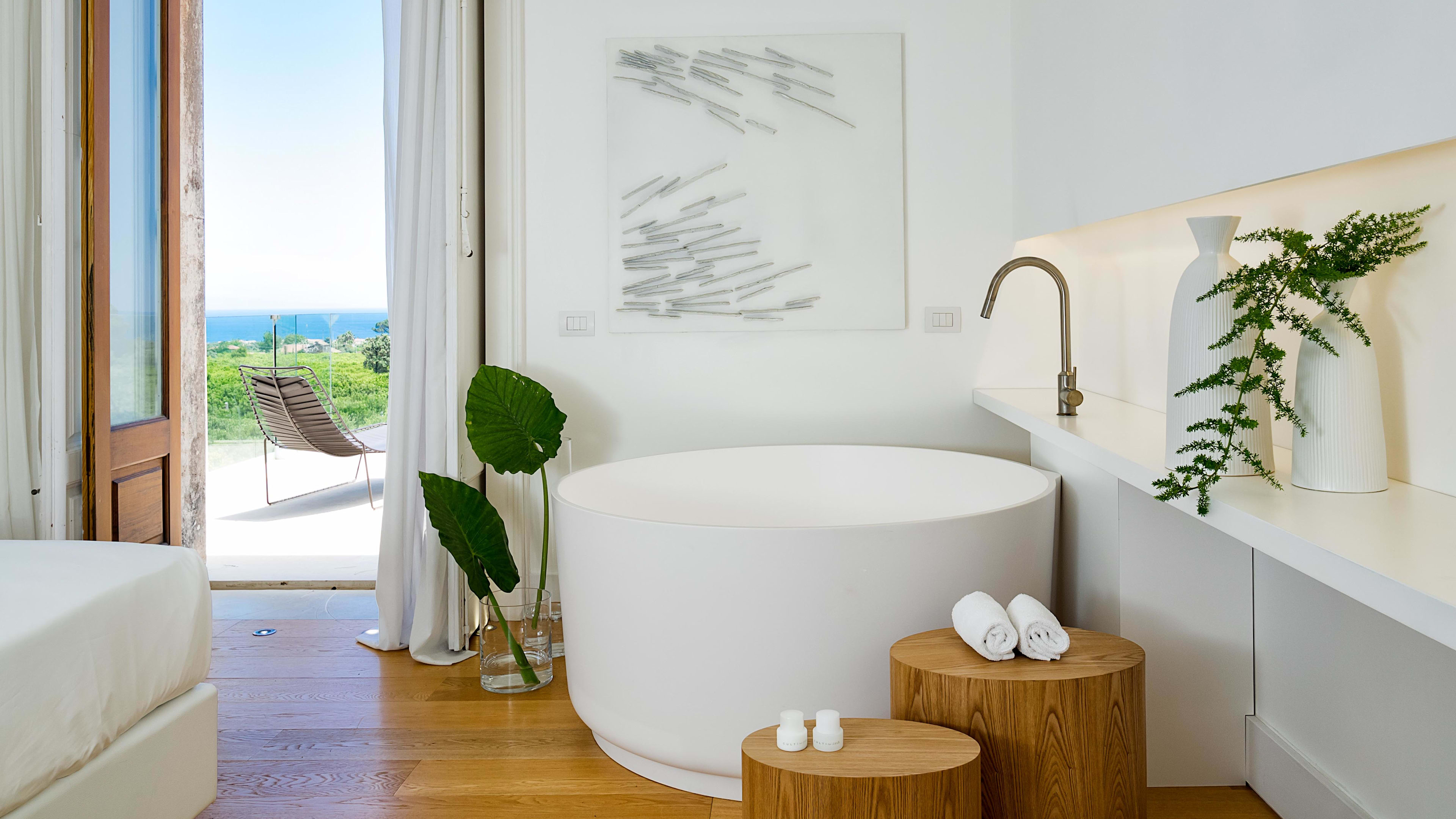 Rooms are assigned at the hotel’s discretion, but they do take requests. Old-school romantics, book a room in the main villa, which has enormous all-white suites that make the seas of blue and green framed in the arched windows sizzle and pop – some frame Etna too, so you can stay on lava-watch. One has a circular bath tub in the room, some have a fireplace and furnished terrace, but whichever you book you’ll be besotted. The villa-style suites hidden in citrus-scented glades across the estate are more modern (designed by Irachi Architetti) in sultry grey shades, but still work their wiles with pools that cheerily greet you with burbling jets, the odd sauna for two, and curtains that pull themselves back – giving you a great ‘ta-daa!’ moment – to reveal window-wall views so green and blue you’ll think God’s gone to town on the saturation slider.
