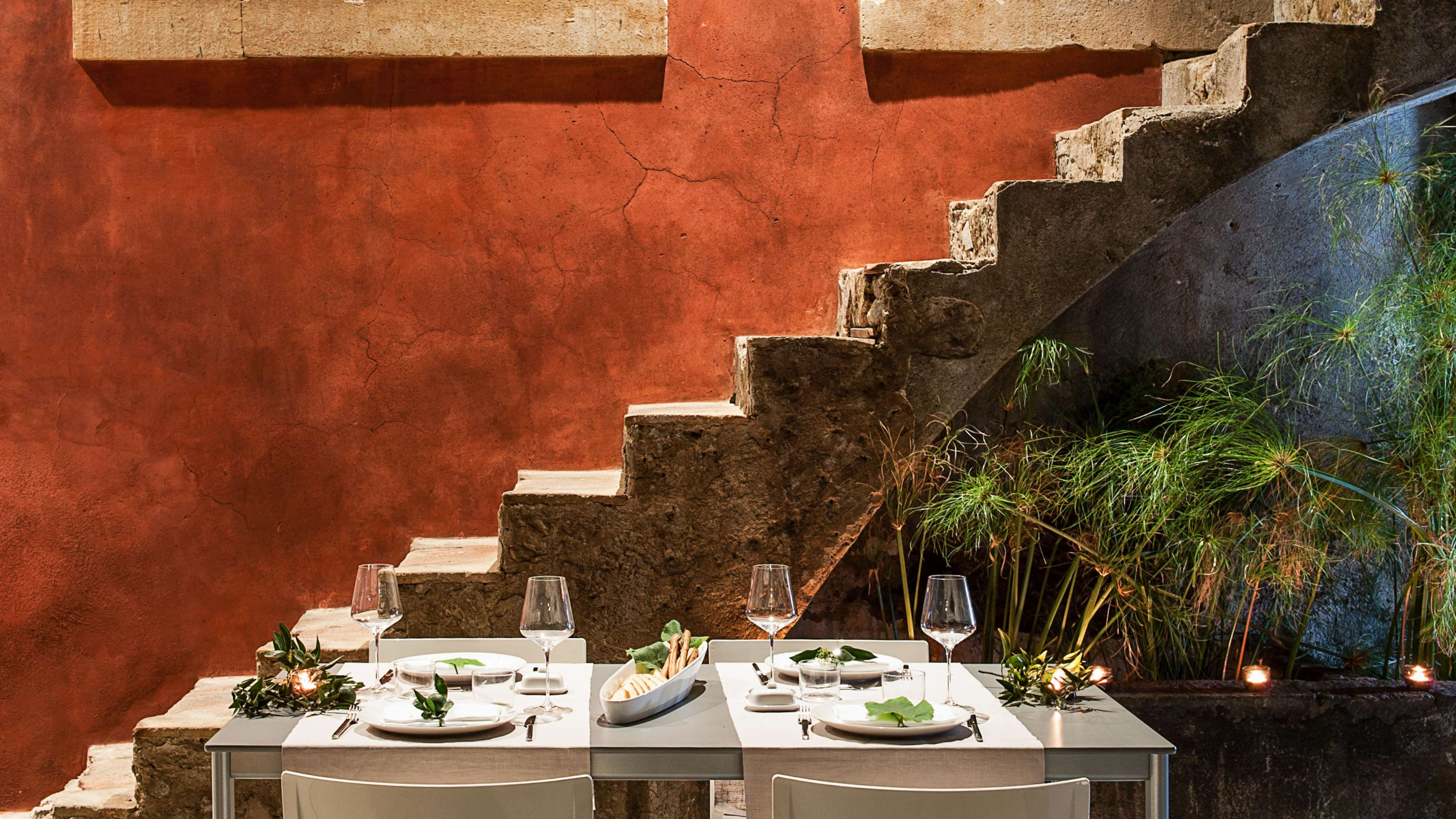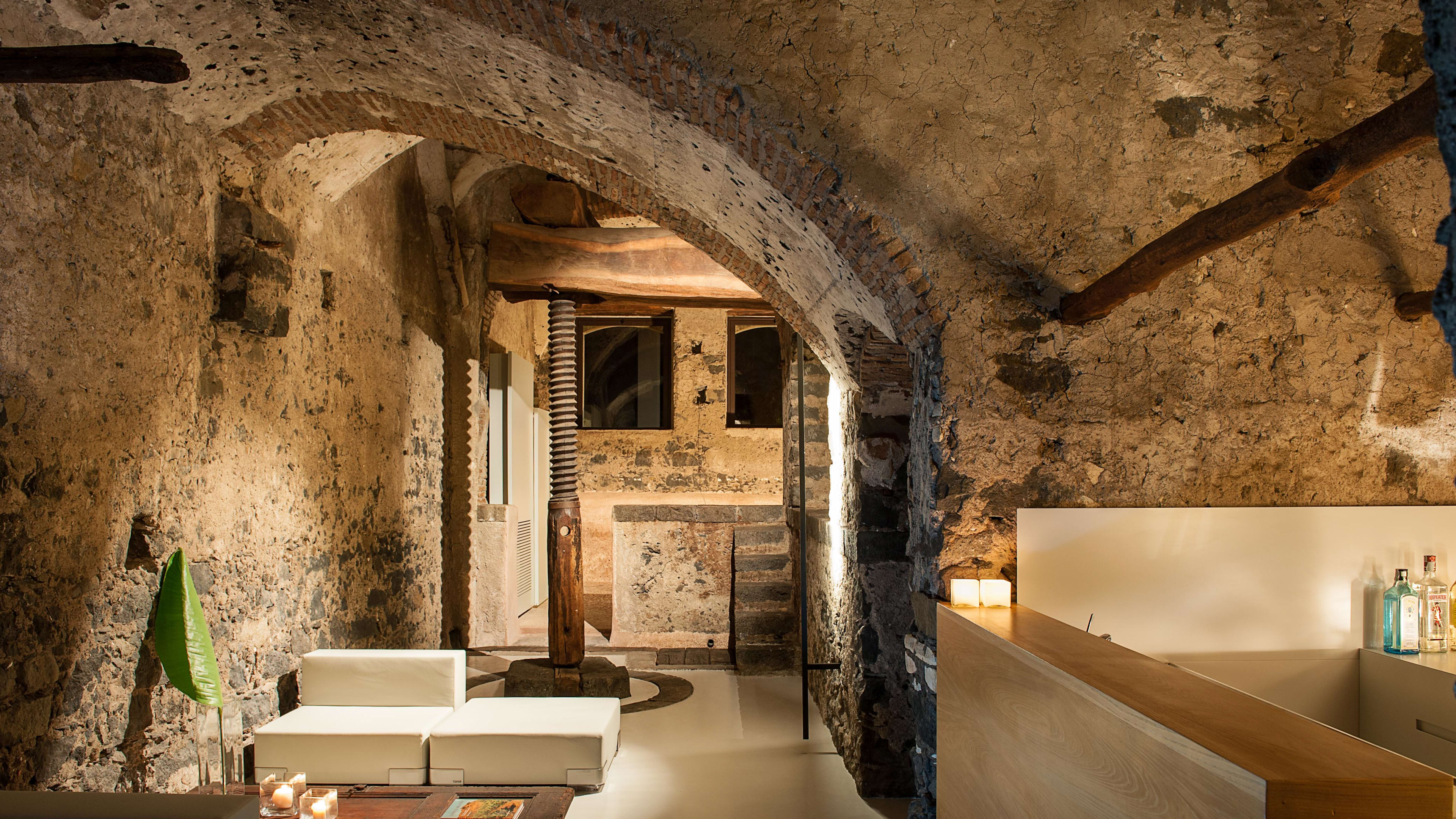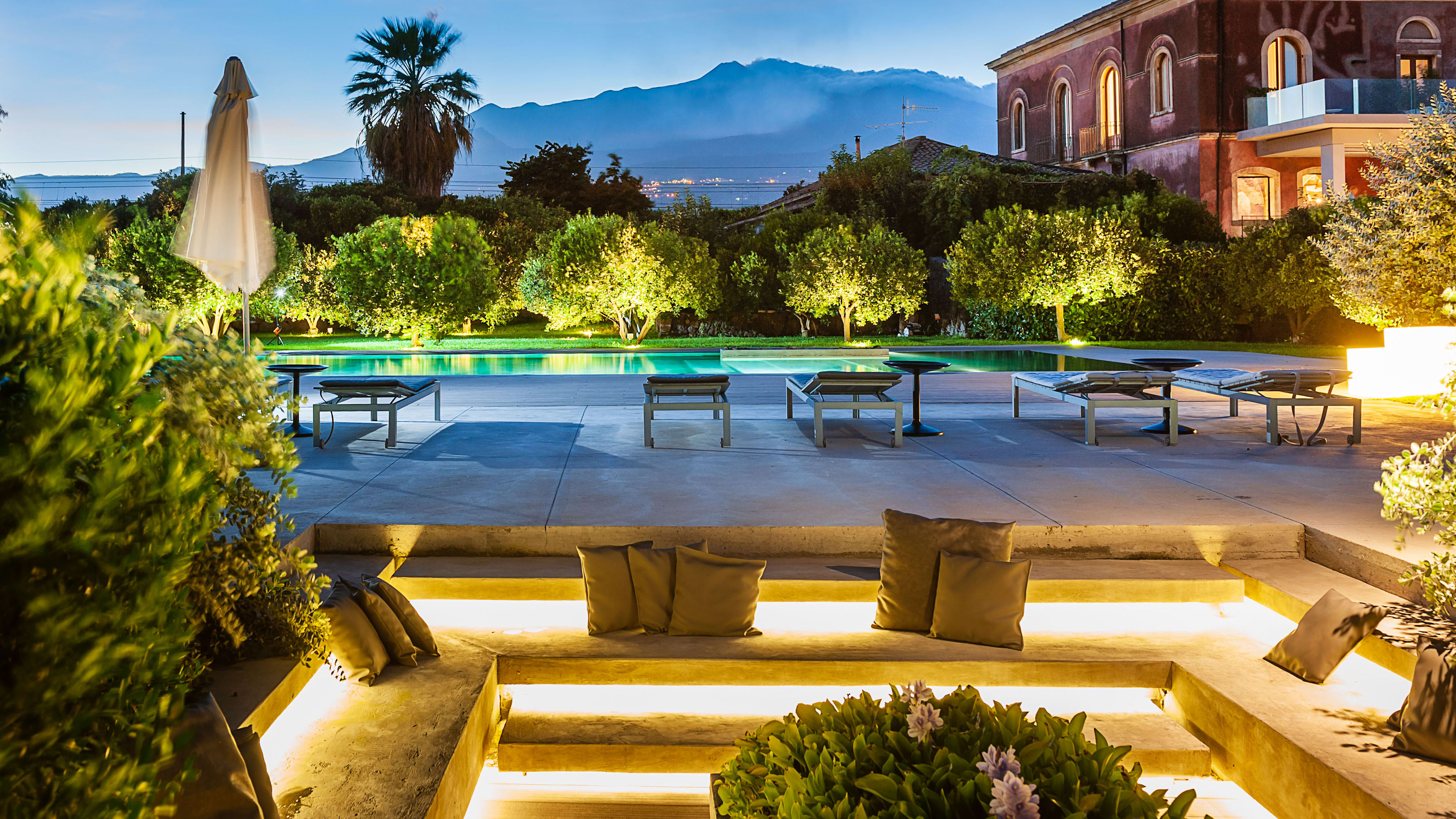 In contrast to the rosy stone of the villa’s exterior, Palmento restaurant (closed on Tuesdays, when a range of gourmet pizzas and light dishes are served instead) with its lava-stone vaults and a wooden wine press so huge you could mistake it for a load-bearing strut, looks like a magical grotto – and indeed feels like one after dark when the candles are lit. But the food casts an even stronger spell than the decor. Chef Giuseppe Raciti has been justly recognised by Michelin for his top-of-the-DOPs tasting menu, which starts strong with a heaving tray of breads, frittura, mortadella-and-pistachio-stuffed savoury cannoli and arancini in homage to the island’s street food, and gradually builds in excitement from there… red prawns come in a bundle of yuzu, wasabi and apple; fall-apart beef cheek is buried under a brush of artichoke crisps; caciocavallo-cheese-stuffed tortelli wallows in a treacle of black cherry and sherry before a mound of truffle is shaved on top; and the signature dish – a poached egg studded with breadcrumbs and floated onto provola cream with a red-fruit undercoating looks a little like a child’s drawing of Hellraiser’s Pinhead, but tastes curiously divine. You’ll be eagerly awaiting each next course or bulbous glass of paired wine, but while you do be sure to chat to the staff, all of whom are ready with an ancestral anecdote about what you’re about to eat – by the time you reach the petit fours, you may know Sicilian agricultural lore better than your own family – and seem genuinely proud of the work they do, they even excitedly tell you if Etna’s erupting so that you can pause your courses to go look for lava. As for lunch – it’s a touch less theatrical, with a delicious edit of simple yet delicious salads, toasties and light pastas, served overlooking the garden.