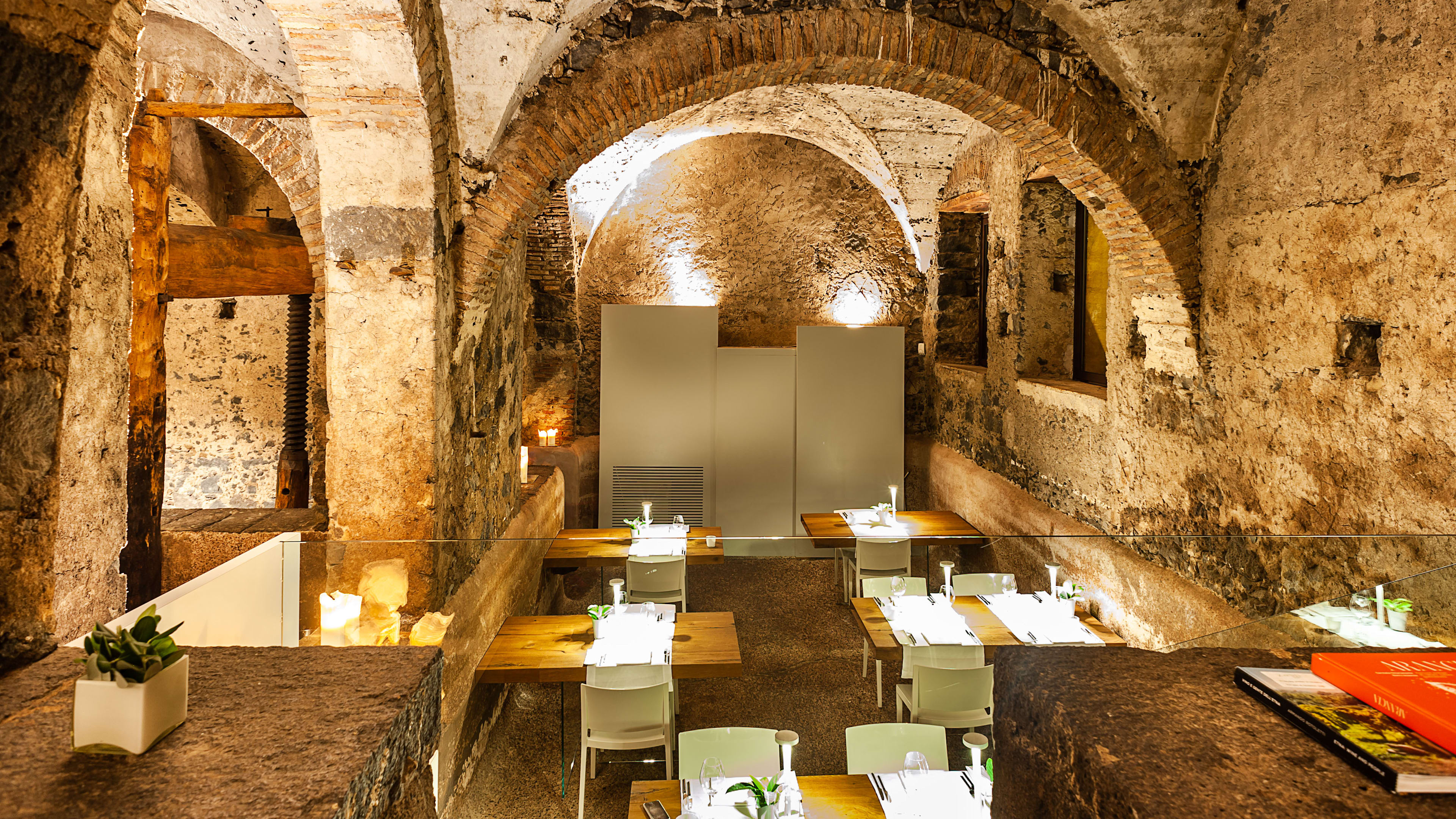 The private dining area in the restaurant is under the enormous wooden plate of the centuries-old wine press (don’t worry, it’s inactive) that dominates the lavastone room where winemakers used to ready the next crop of drinkables.