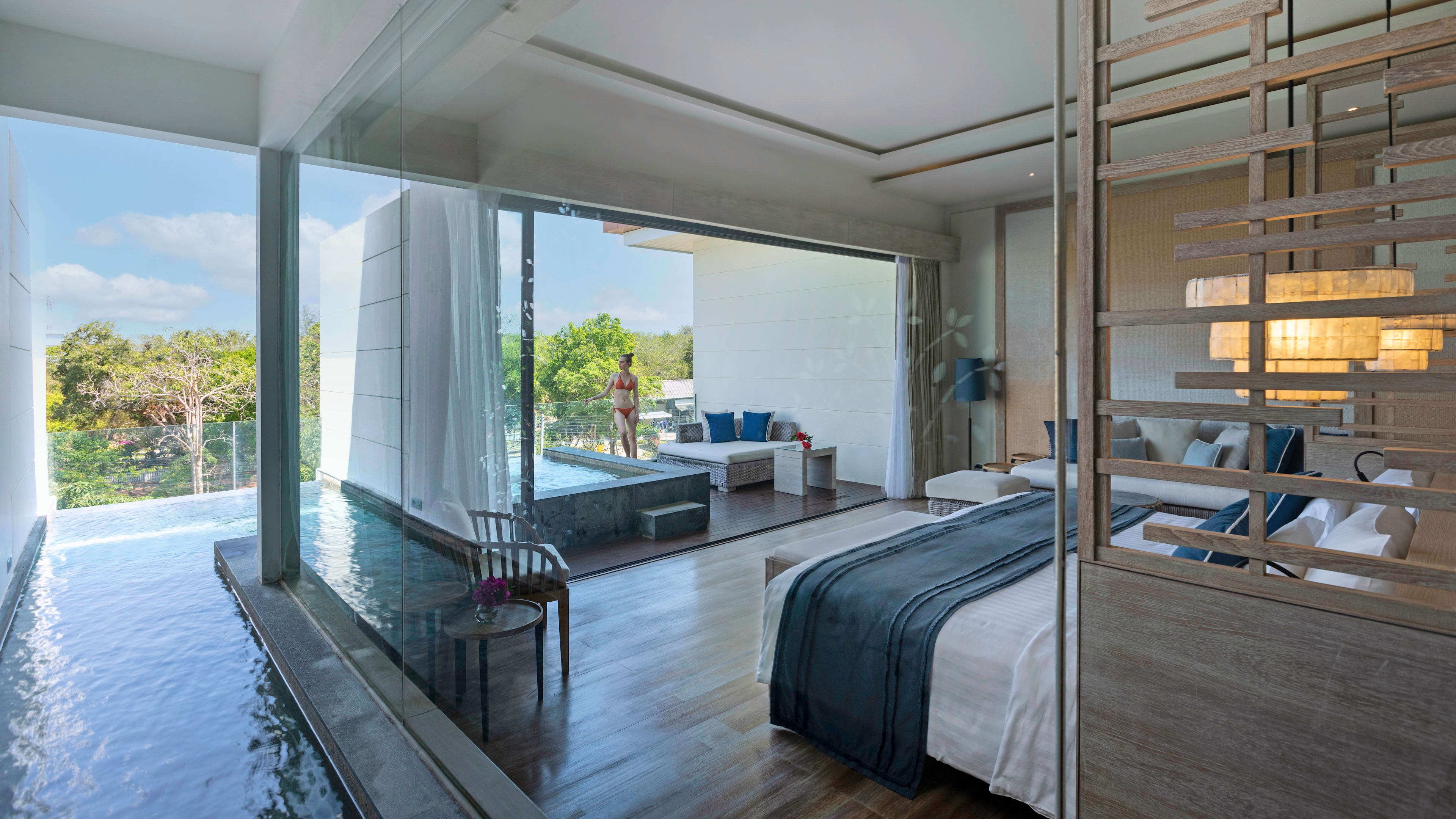 There’s a suite for everyone at Cape Nidhra: all are sleek and contemporary in style with a private plunge pool and views over the grounds, starting with Sky Pool Suites. Deluxe Sky Pool Suites come with a ‘swimway’ between bathroom and pool; ground-level Garden Pool Suites have less natural light, but more space for families and the biggest pools of all; Moonlight Pool Suites are duplex with an upstairs sun terrace, and crowning the bunch is the Nidhrarom Suite, set over two floors, and the only suite with a sea view. A Family Pool Suite, with two of everything, is your multi-bedroom option.