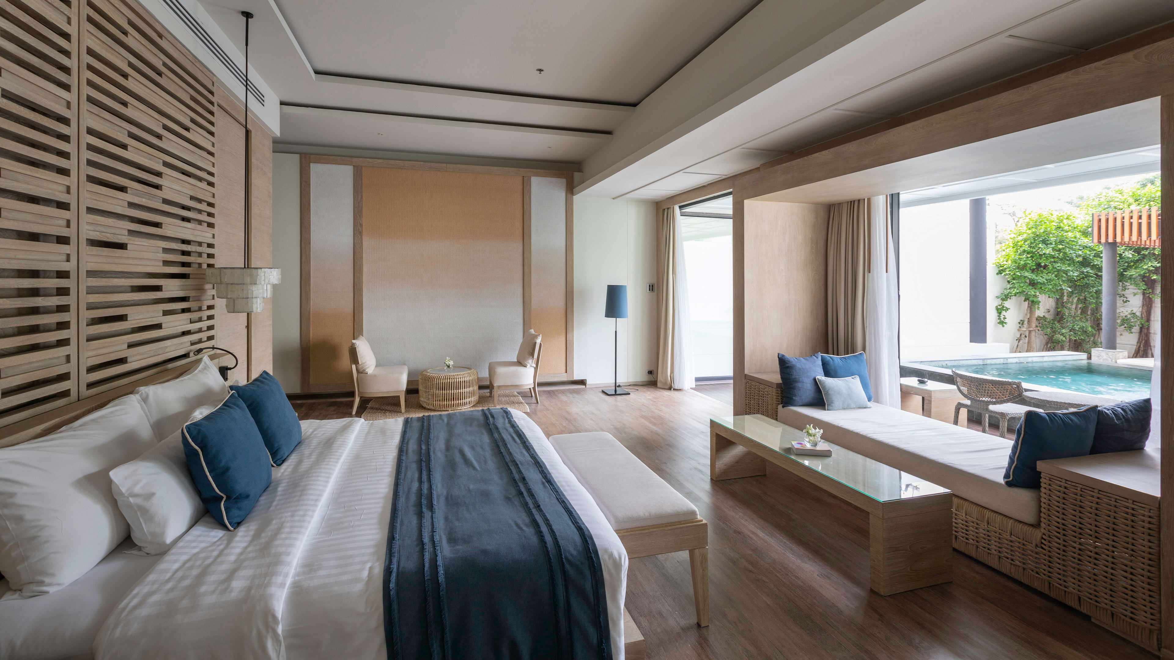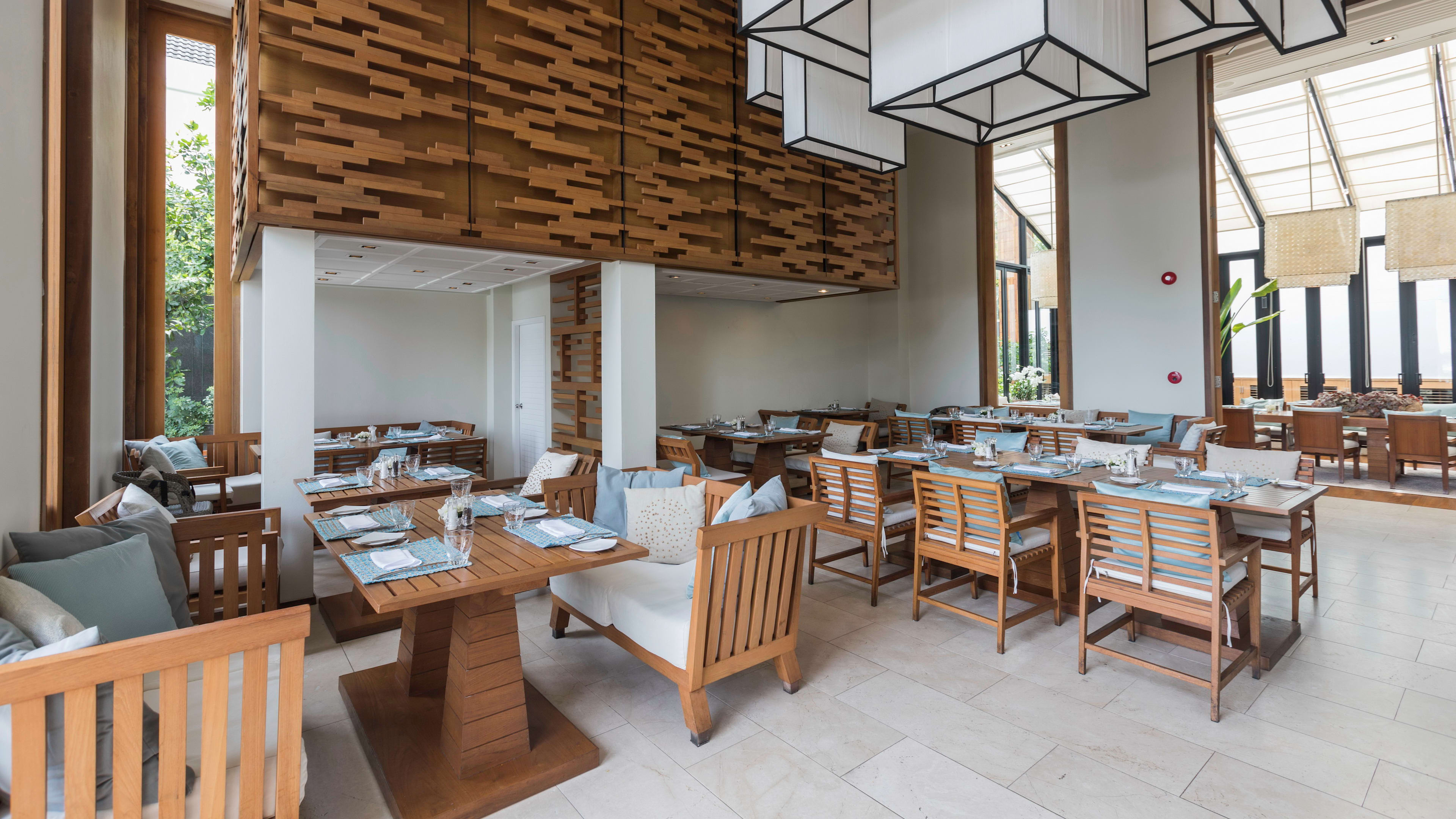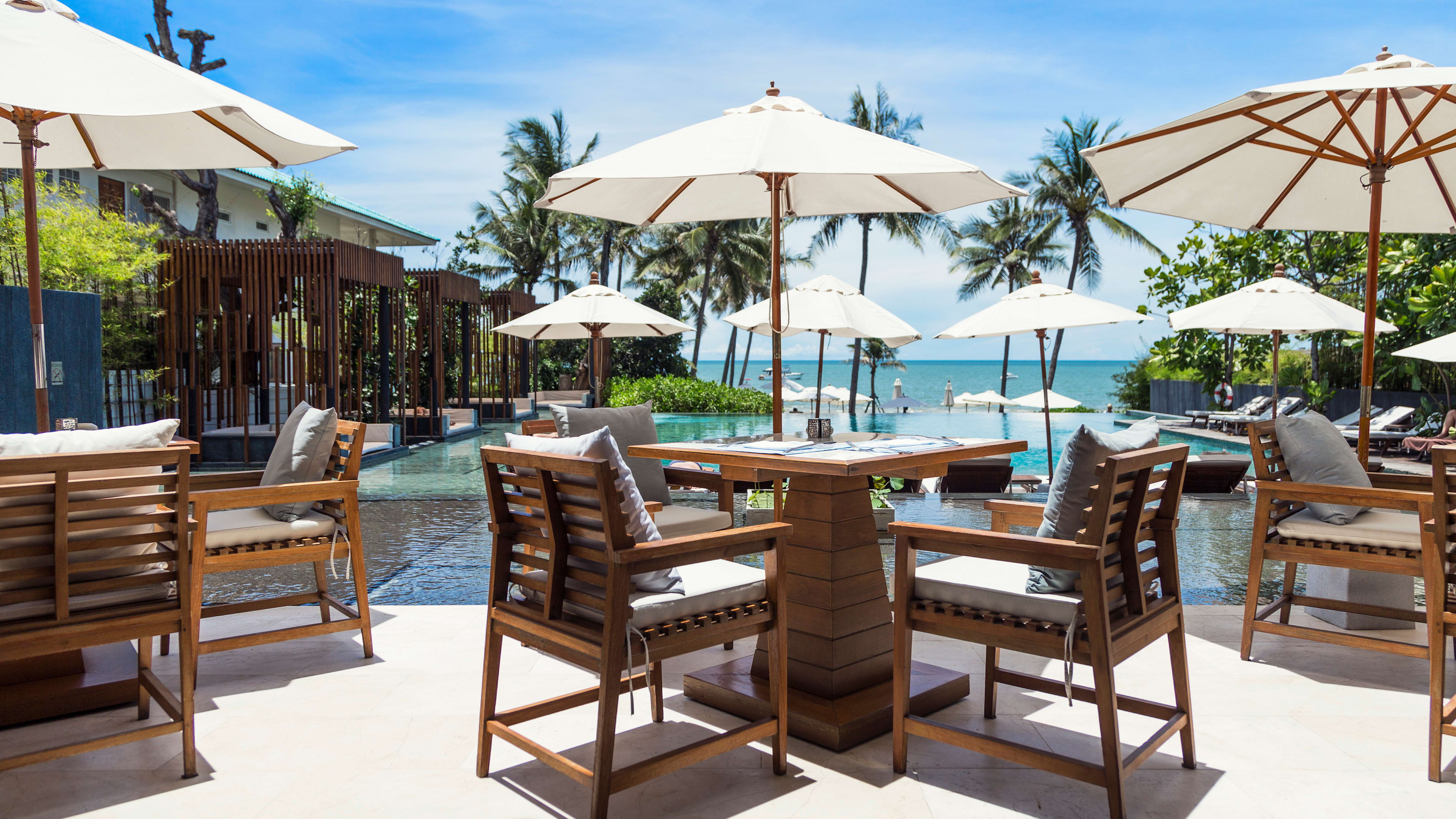 Rocks is the hotel’s all-day restaurant, serving breakfast, lunch and dinner in a smartly appointed, high-ceilinged dining room of polished wood, oversized pendant lanterns, and sea-hued upholstery. As well as the main restaurant, tables extend into a conservatory-style annexe, and outdoors to tables beside the pool. Breakfast is a buffet affair of hot and cold plates, both sweet and savoury. For lunch and dinner, a seasonal menu focuses on Thai cuisine with a few Western comforts thrown in, and an emphasis on seafood; the fish (whatever’s fresh) is recommended, and occasionally the hotel hosts dining events such as barbecue nights. If you’ve an appetite for dining à deux soundtracked by the lapping ocean waves, staff can arrange a private dinner on the sand under a romantically draped timber-frame (book at least 24 hours ahead).