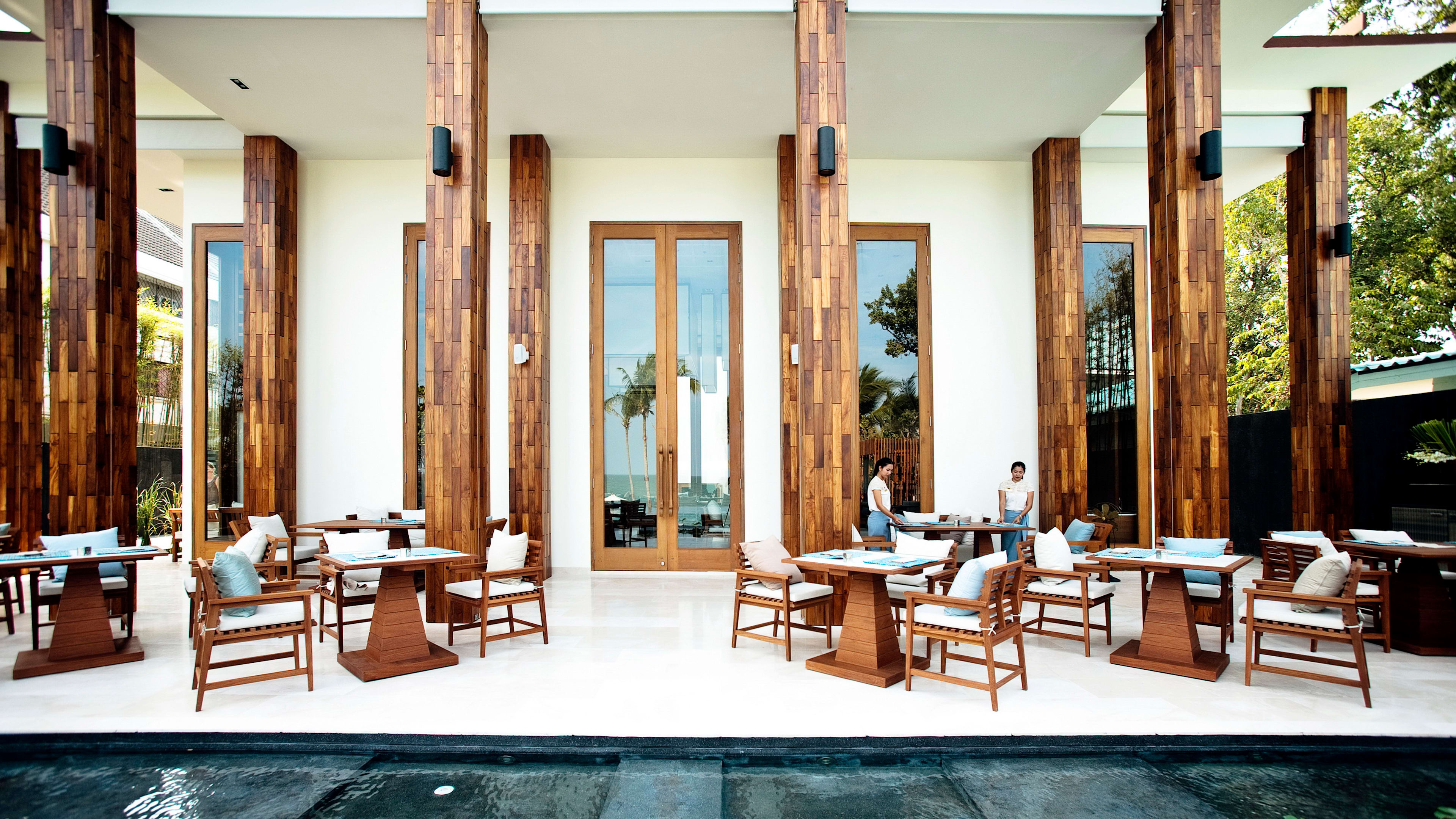 On the terrace, poolside tables come with ocean views, but we also love the tables in the light-filled, glass-sided annexe.