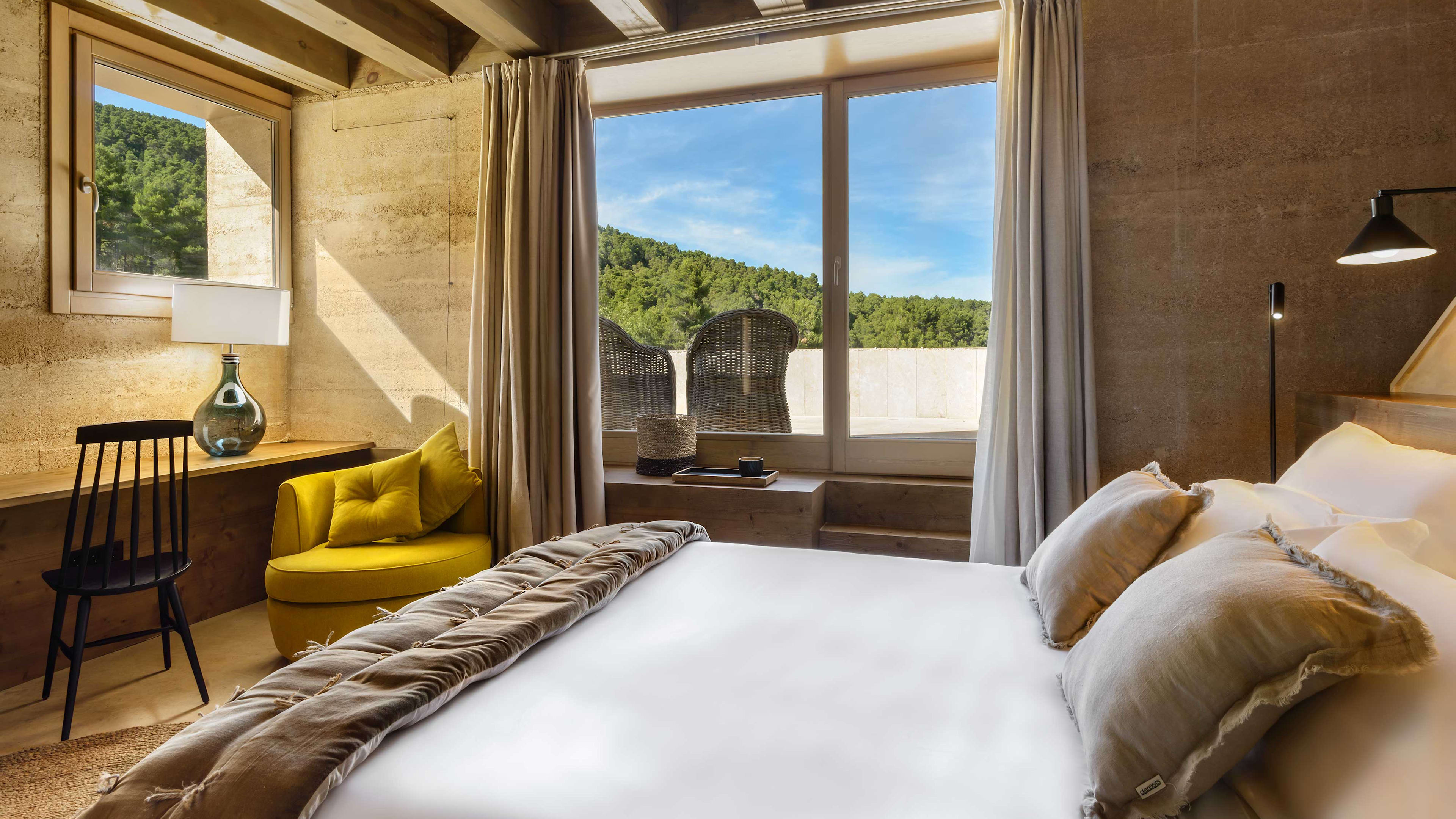 It doesn’t get much more off-grid than the Torre del Marqués Hotel Spa & Winery, a restored 18th-century farmhouse in the remote forested peaks and valleys of Spain’s north-eastern Matarraña region, lost somewhere between the Sistema Ibérico’s rugged ranges to the west and the sun-soaked Costas in the east. It’s a modern building, but beamed ceilings and exposed stonework hint at the region’s past (think Don Quixote meets Hans Christian Andersen). And if it’s switched-off solitude you crave, you’ll find it here – a place to wile away hours by the lawn-lined pool, and where views across vineyards and olive groves inspire wine- and oil-tasting trips with local artisans. Or, perhaps less strenuously, a vigorous pummelling in the spa.