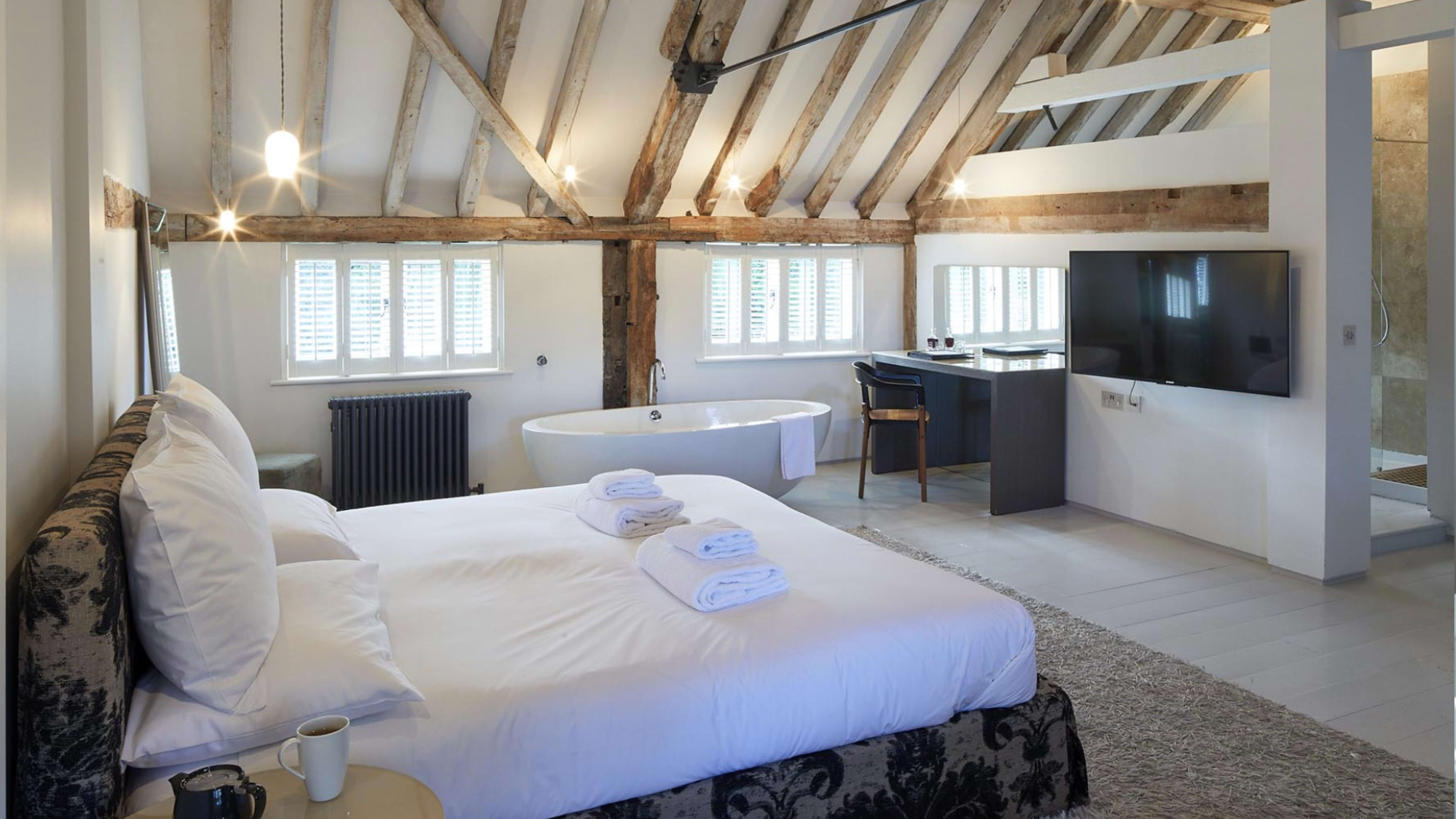 This 17th-century Suffolk abode is a converted water mill in 12 acres of land, enhanced with a sleek, minimalist restaurant and super-stylish boudoirs with high-spec Starck-fitted ensuites. Tuddenham Mill is somewhere to while away a lazy sunny afternoon playing boules by a swan-studded pond, or cosied up on hand-picked statement furniture in a spacious lounge bar under original exposed beams.