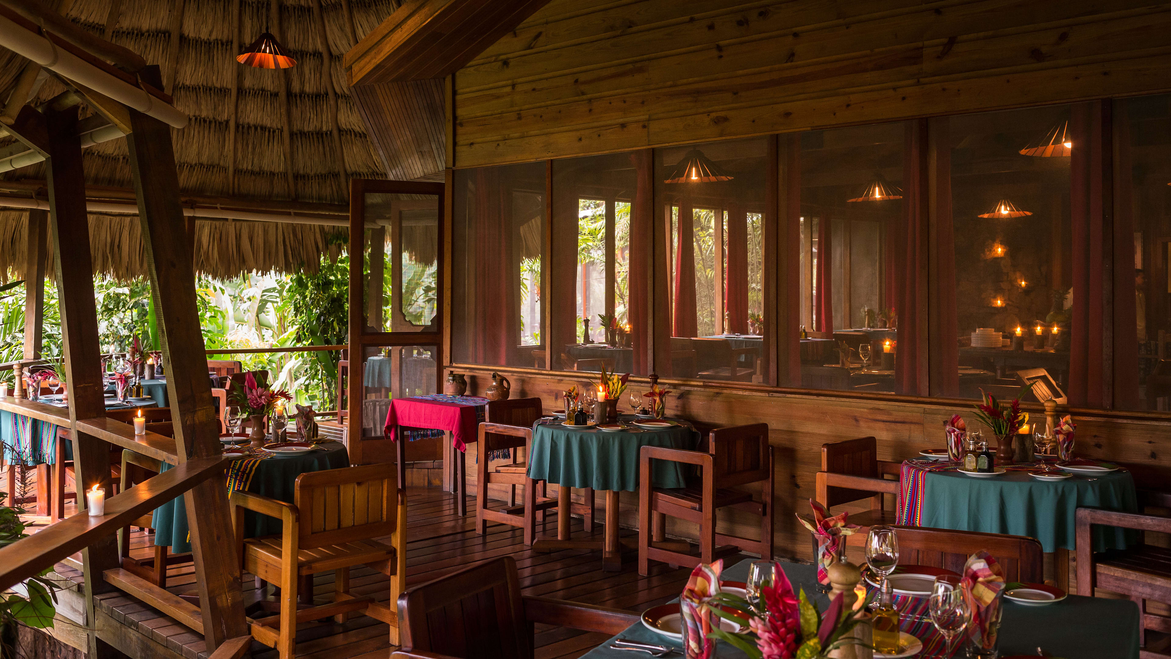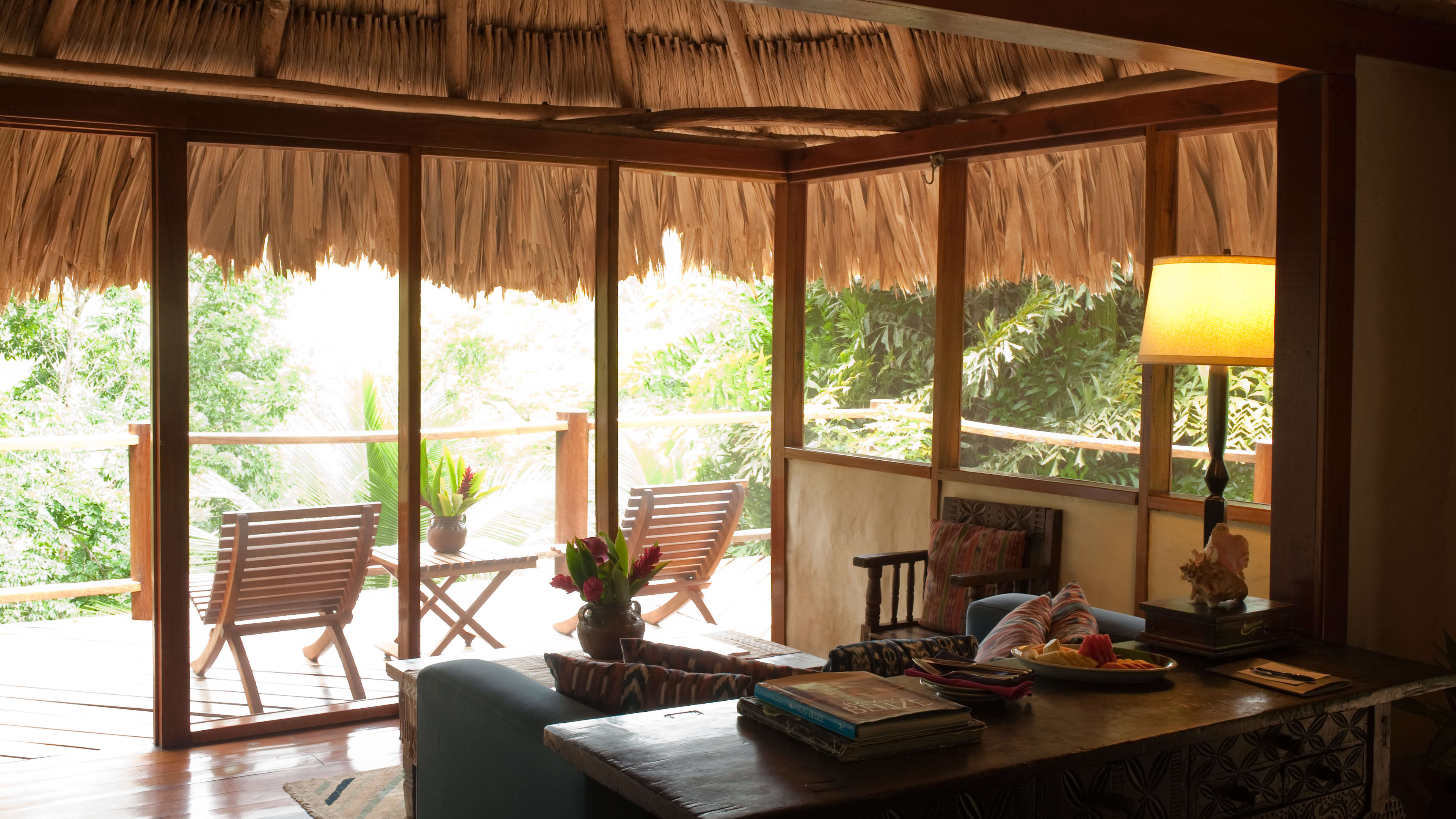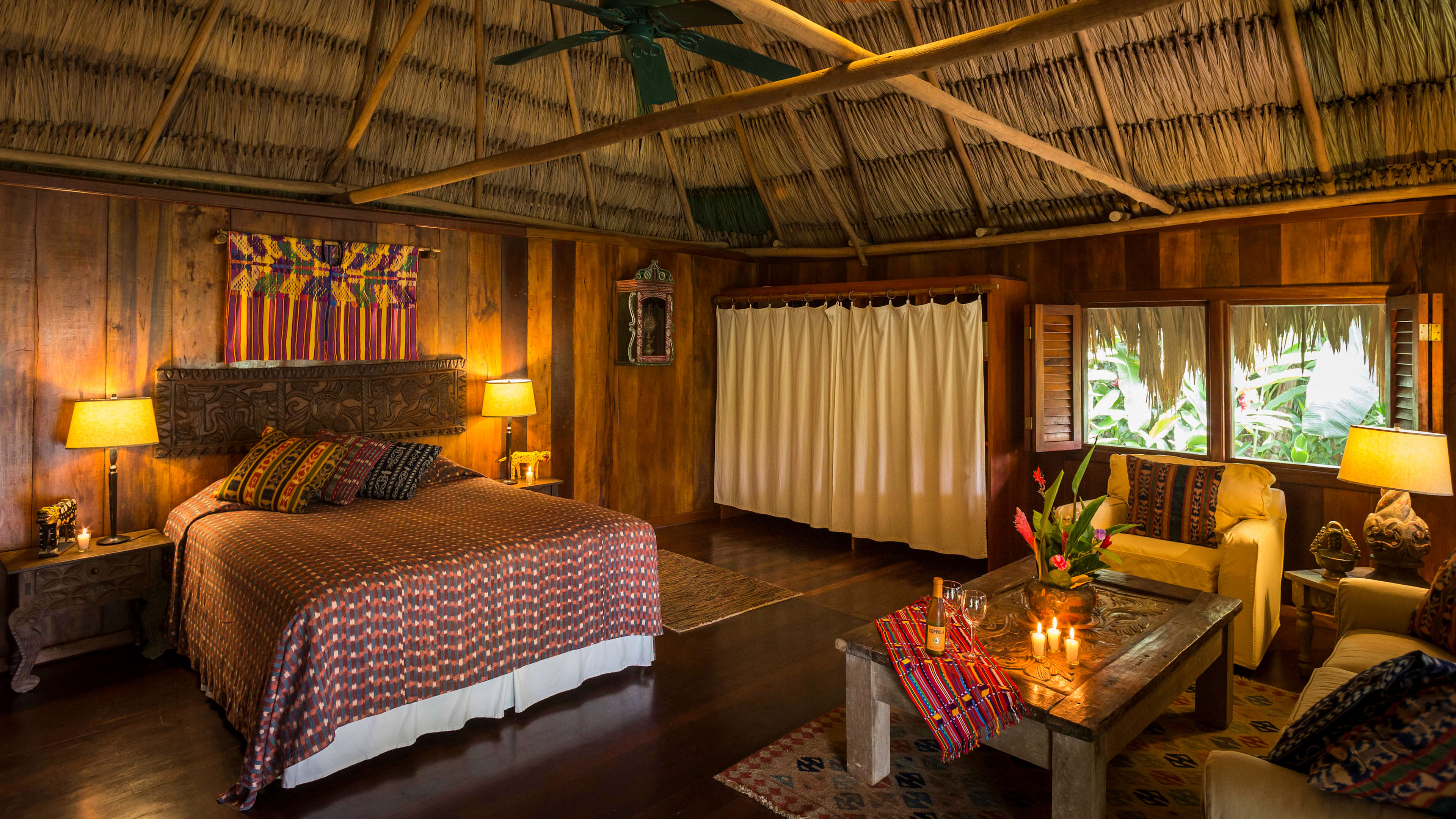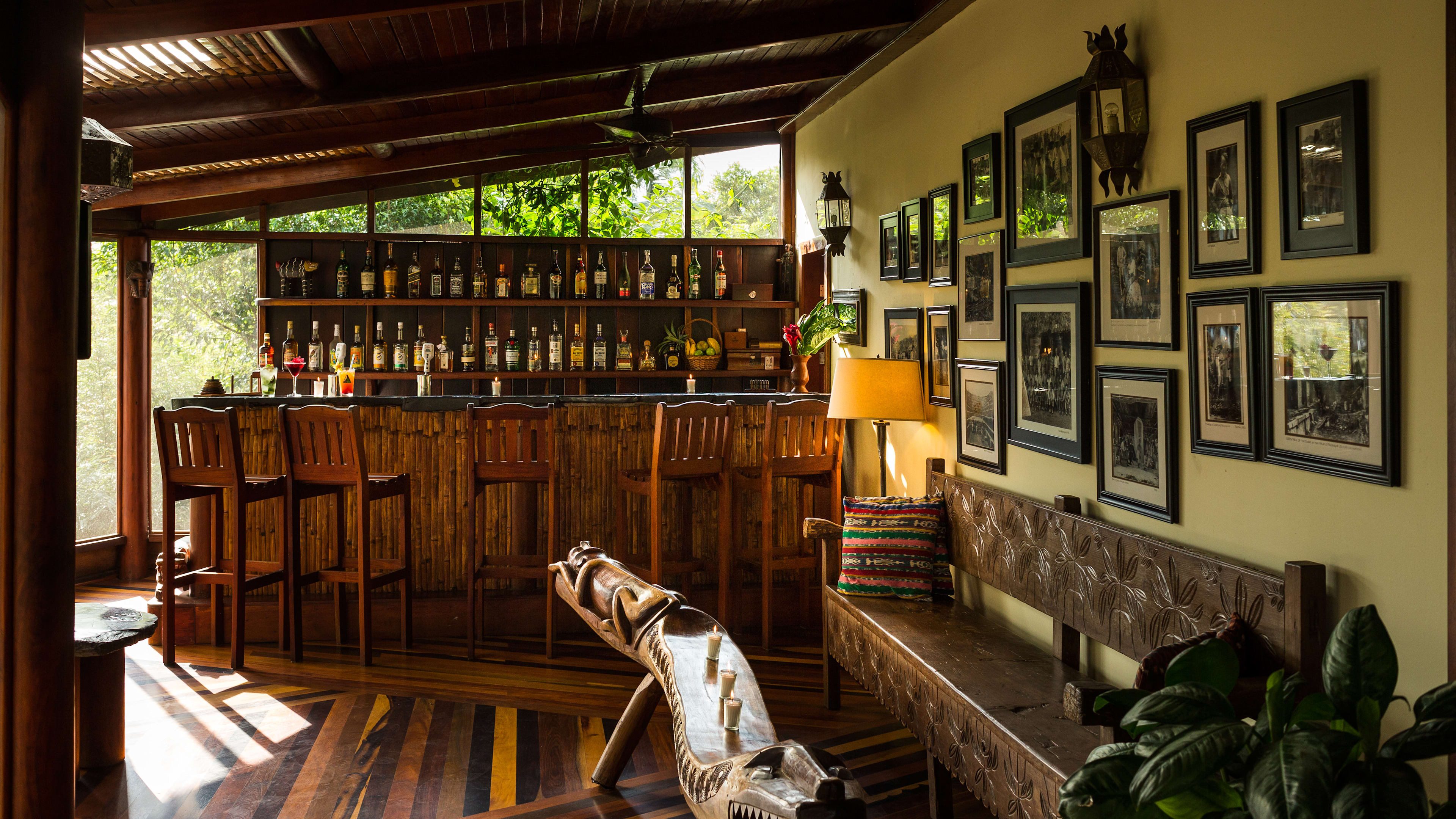 The ceiling fans in the Jaguar Bar are souvenirs from Apocalypse Now, and the hand-carved bar counter is decorated with glyphs of Mayan gods. Throughout the day, hummingbirds feed on the tropical flowers while guests sup hibiscus daiquiris.