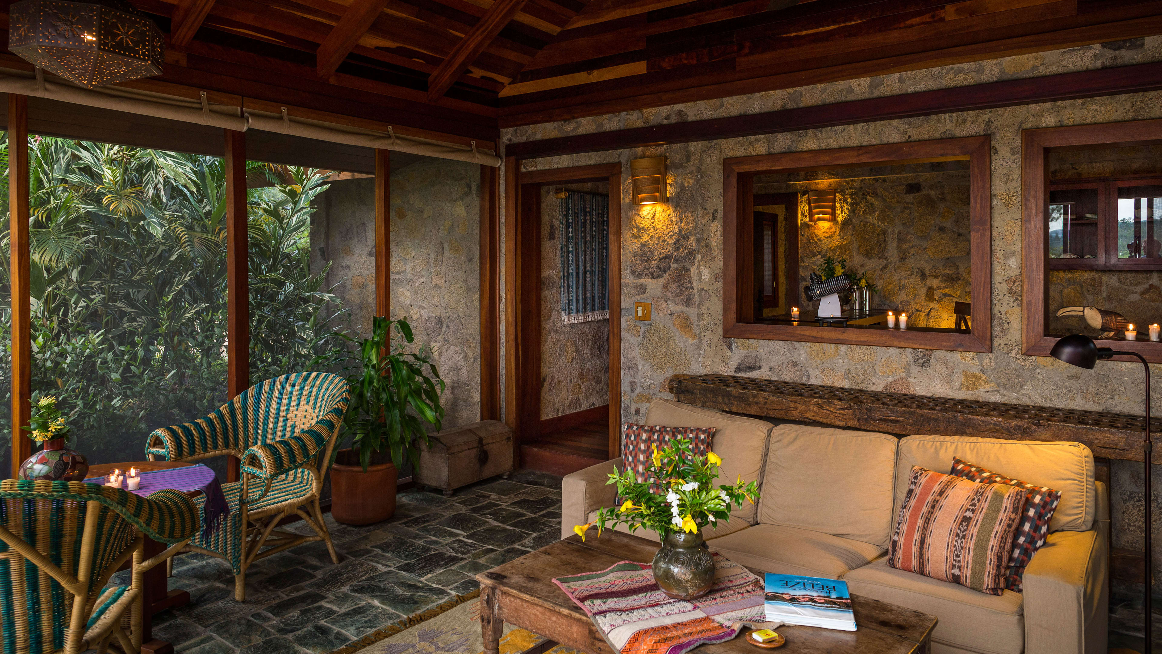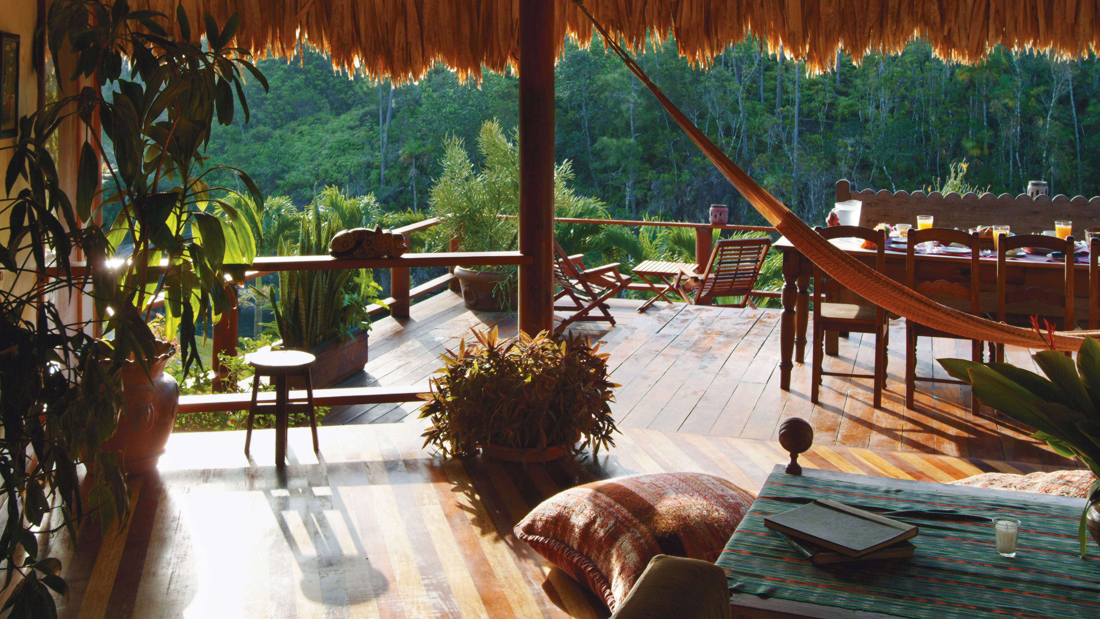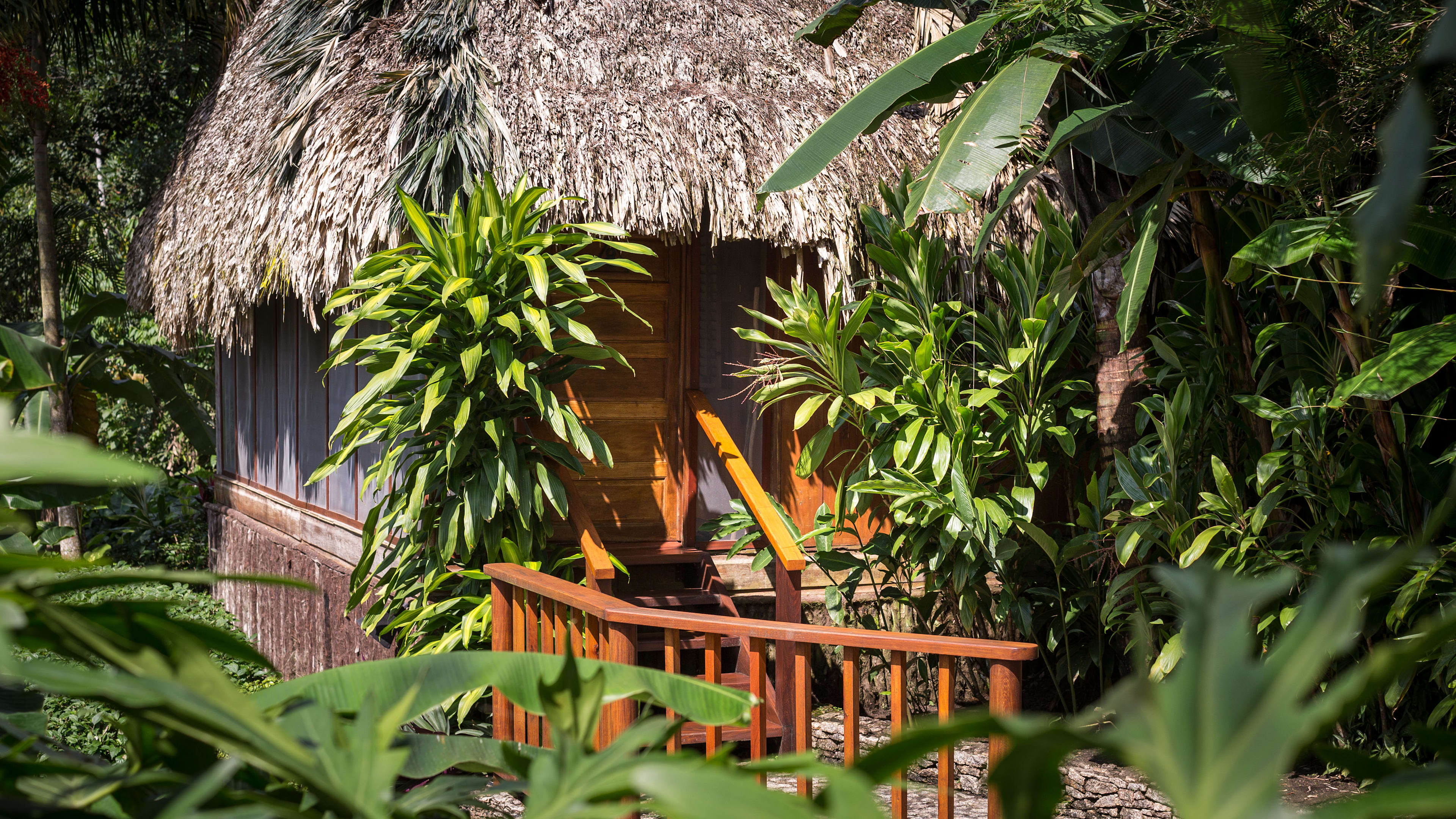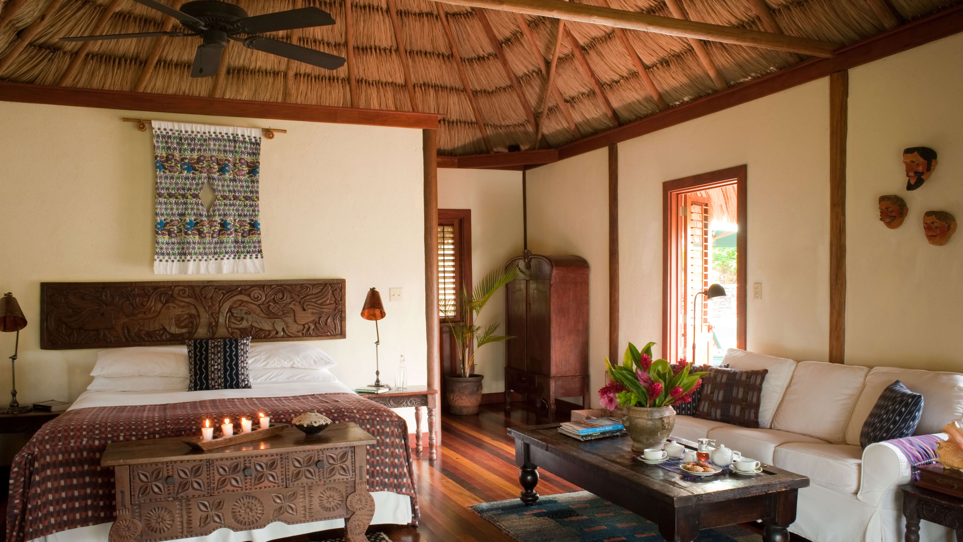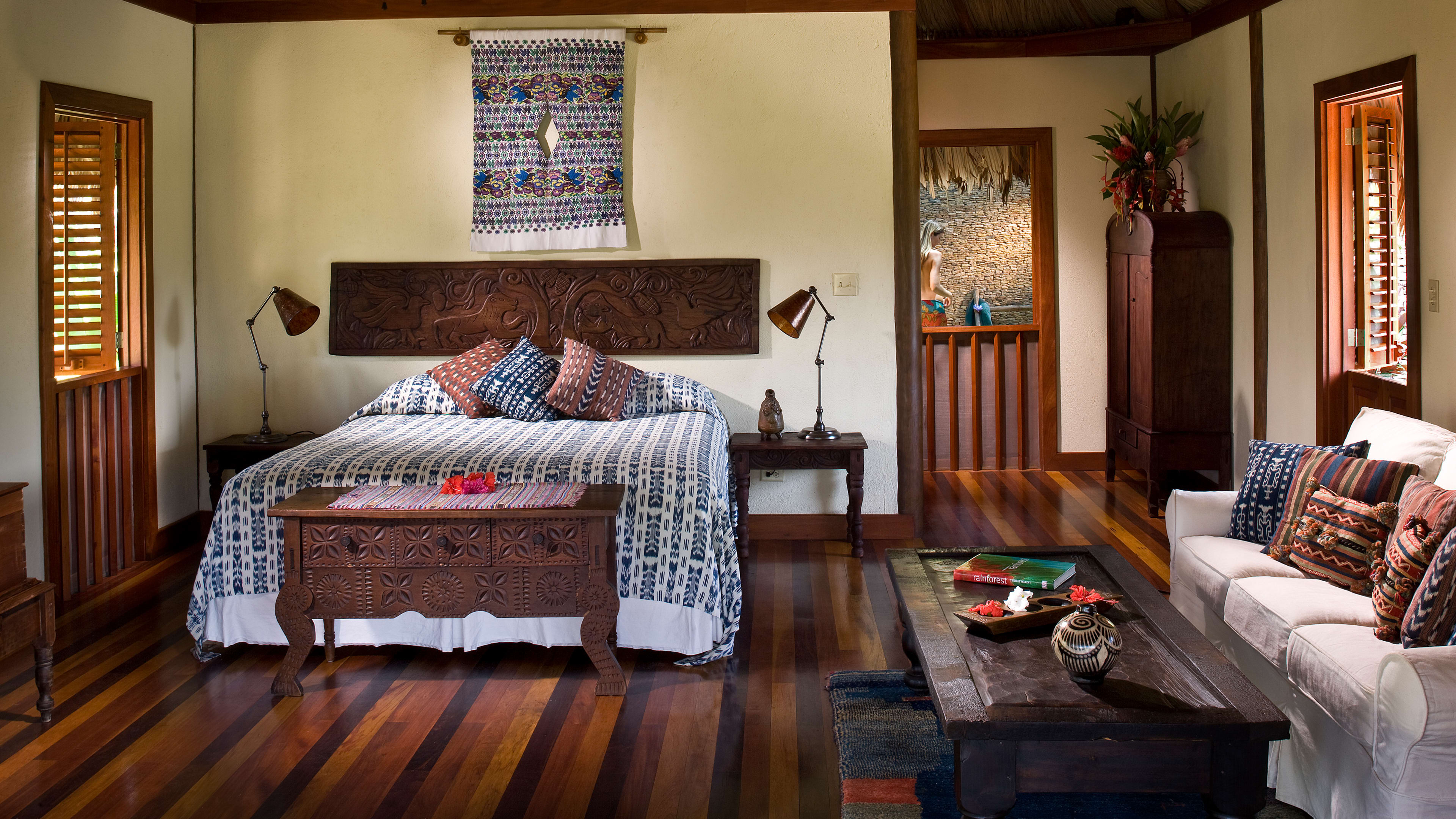 The ceiling fans in the Jaguar Bar are souvenirs from Apocalypse Now, and the hand-carved bar counter is decorated with glyphs of Mayan gods. Throughout the day, hummingbirds feed on the tropical flowers while guests sup hibiscus daiquiris.