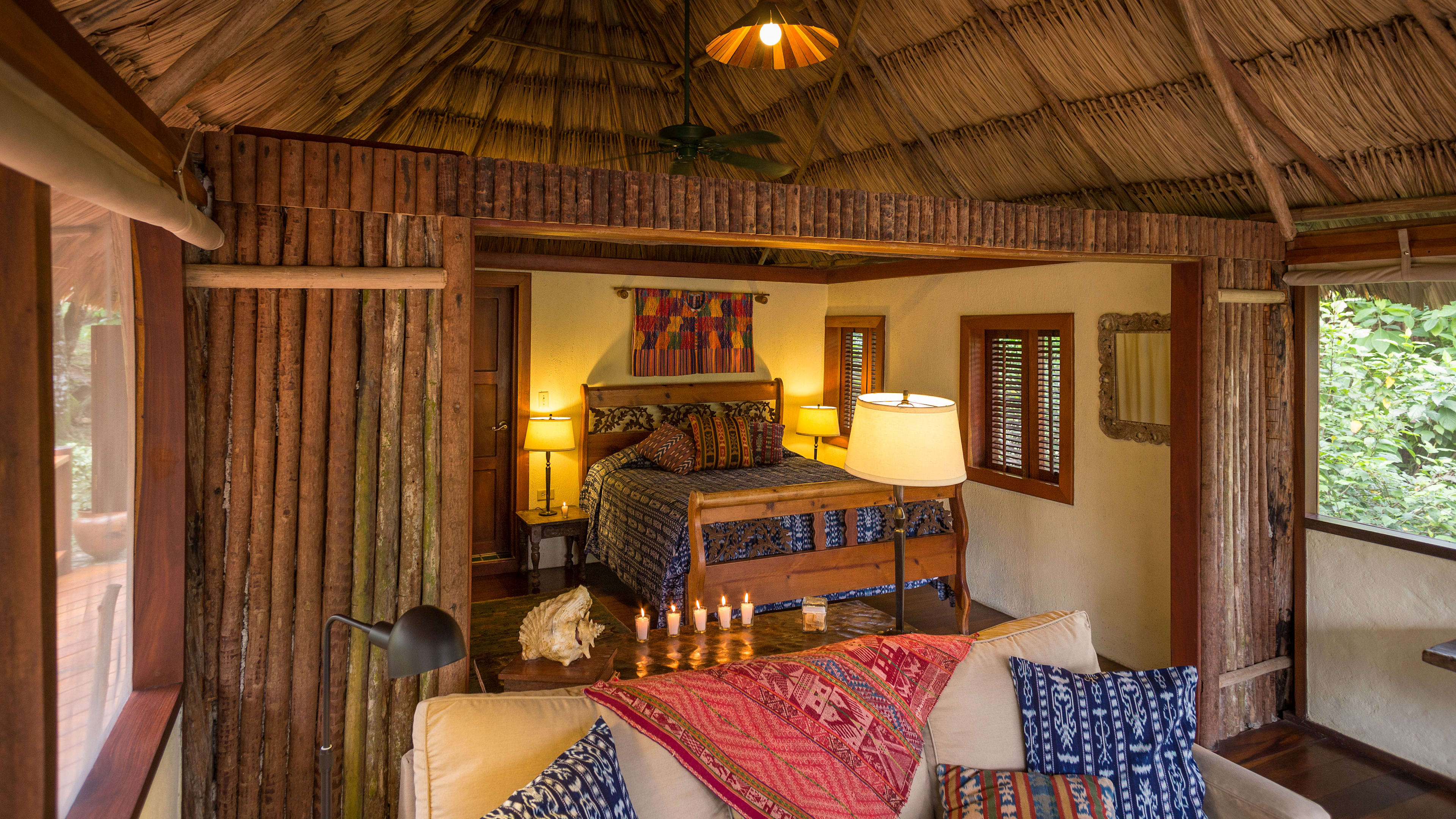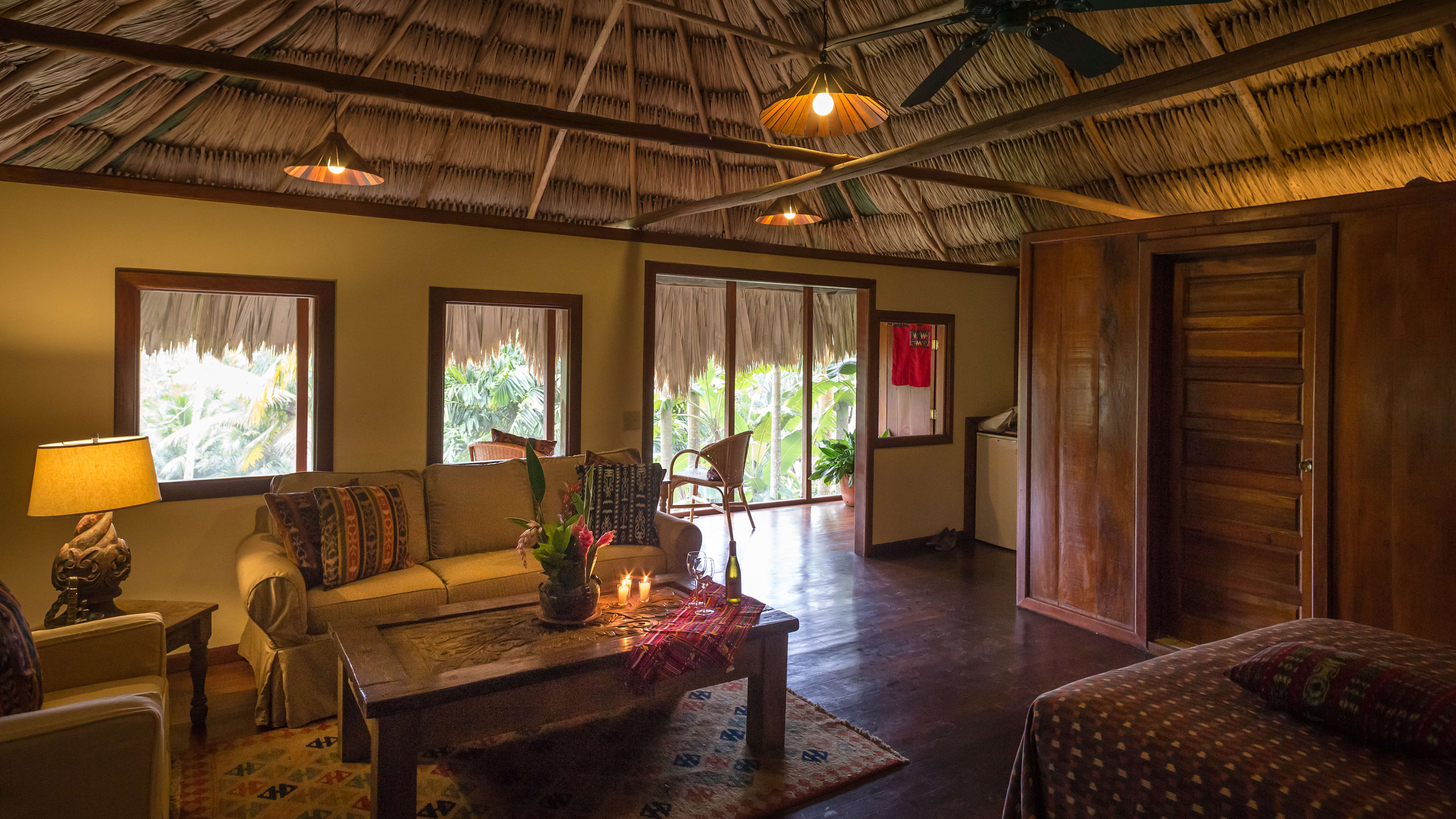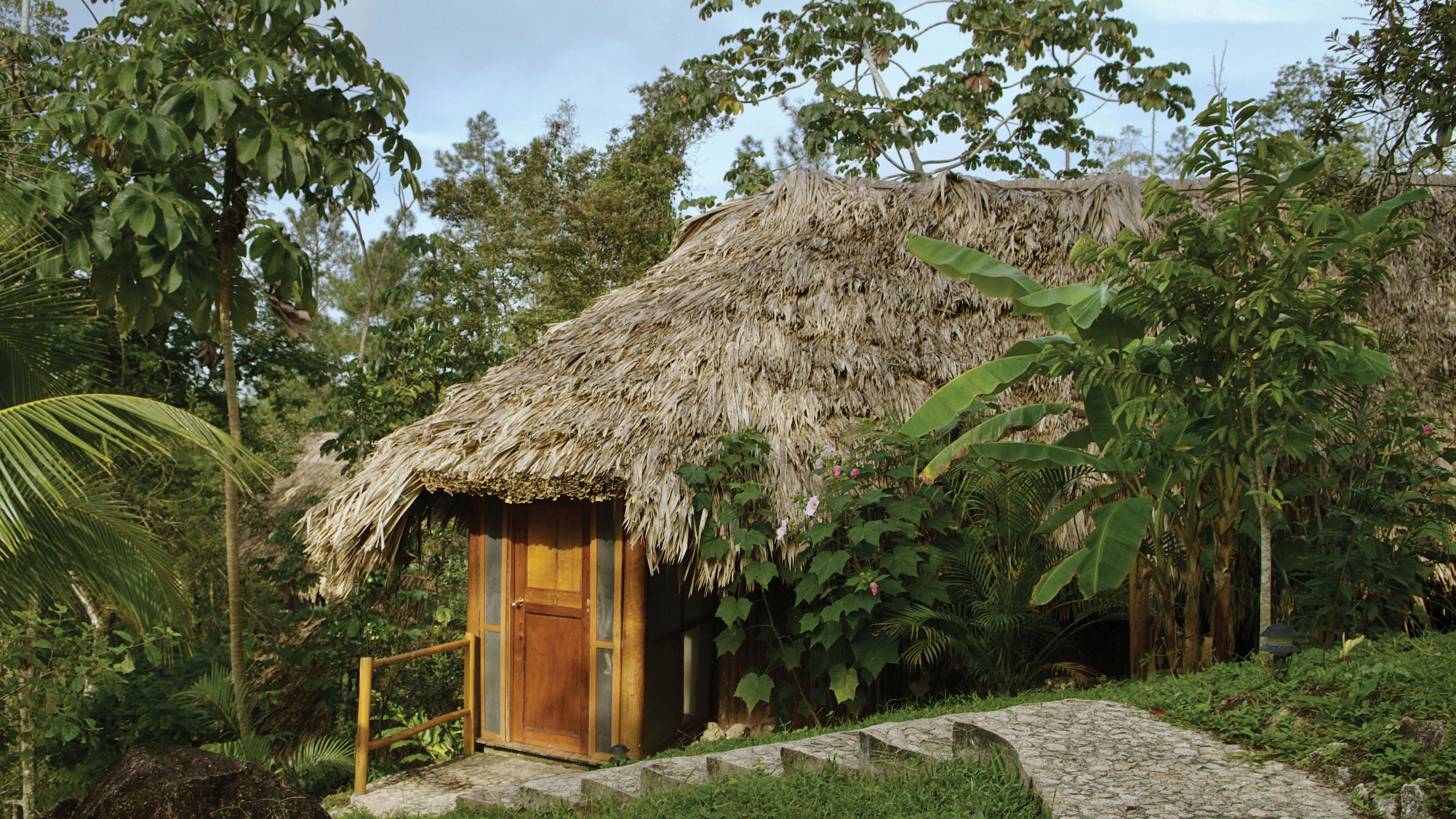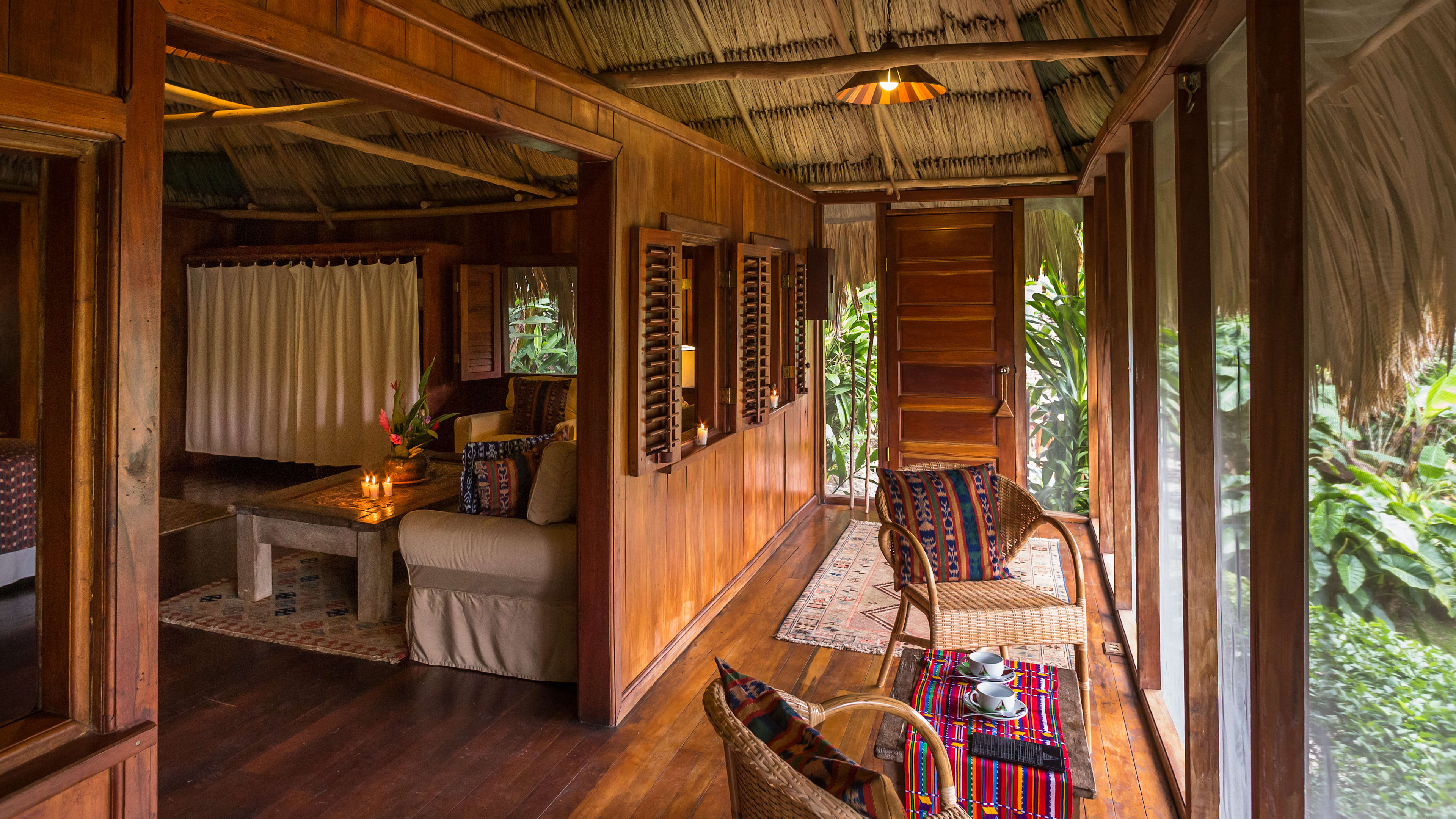 The ceiling fans in the Jaguar Bar are souvenirs from Apocalypse Now, and the hand-carved bar counter is decorated with glyphs of Mayan gods. Throughout the day, hummingbirds feed on the tropical flowers while guests sup hibiscus daiquiris.
