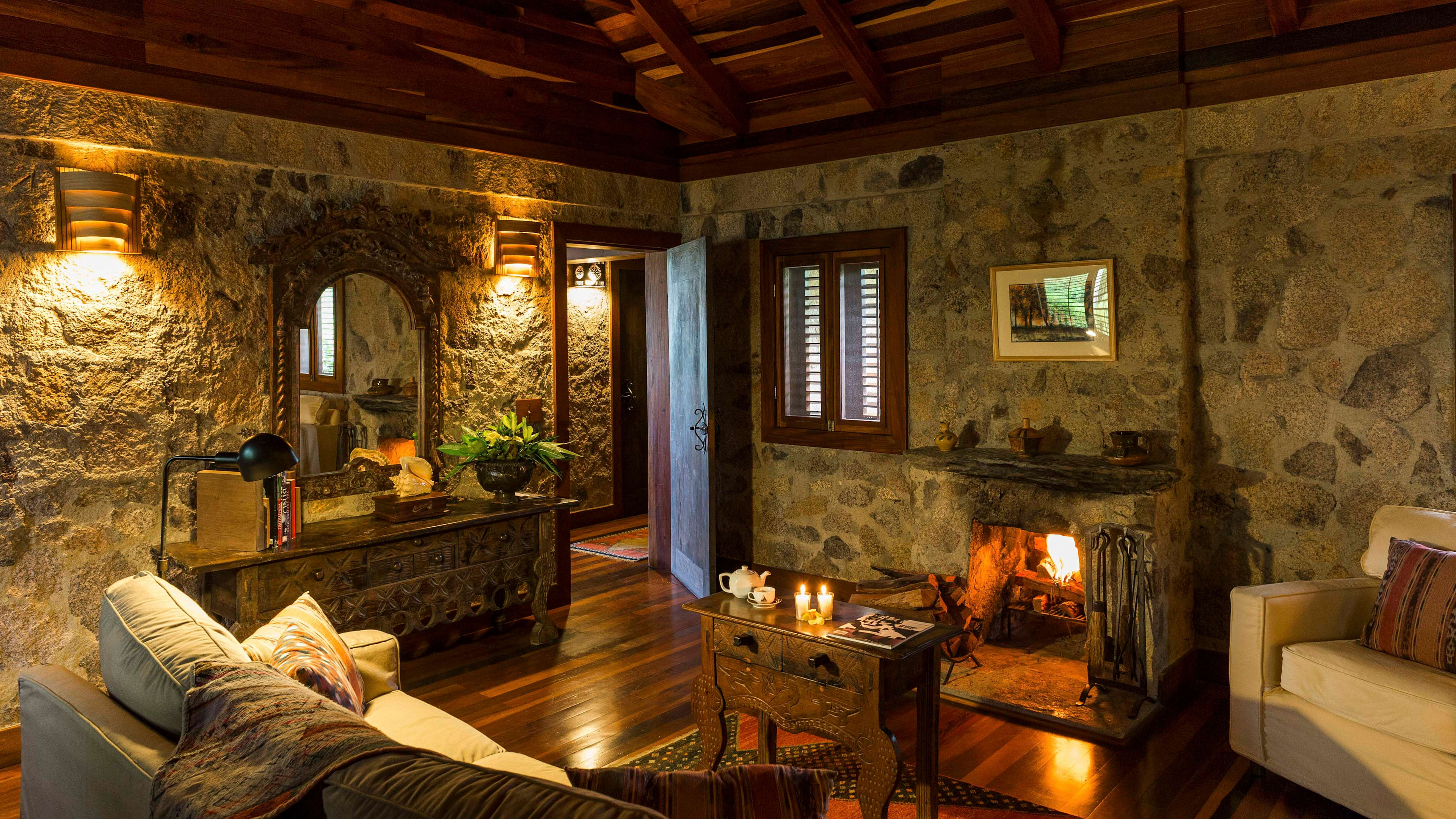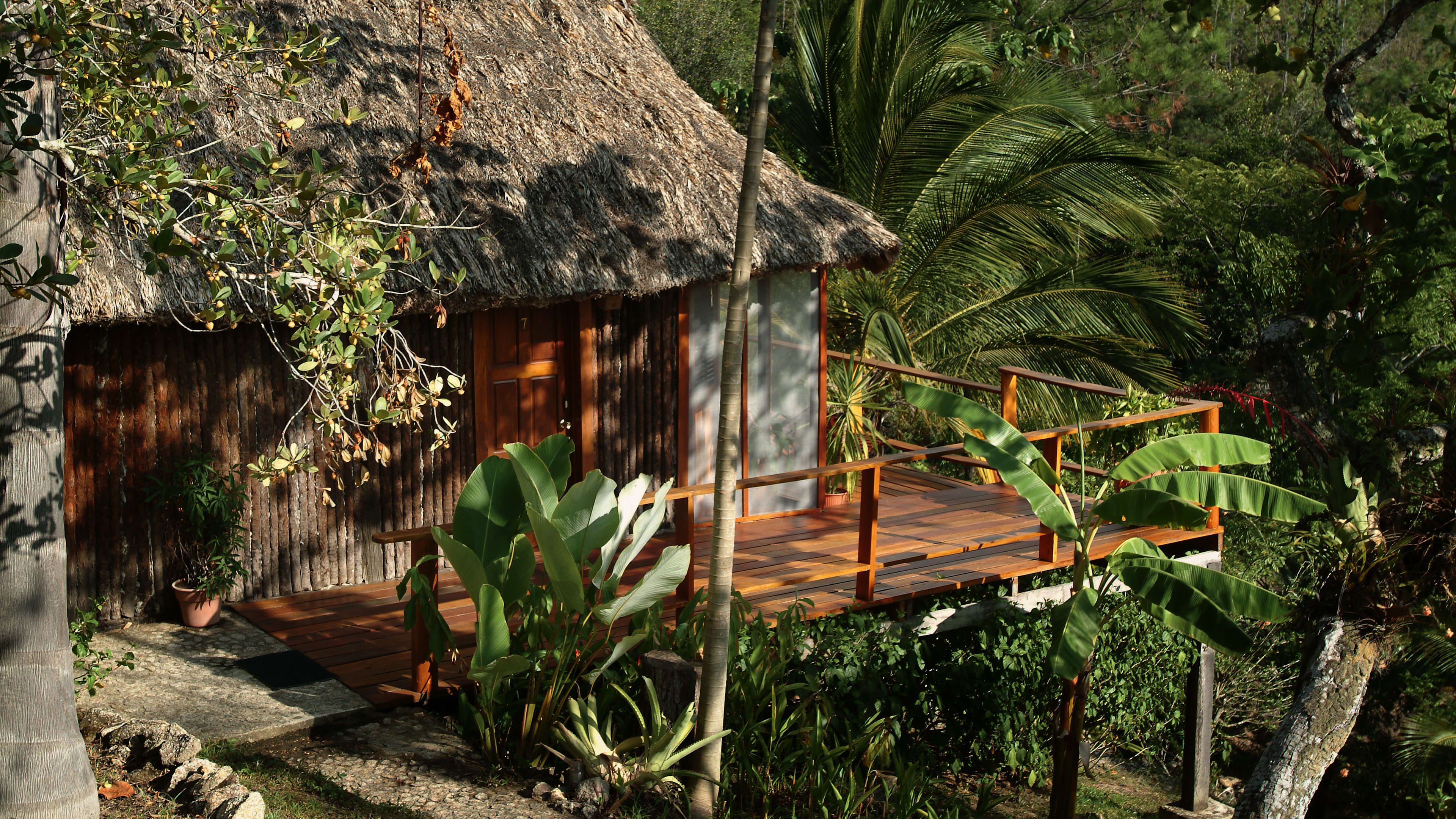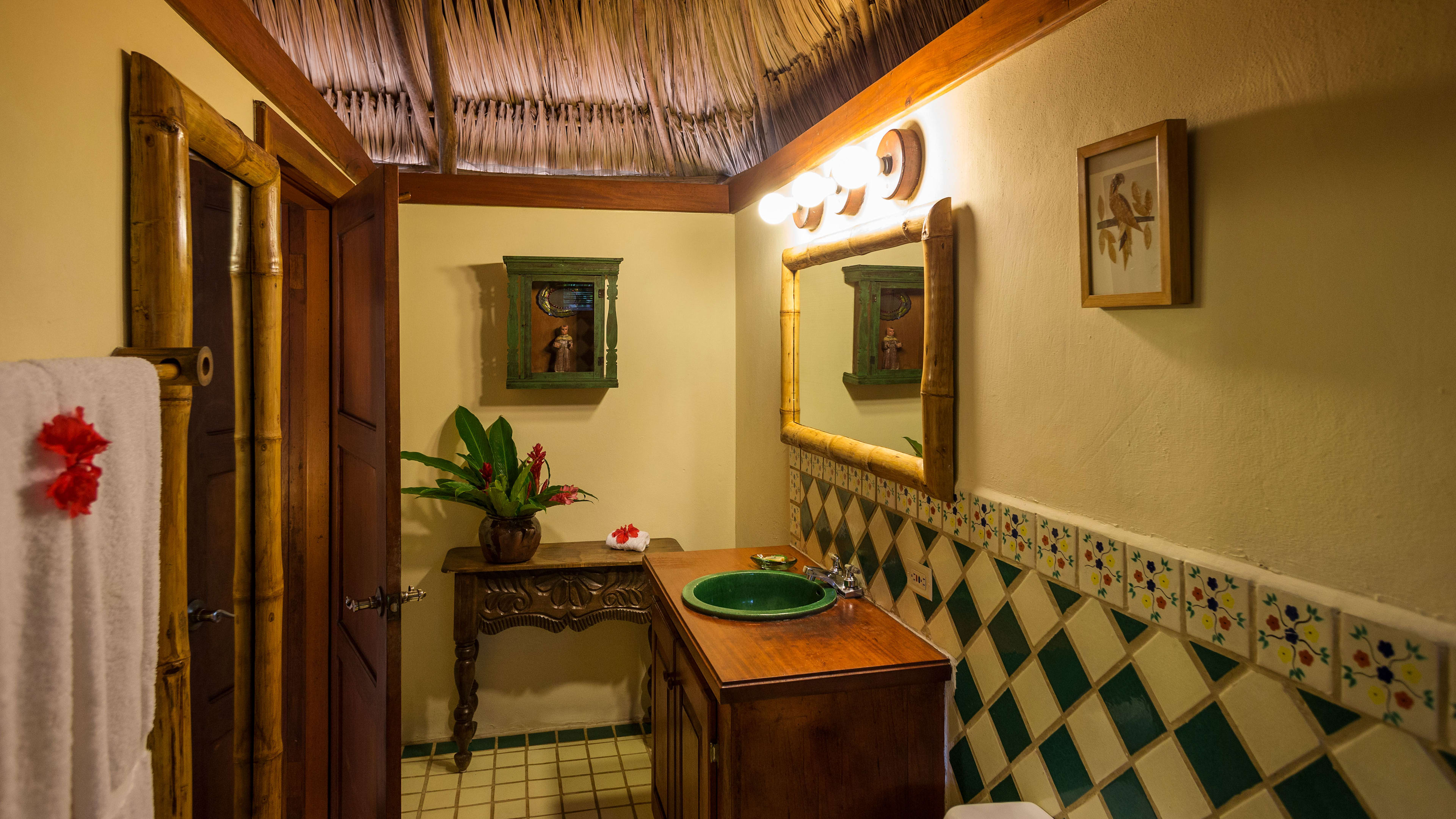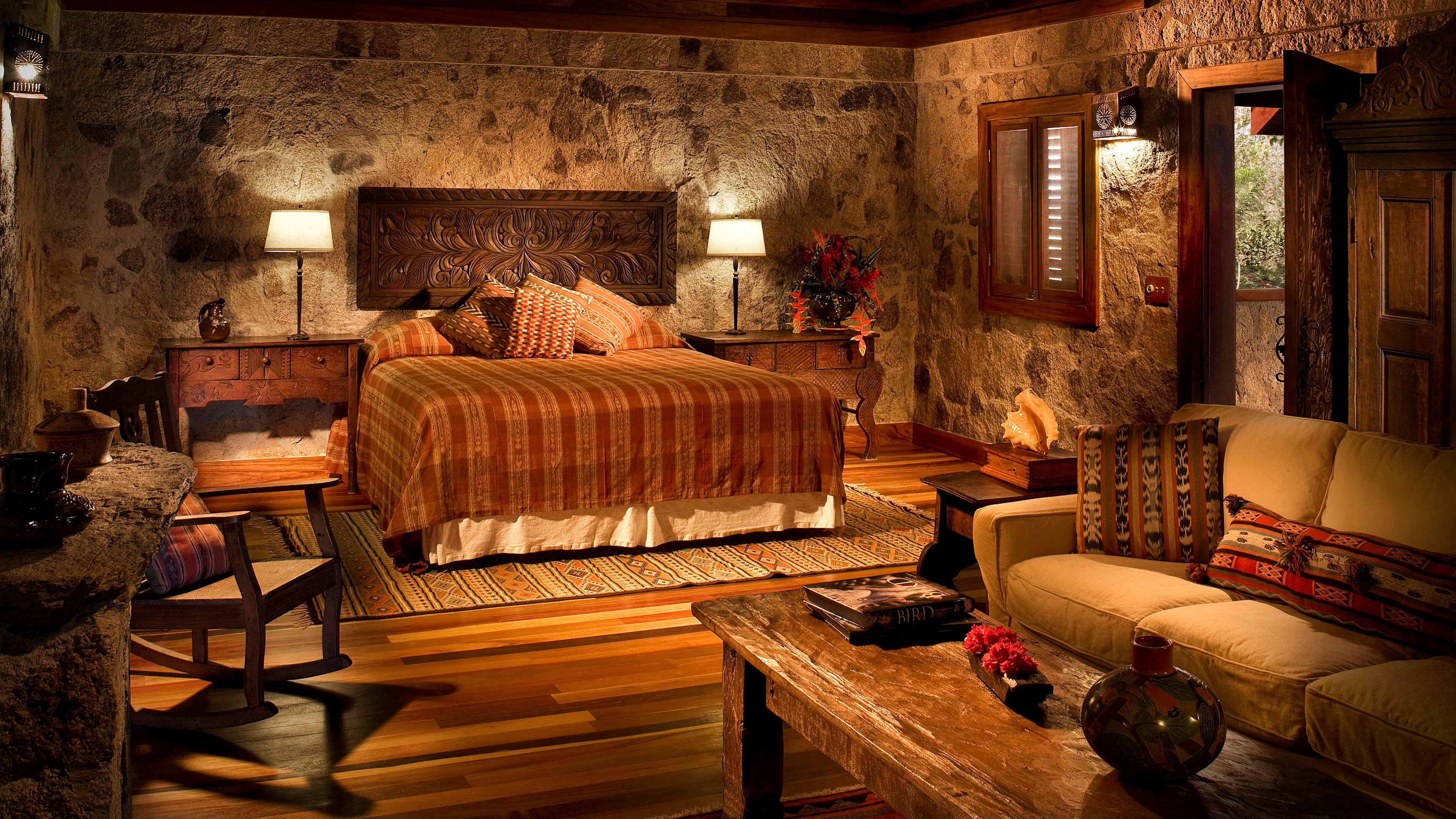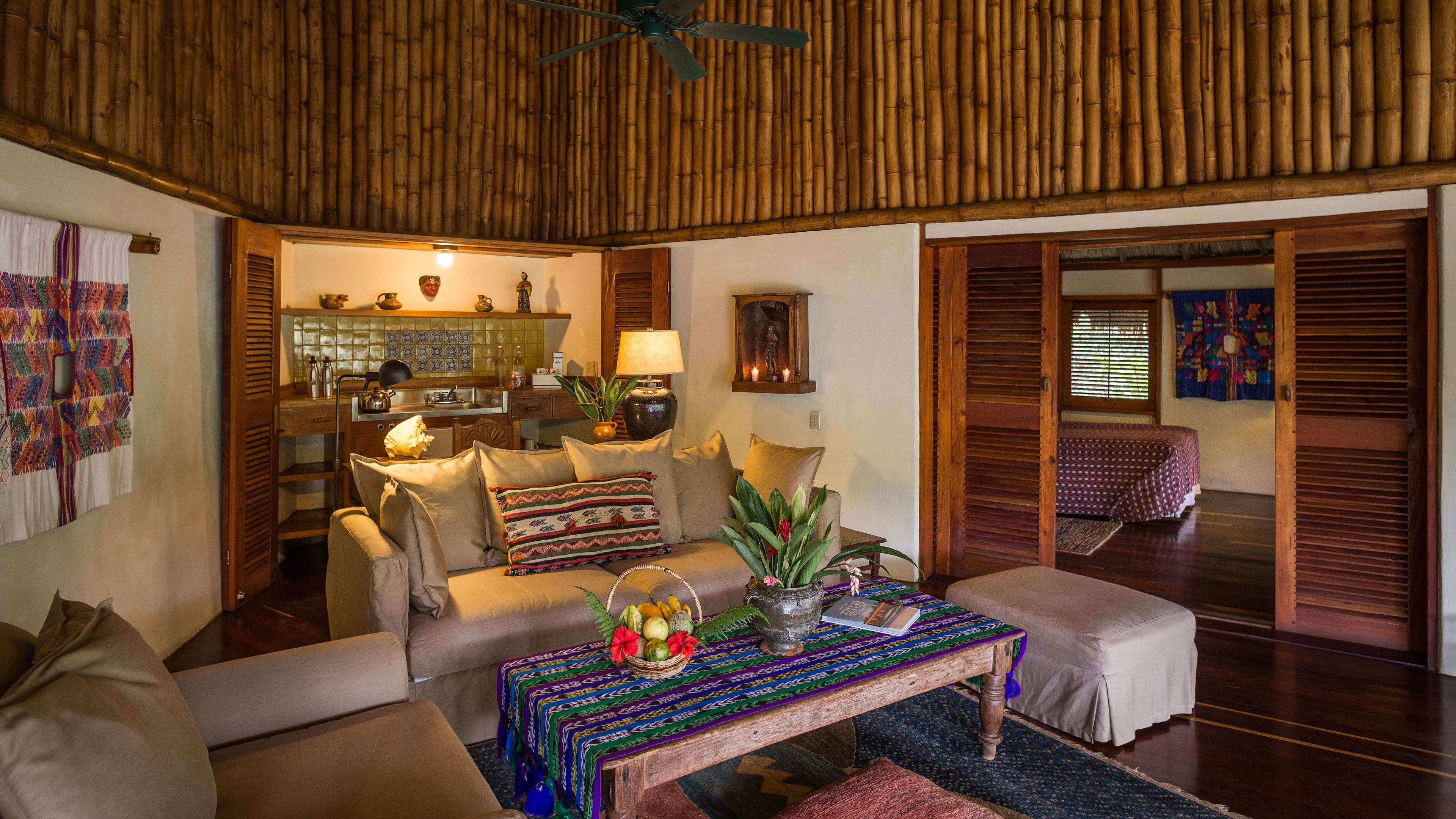 The ceiling fans in the Jaguar Bar are souvenirs from Apocalypse Now, and the hand-carved bar counter is decorated with glyphs of Mayan gods. Throughout the day, hummingbirds feed on the tropical flowers while guests sup hibiscus daiquiris.