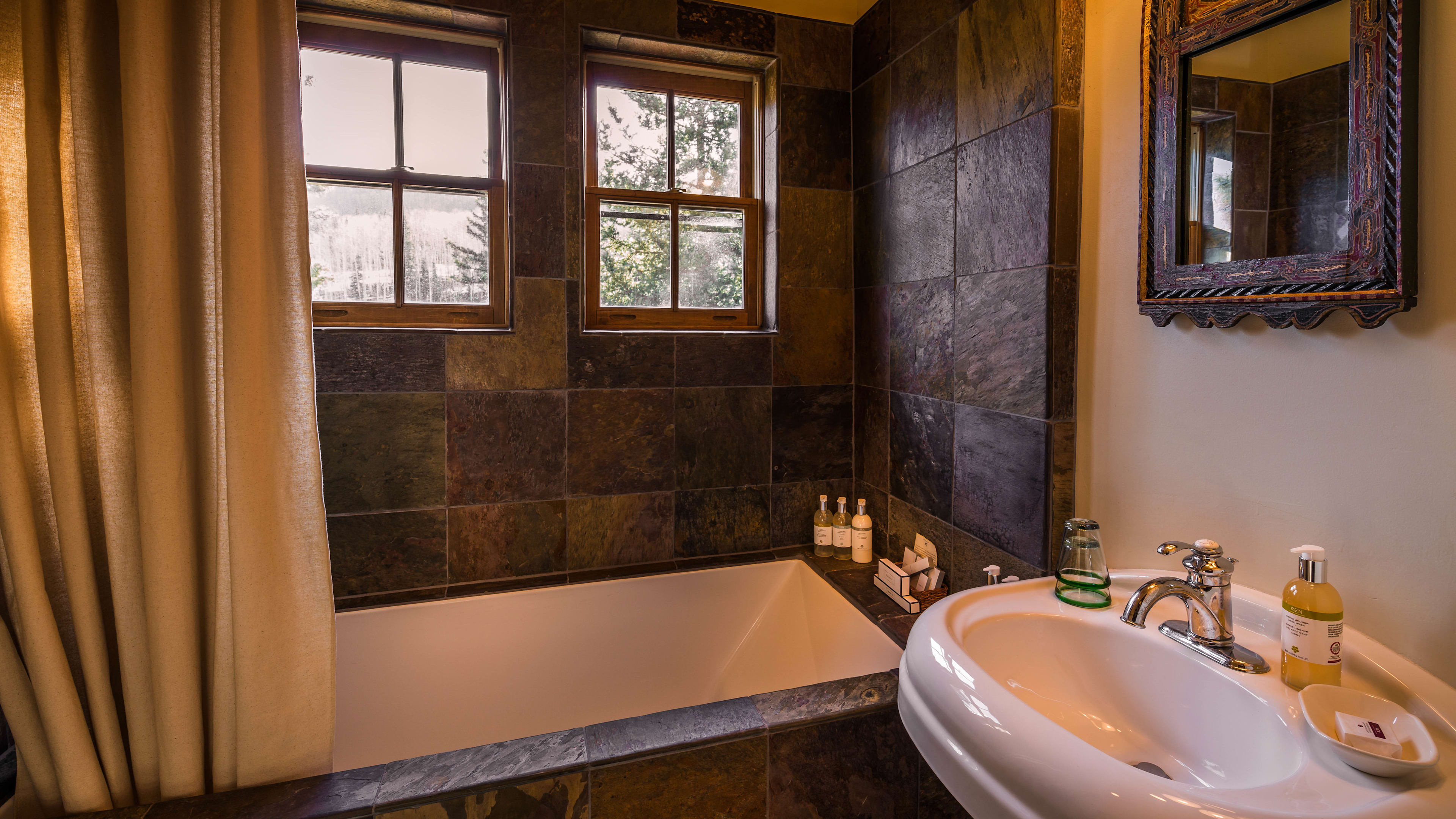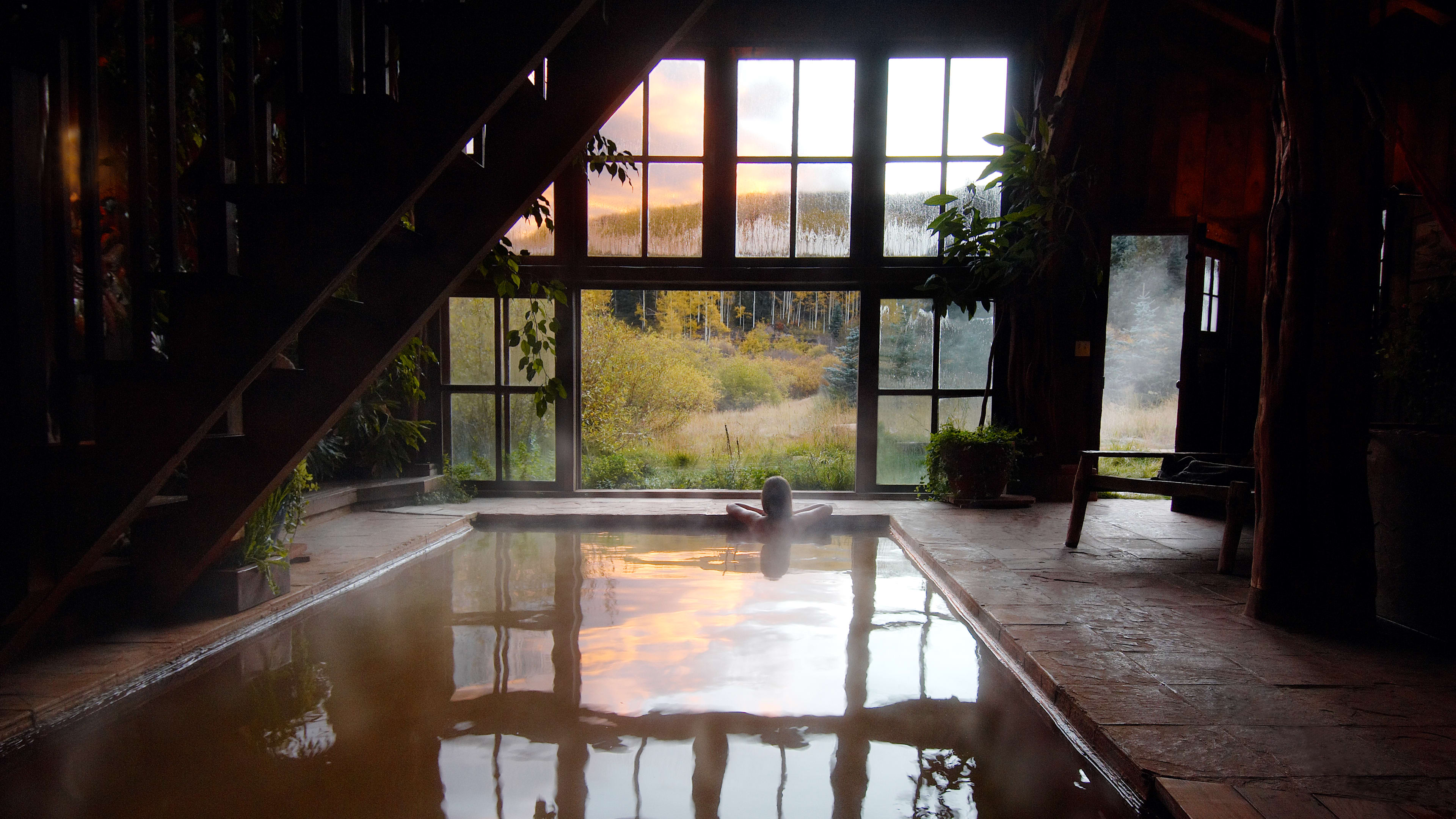 There are indoor and outdoor natural hot springs to bathe in, including one overlooking the mountains through a floor-to-ceiling window in the Bath House.