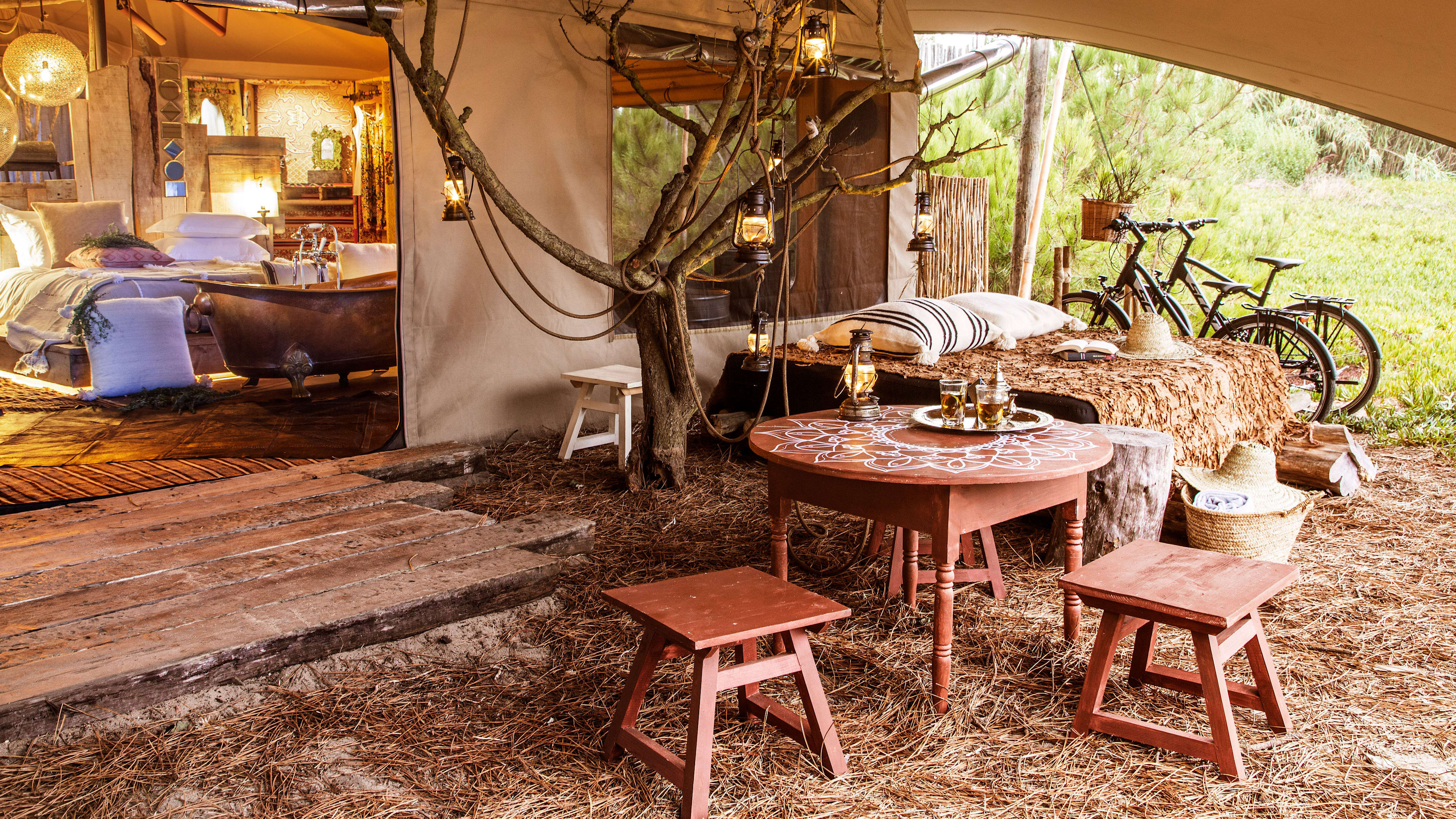 Rooms are graced with one of four design themes: Shelter, Land, Tree or Love. Our favourite of the former is Love-category room Nha Cretcheu, which has an elevated four-poster bed with a frame hewn from slender wooden boughs, a seductive fireplace by the bed (with a stash of logs so you can stoke the flames), a Jacuzzi bath tub and an invigorating outdoor shower. Chandelier lights with spaghetti-thin crystalline threads add glitter, and there’s a huge bath tub overlooking the gardens. Terra is a cosy Tree Room with a wooden four-poster, a desk overlooking the garden, a Jacuzzi, his and hers showers, a fireplace and a terrace deck. For group bookings and larger families, the property also has a number of villas available.