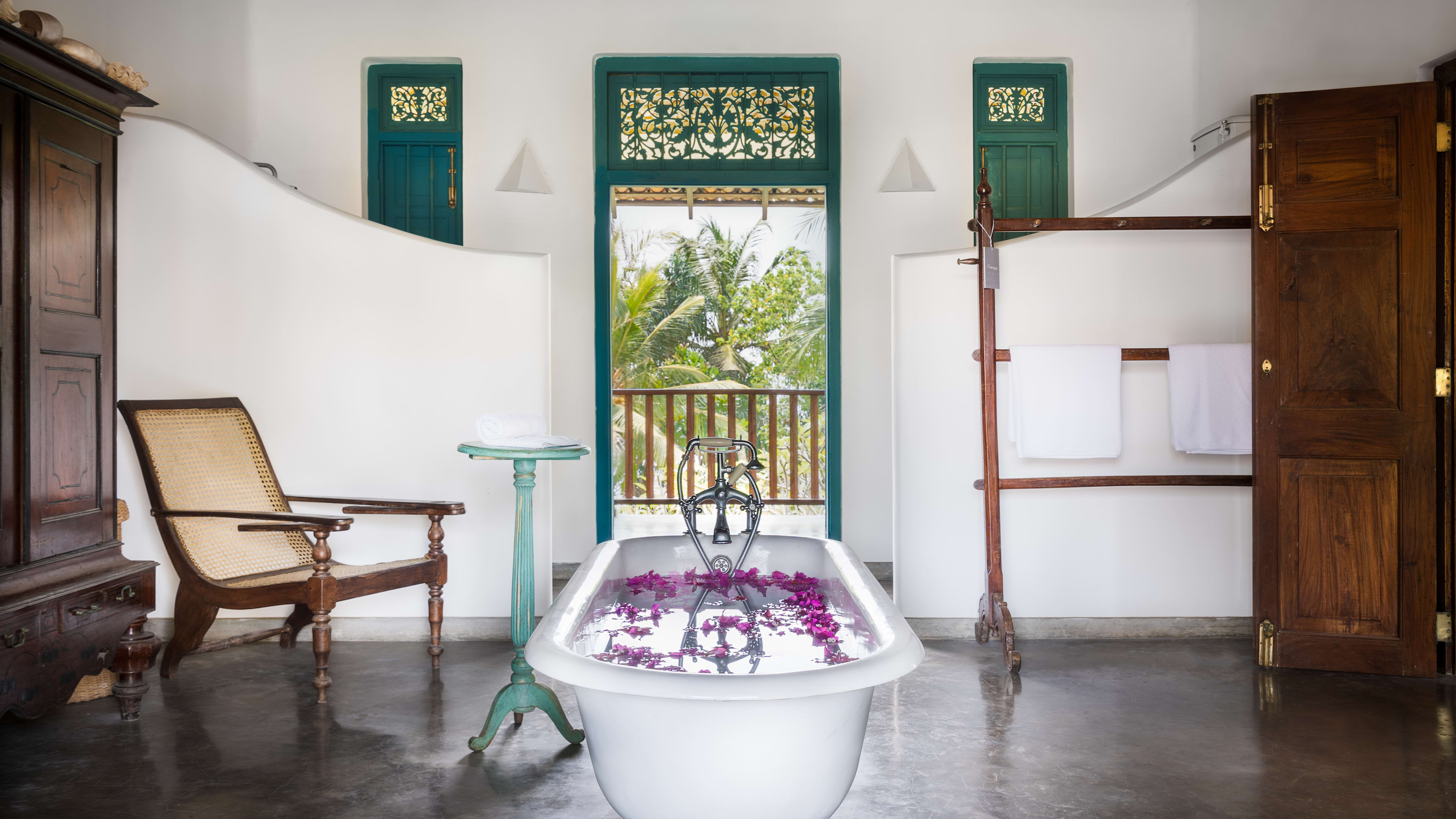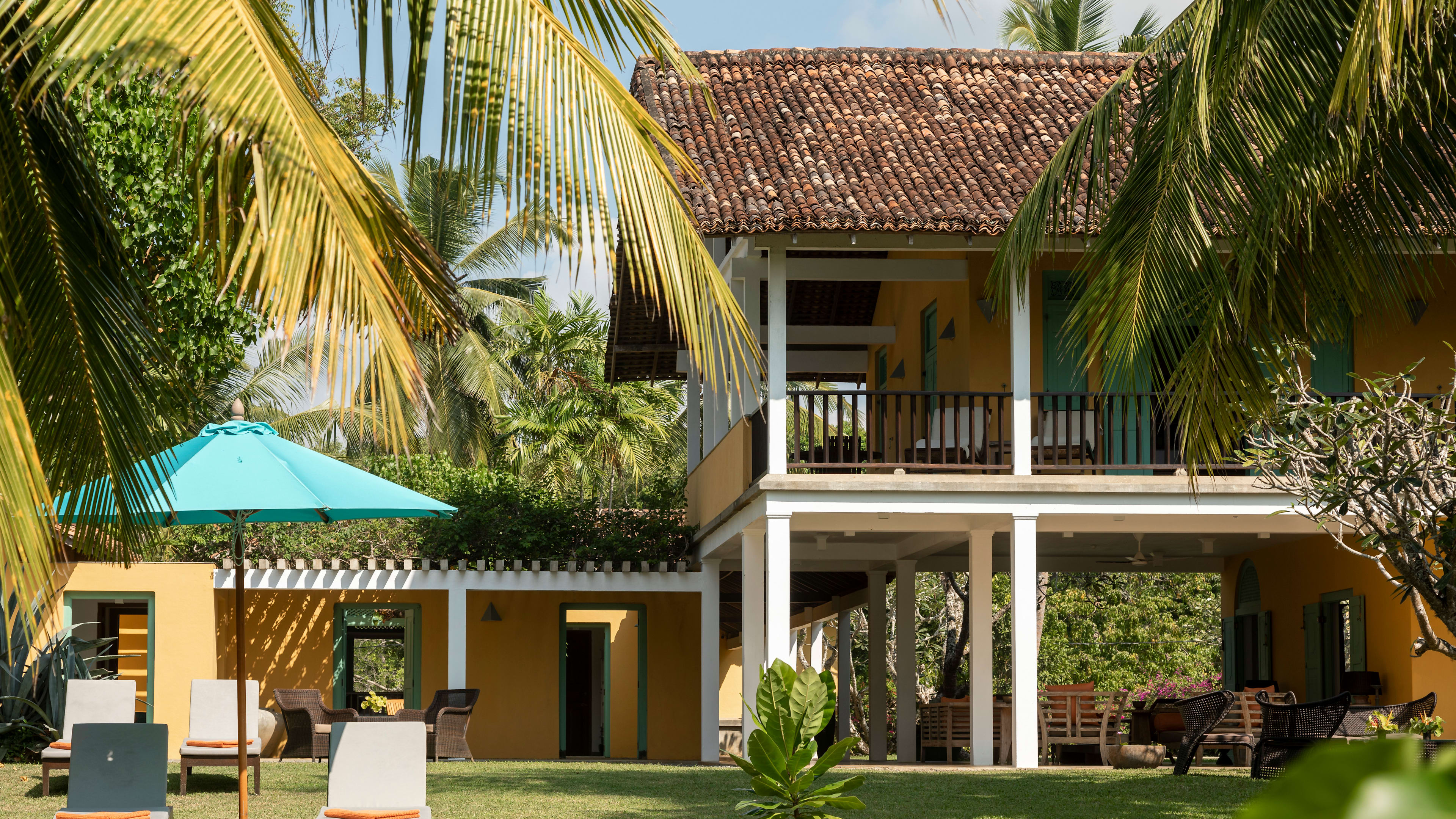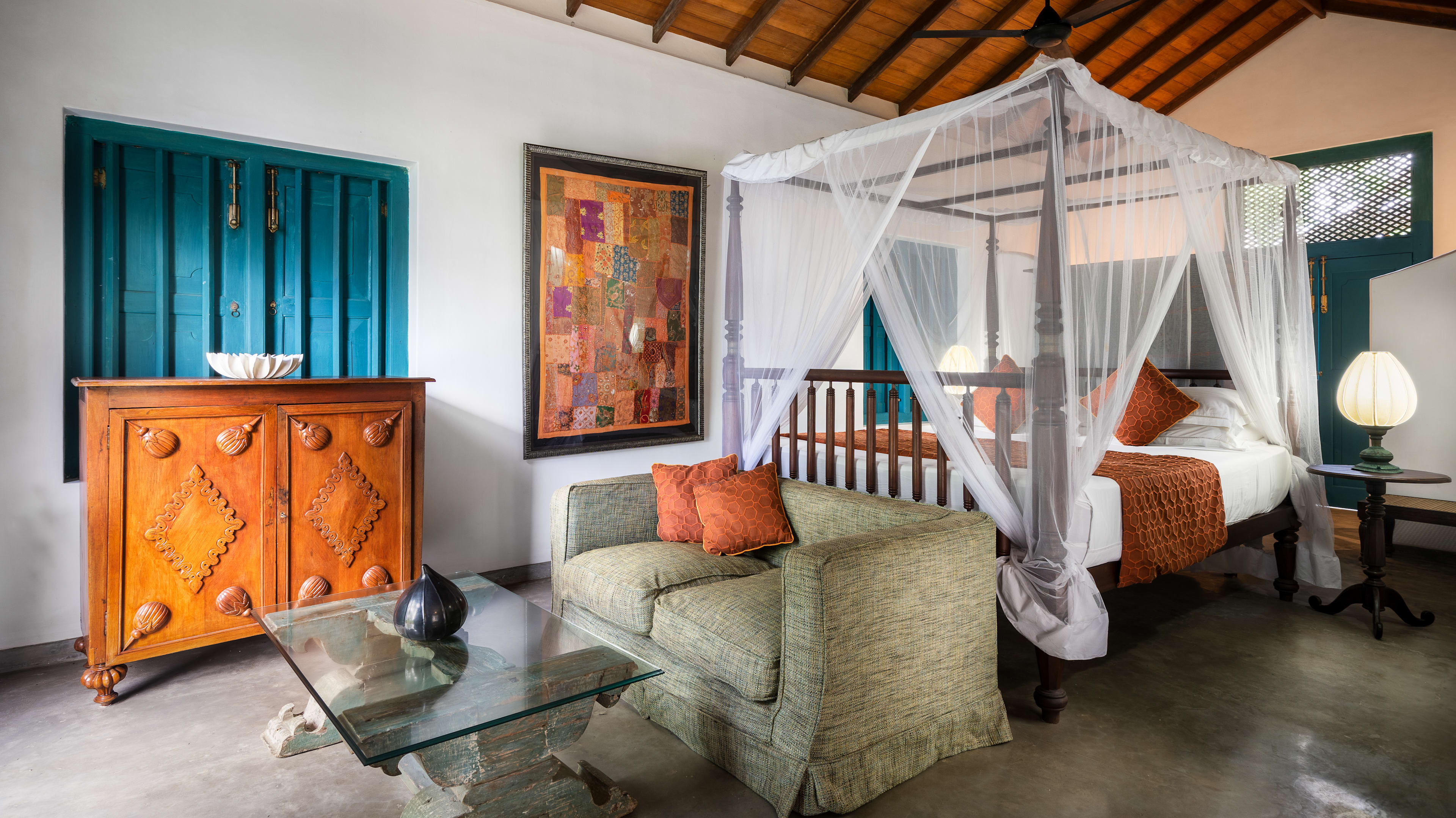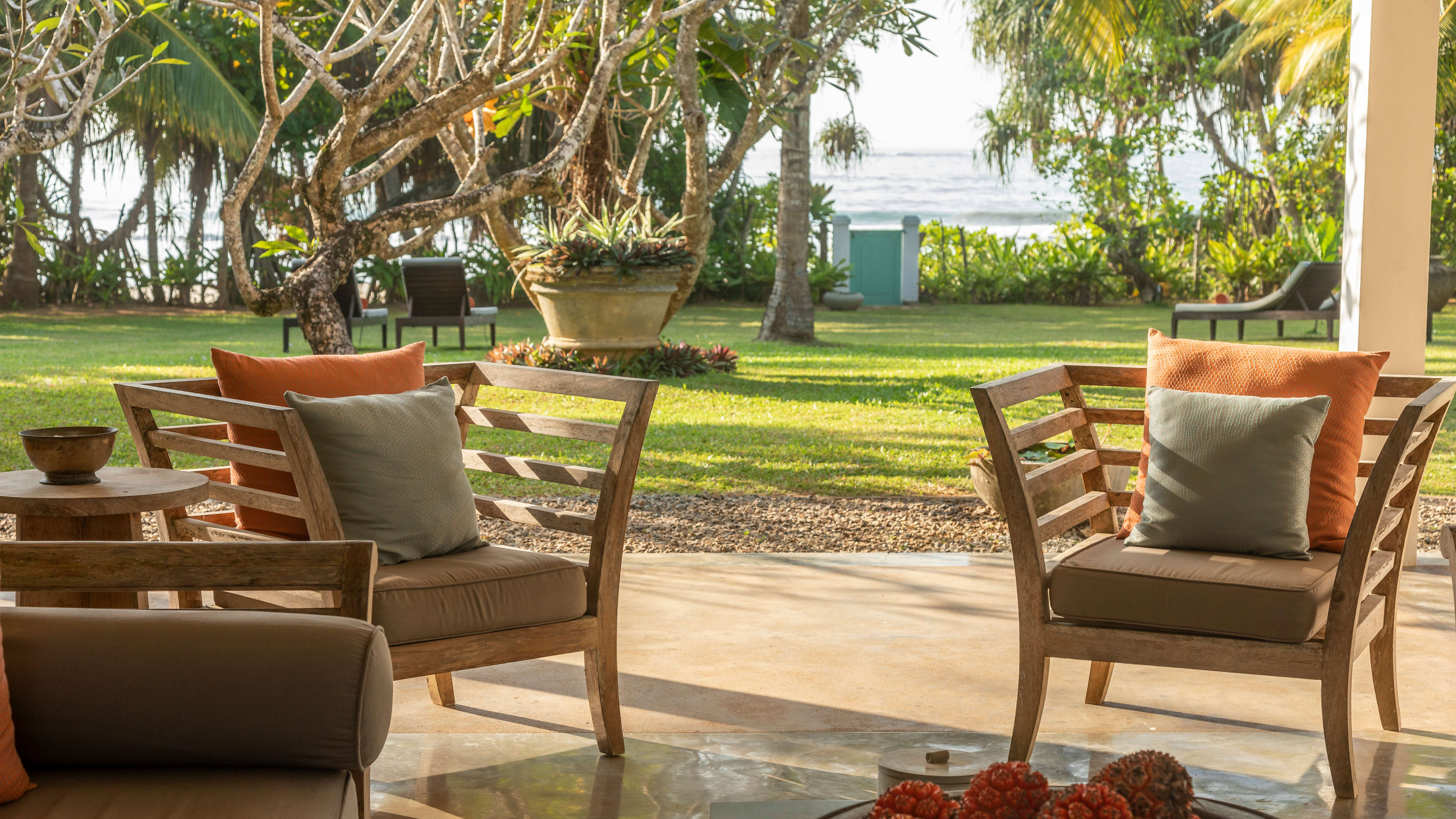 Ground-floor Moonamal comes with its own alfresco tub with overhead shower, and stable doors that open right onto the front and back lawns. Na drinks in views of the jungle-edged lagoon and has a superb peep-hole that gazes through the house, over the garden and out to sea.