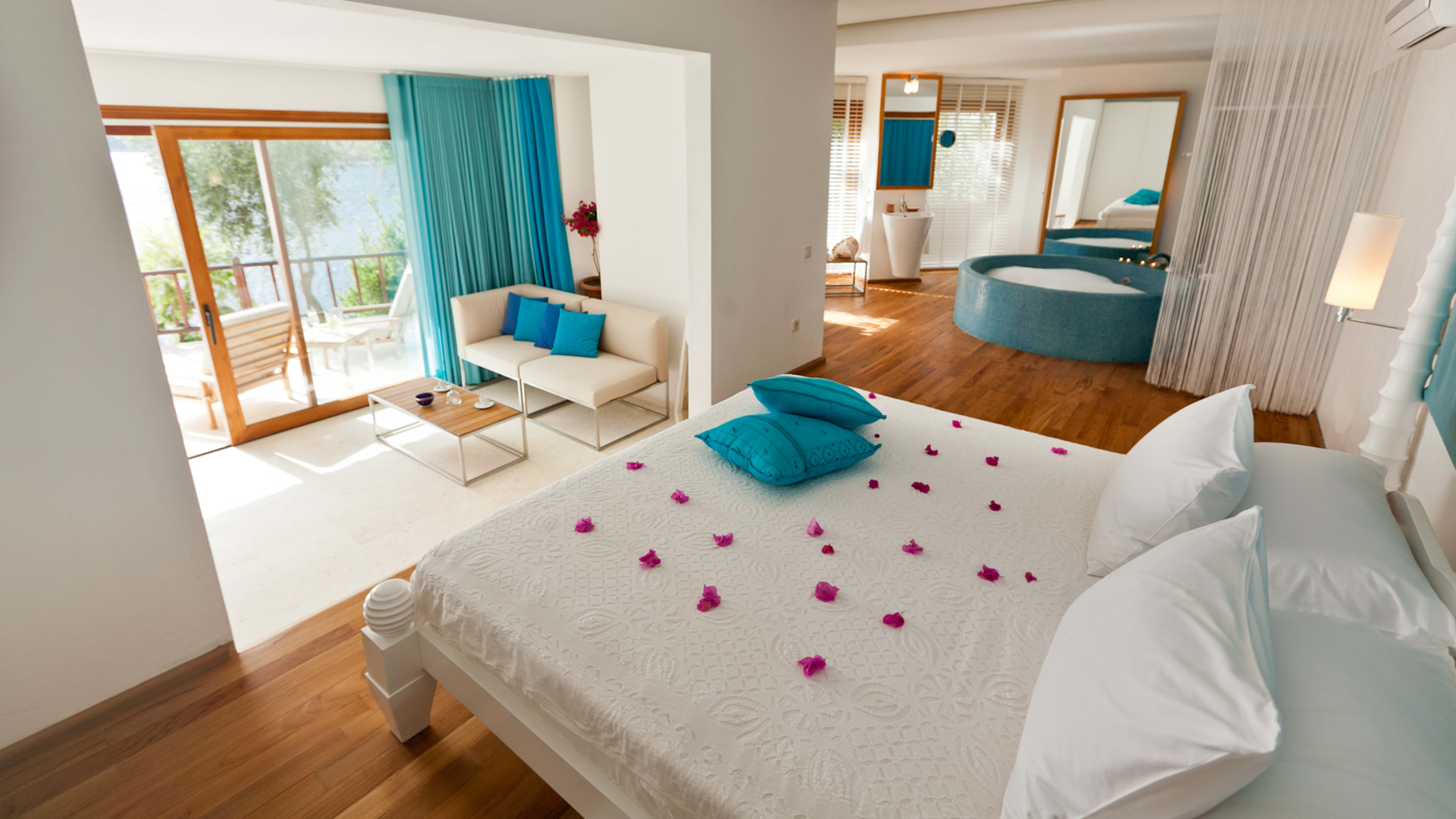 We applaud the sociable beach club scene, but honeymooners and loved-up twosomes can seek some alone time in the resort’s only villa, the Cliff House. Bar infrequent visits from the friendly gardener, it’s utterly secluded, set mere steps from the coast and surrounded by aloe vera plants. A private infinity pool appears to run into Kalkan Bay, and there are sunloungers and cushioned banquettes on your terrace for cosy sunset-gazing.