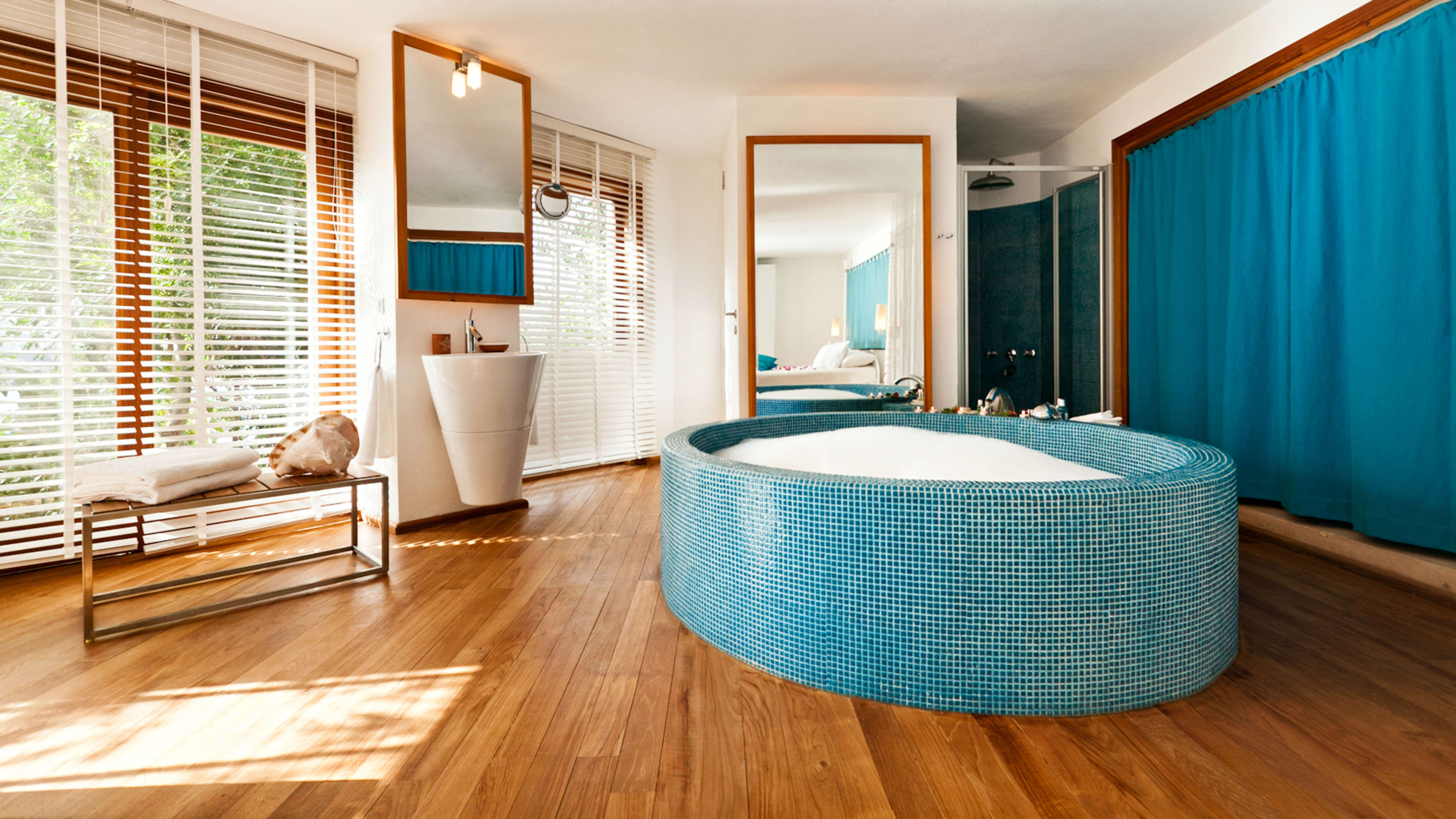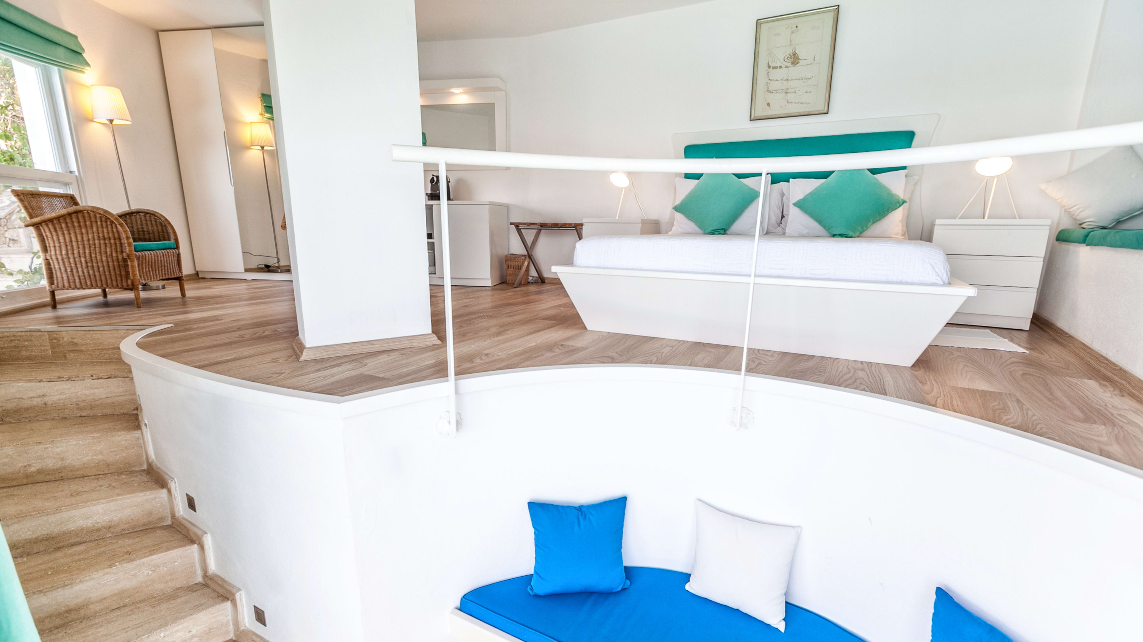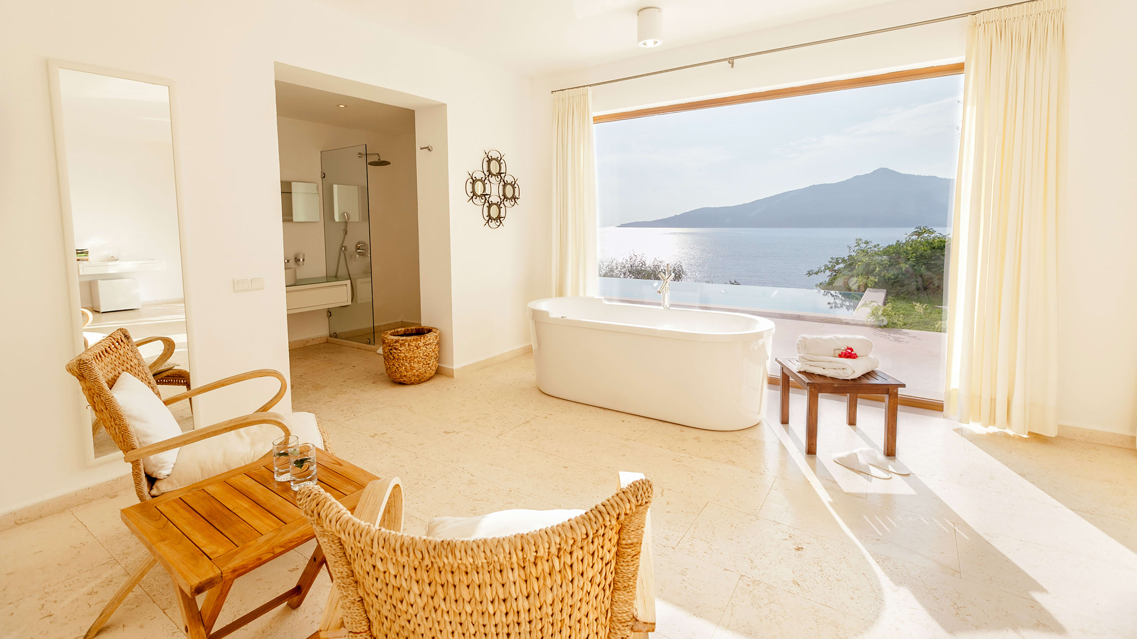 The view from the resort’s 17-metre infinity pool – lime, olive and fig trees descending into the blue of the bay – will make you want to up sticks and pursue the hotelier path on the Turkish coast (much like Villa Mahal owner, Ipek). A Jacuzzi, sunloungers and honesty bar complete the serene set up. The Cliff House and Pool Room each have private pools and guests can jump into the bay from the Beach Club’s floating platforms – a private deck is reserved for each room or suite.