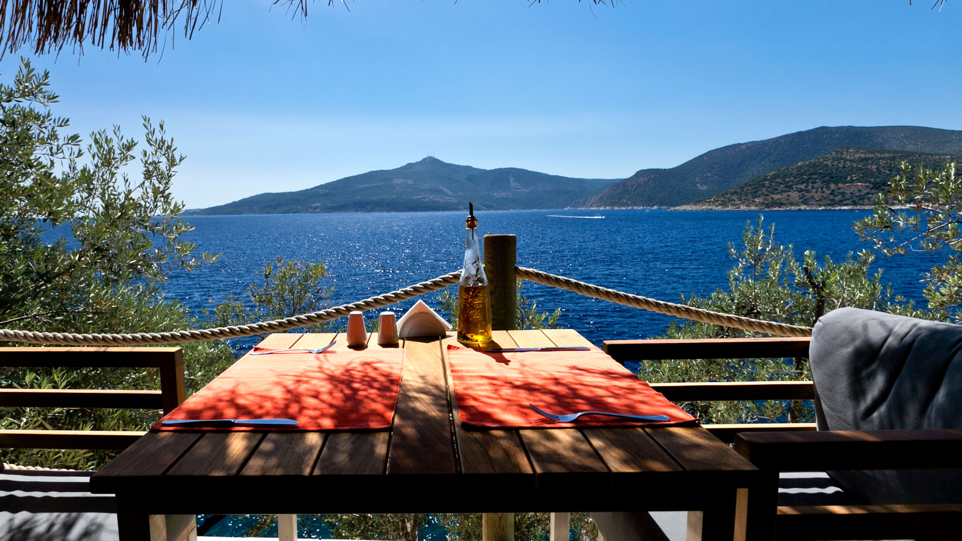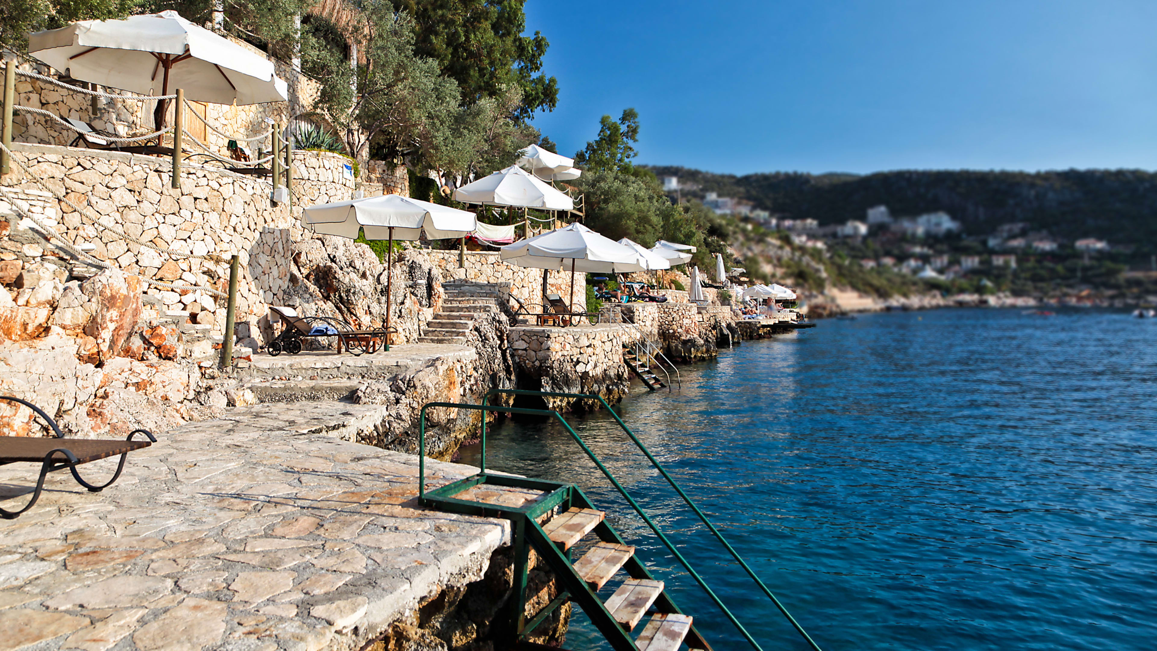Down a staircase carved into the rock face you reach a platform hovering over the turquoise bay, where staff can set up a lamp-lit table. Kalkan’s glittering lights in the distance and the peaceful lapping of waves make it oh-so romantic.