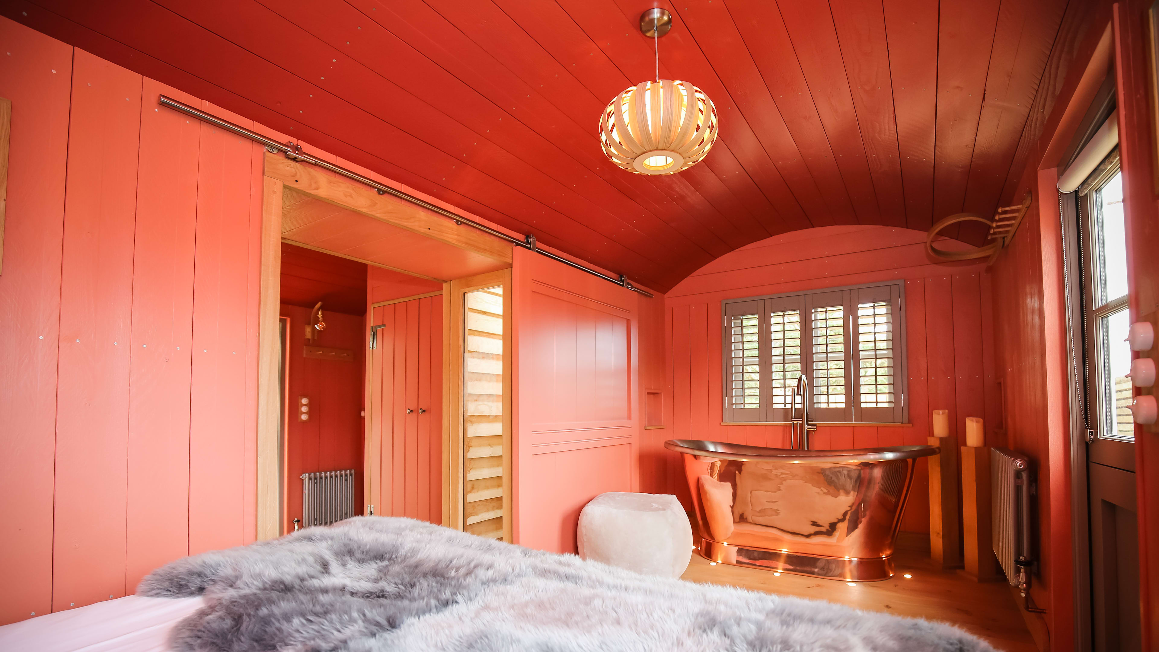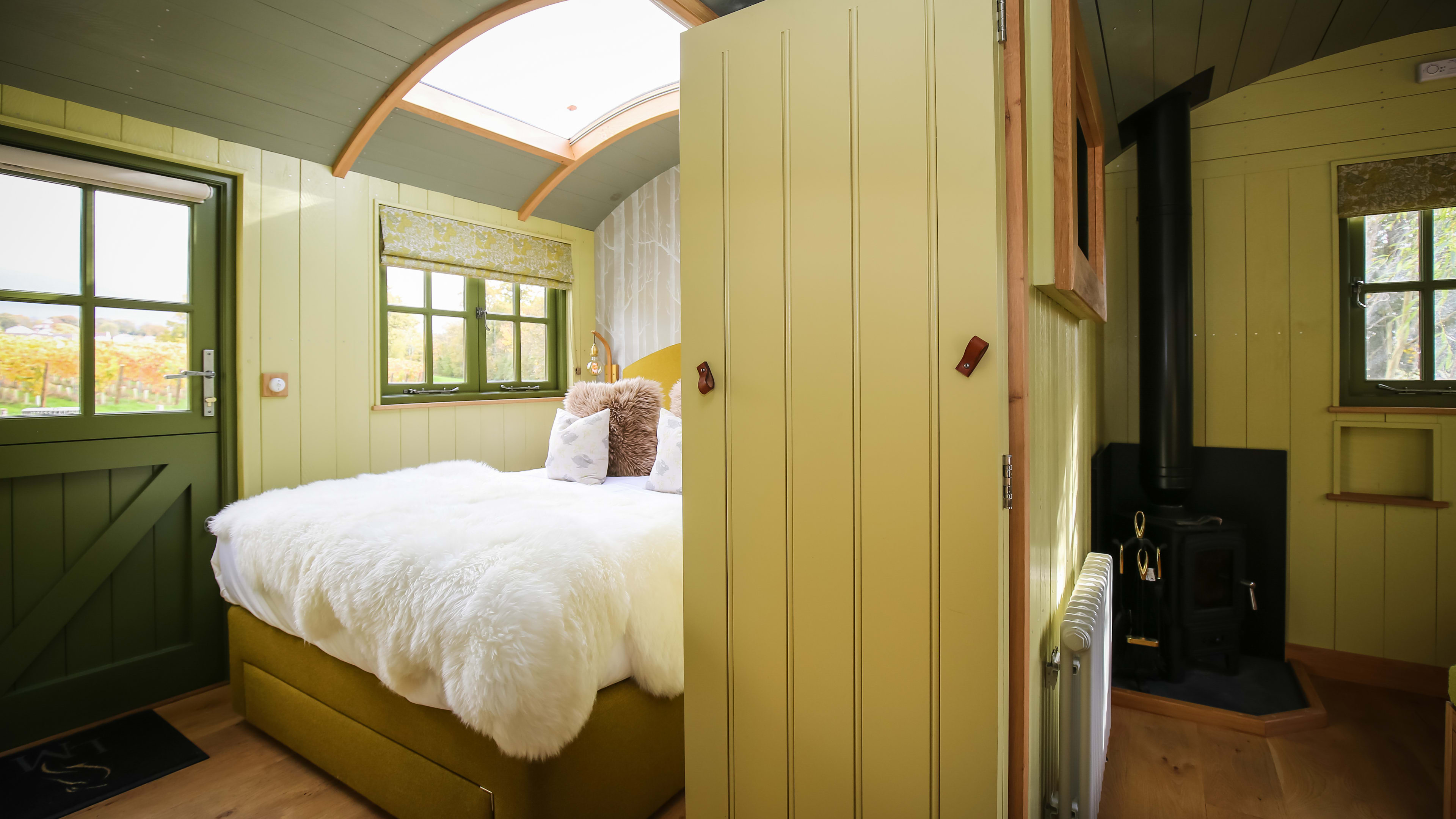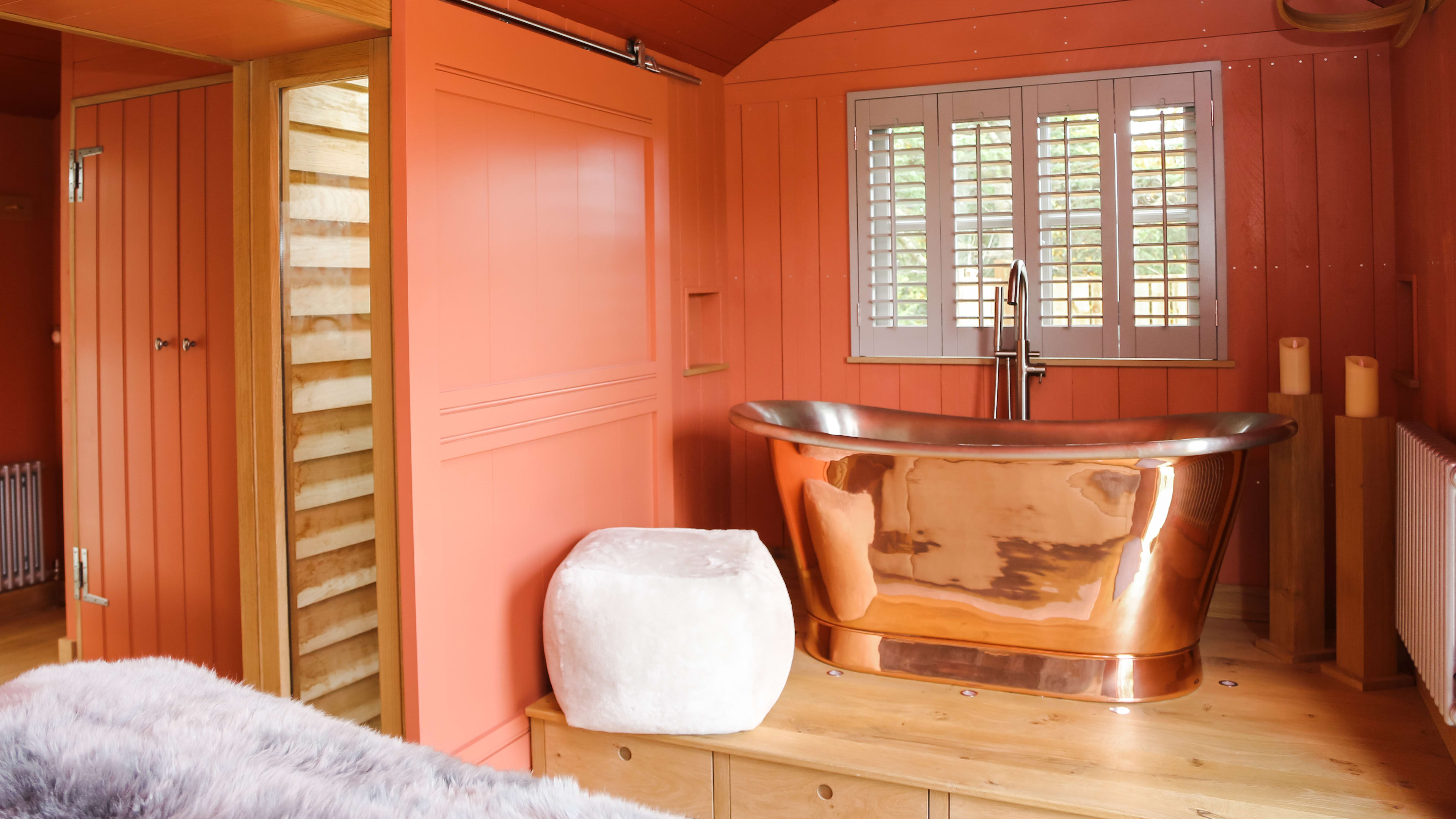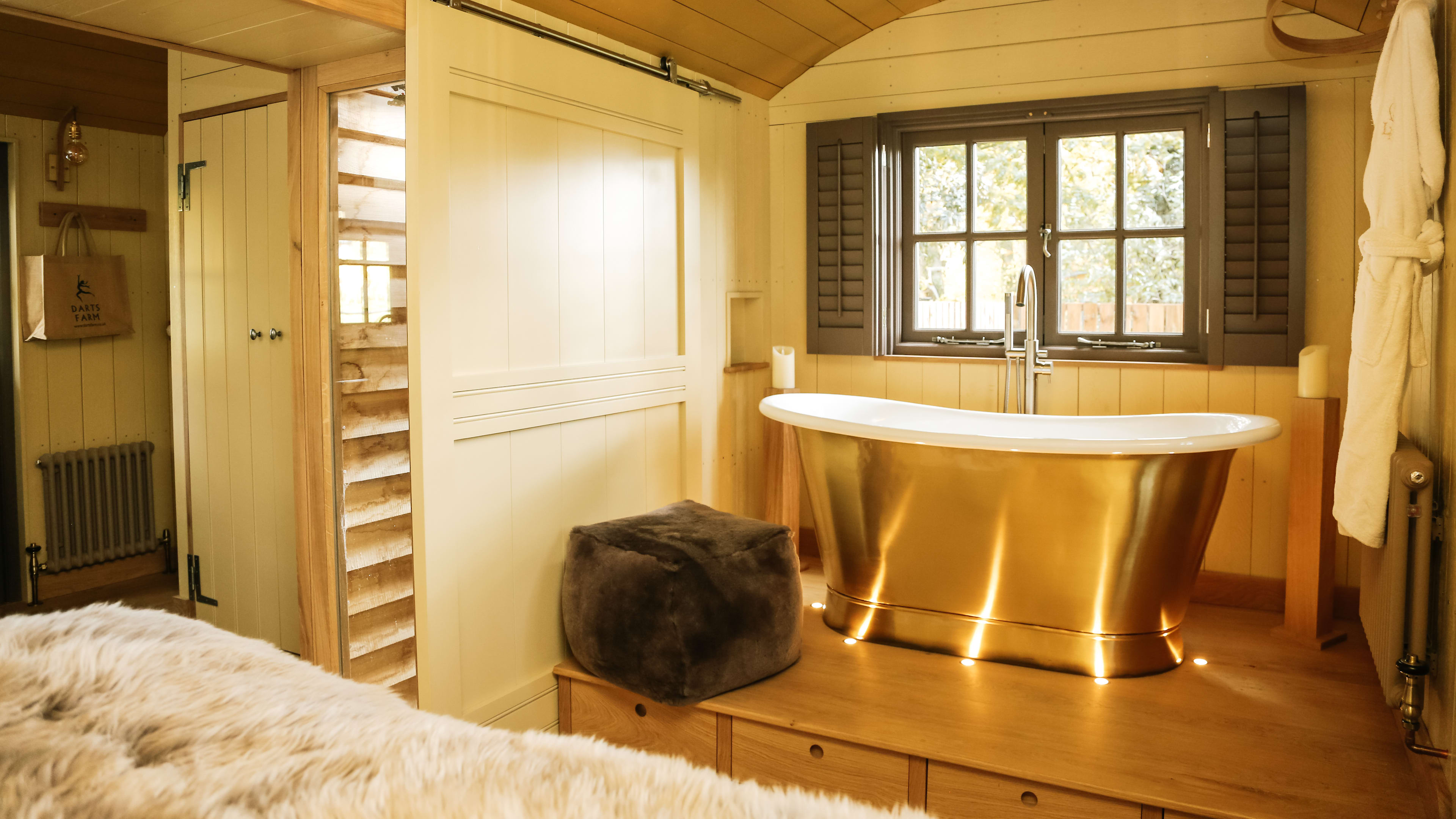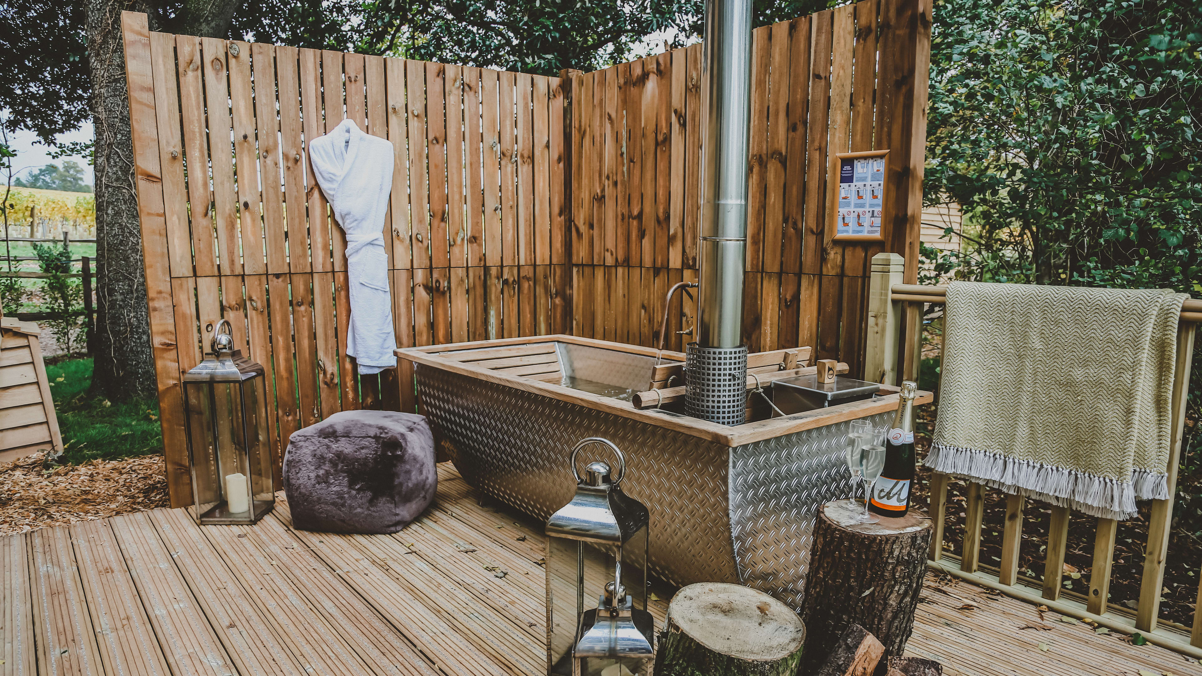 The Heron Suite has two side-by-side, gilded, roll-top bath tubs with views across the Estuary through tall Georgian sash windows. To ogle the picturesque countryside at will, stay in one of the Shepherd Huts (the Bee Hive is our favourite) which have expansive vineyard views and alfresco bath tub or wood-fired hot tubs for romantic soaks.