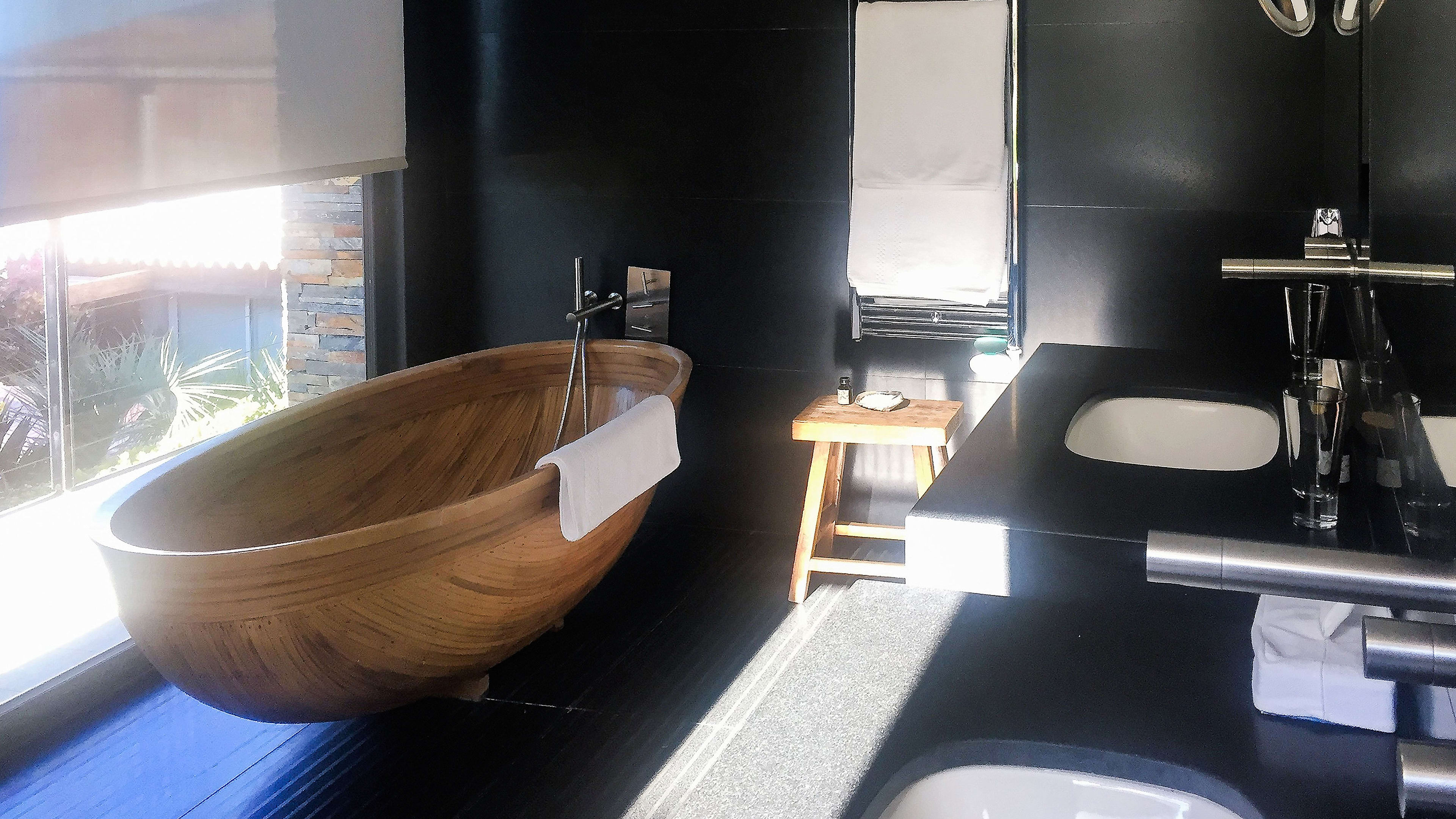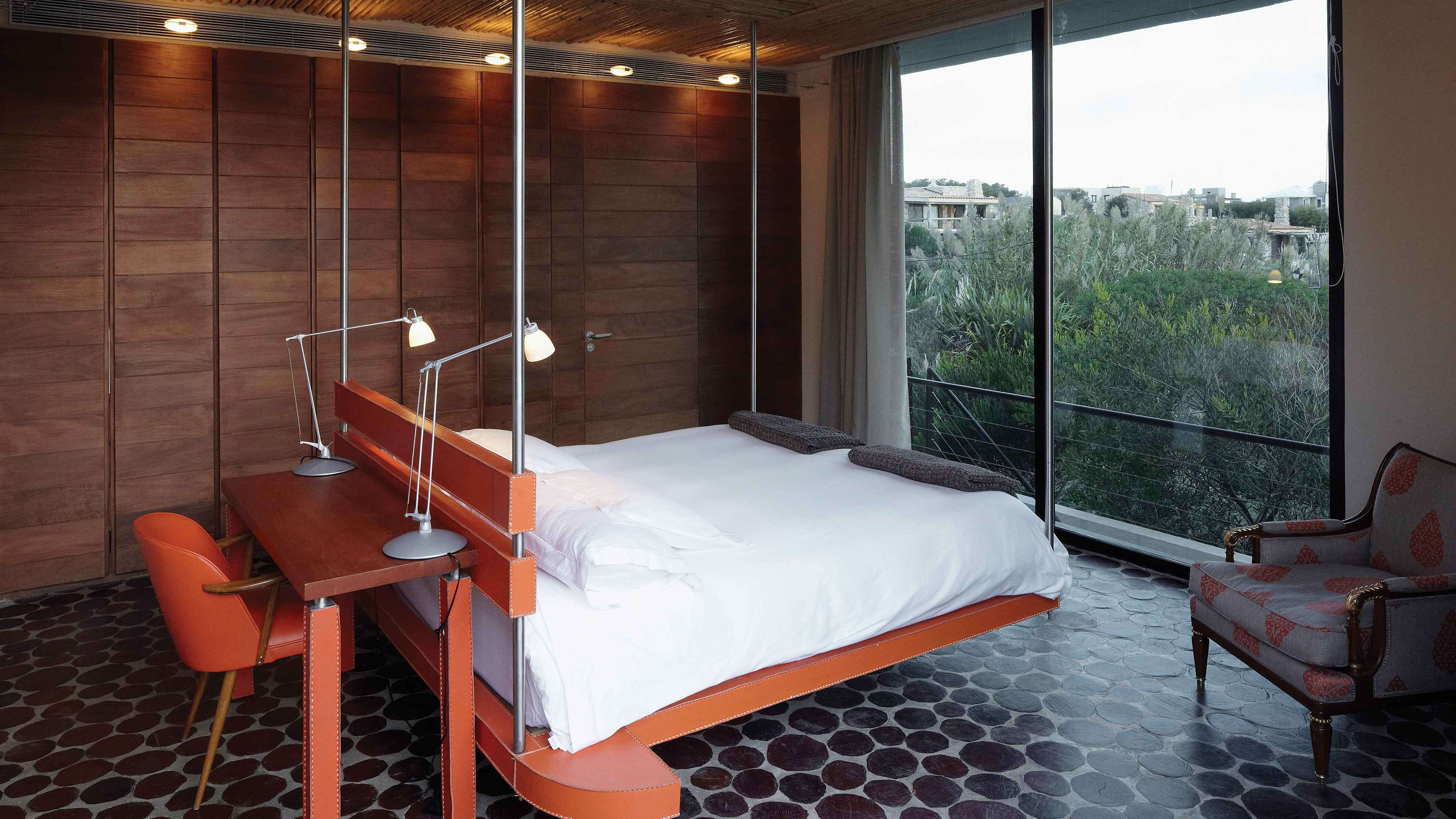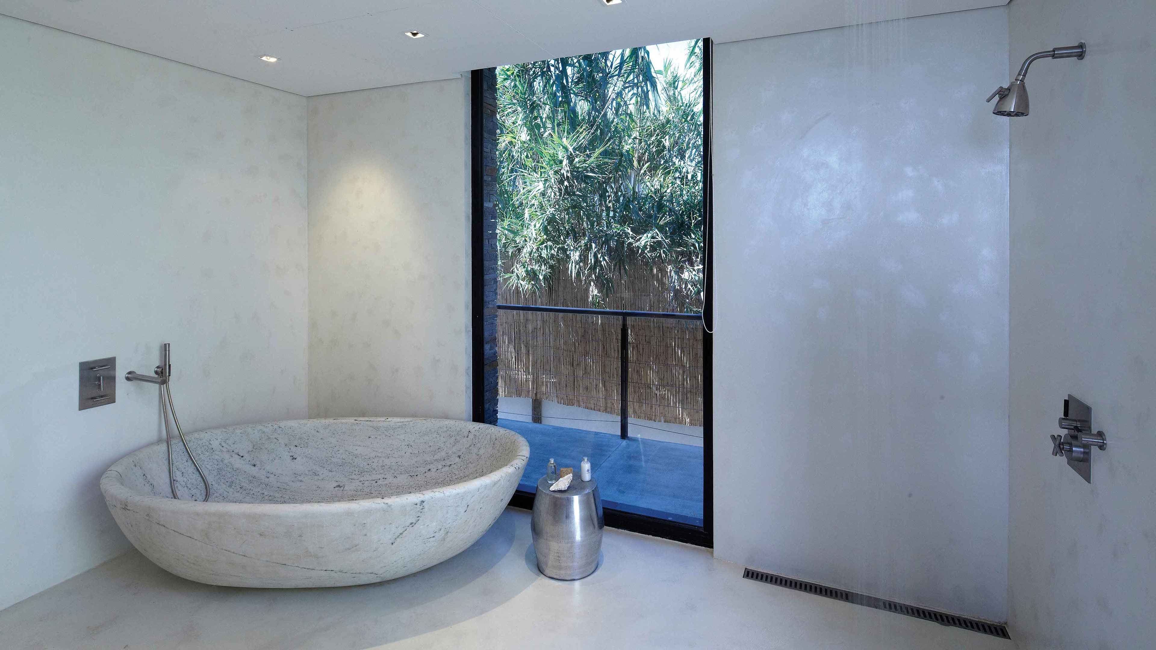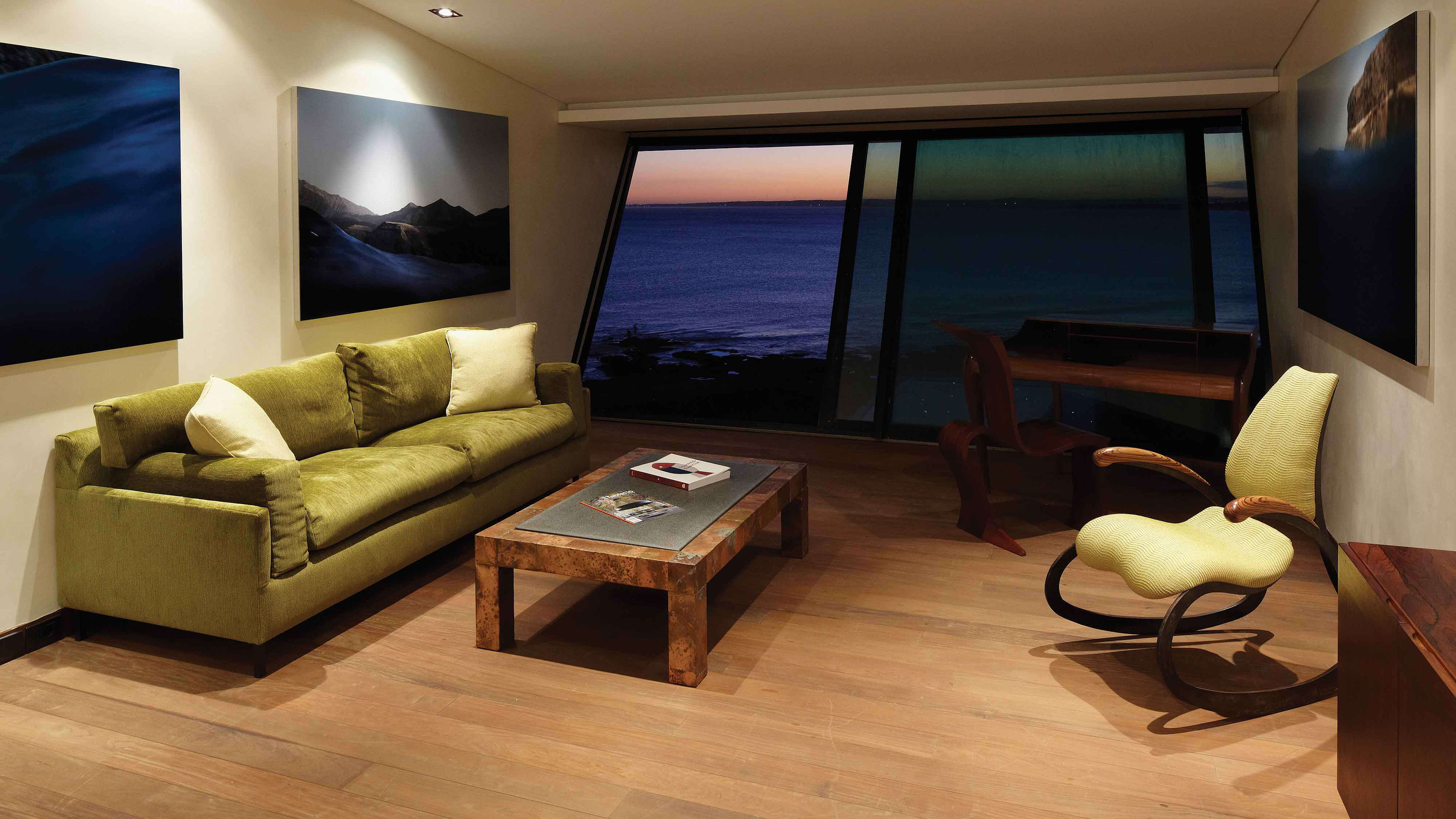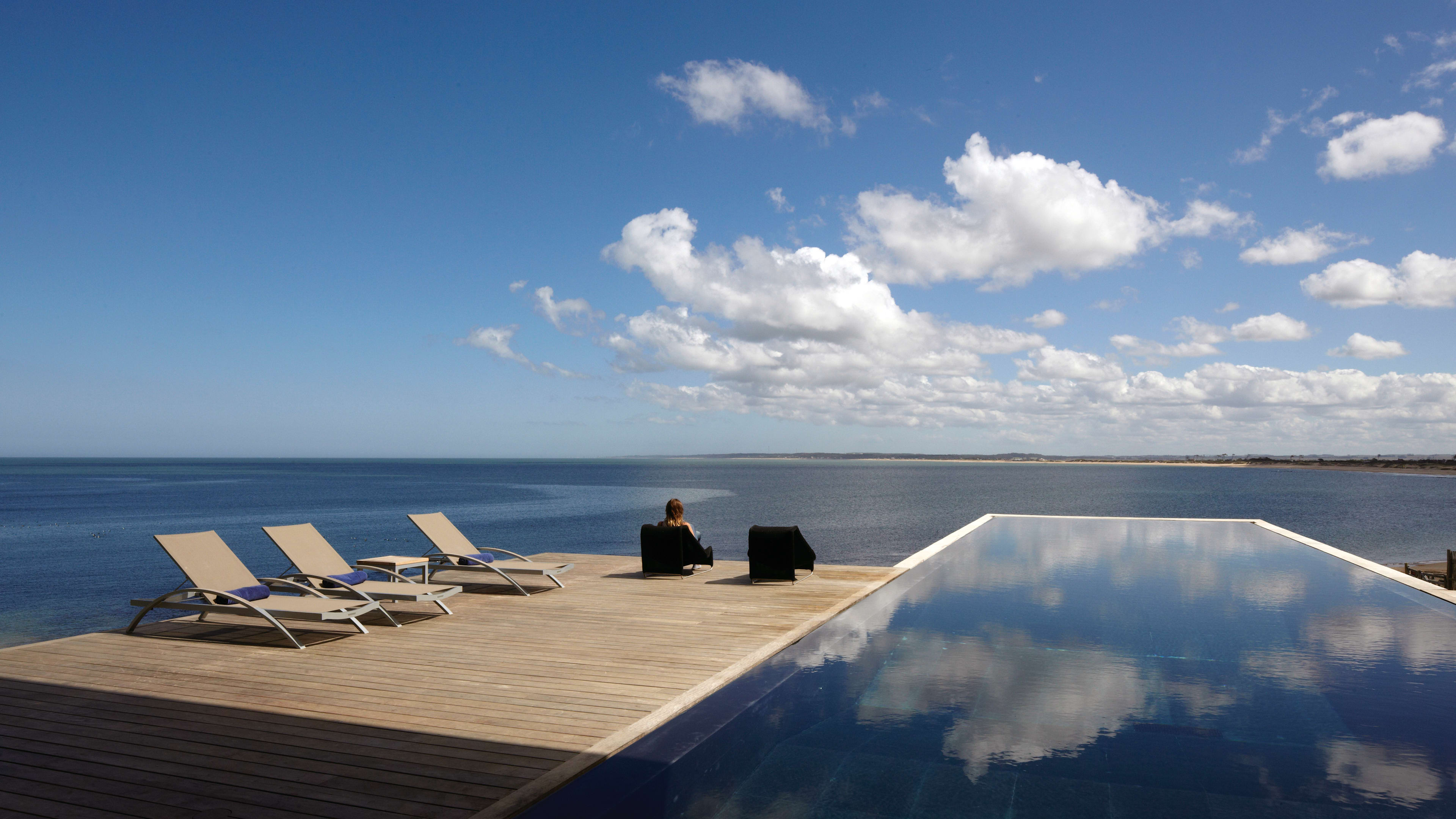 Built of smooth concrete and tiled in black granite, the 22m cantilevered infinity pool sits on sloping ground – once you’re in it, the perspective makes it seem as if you could swim straight out to sea. As if that weren’t transportive enough, it’s also covered in small lights that map out the stars visible from the southern hemisphere, making after-hours dips an otherworldly experience. There are large decked areas on either side with several sun loungers.