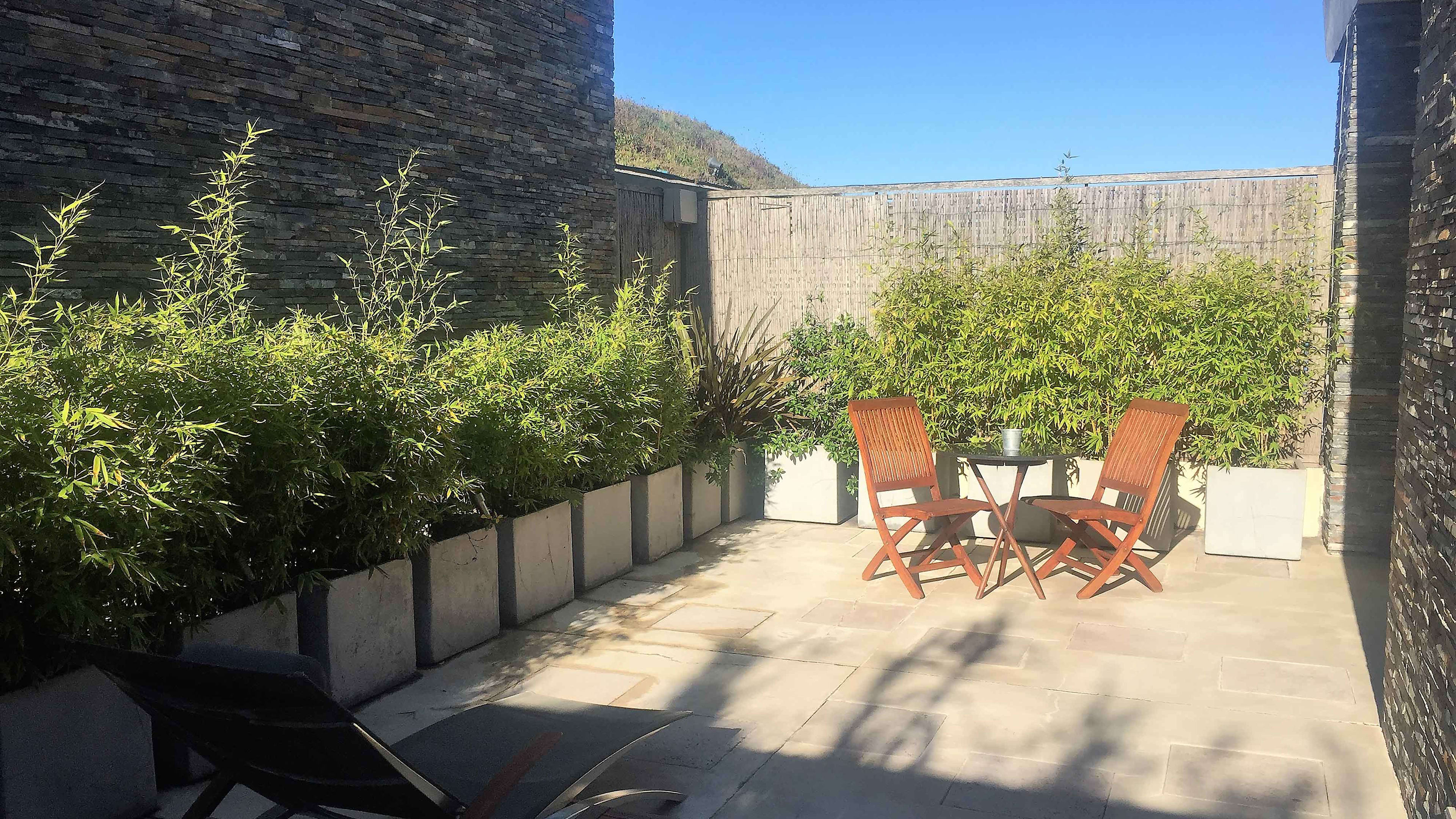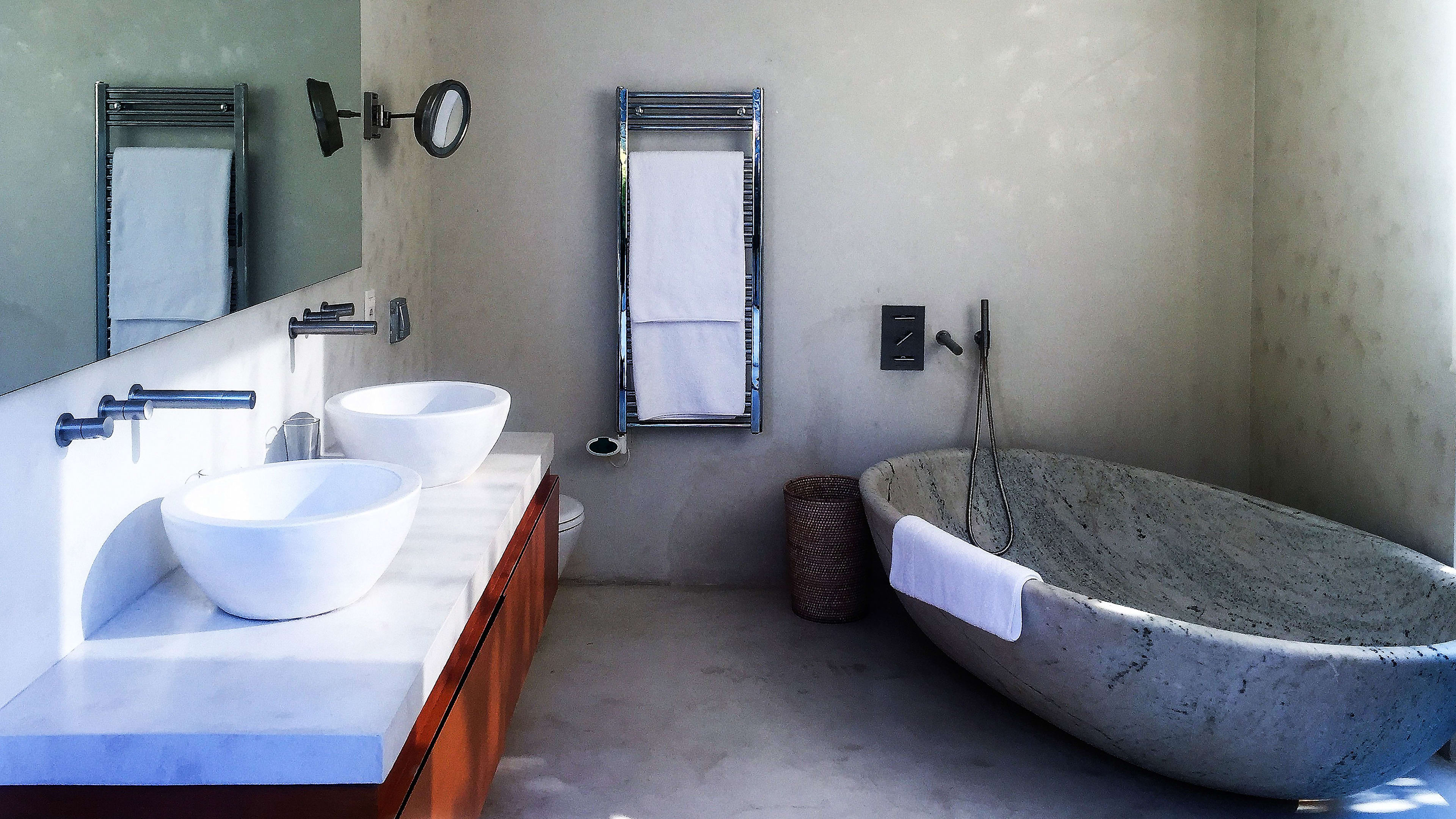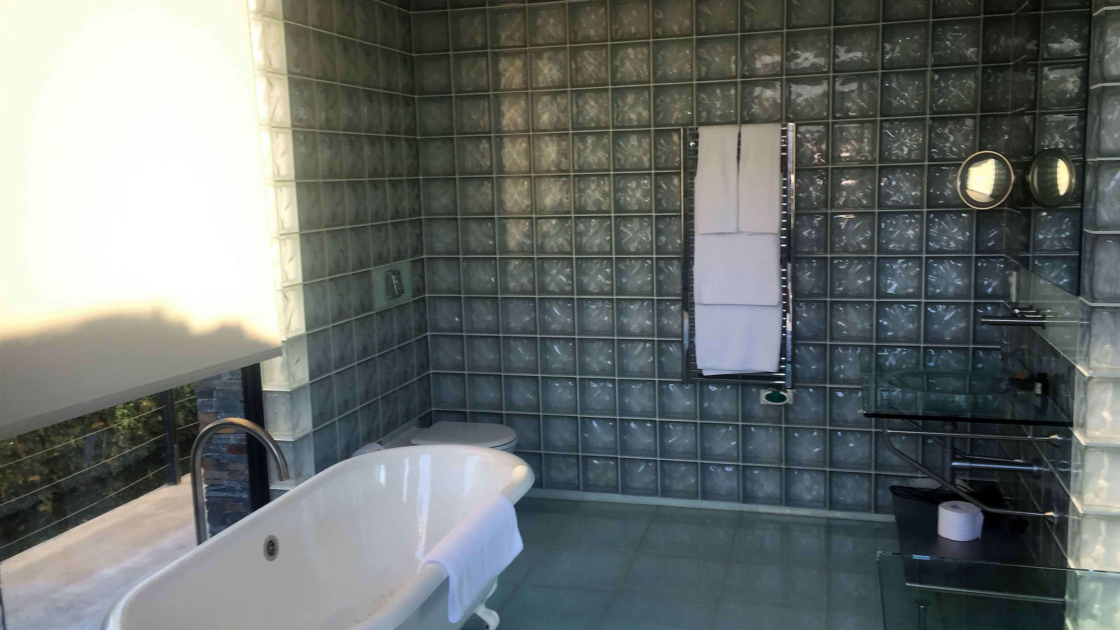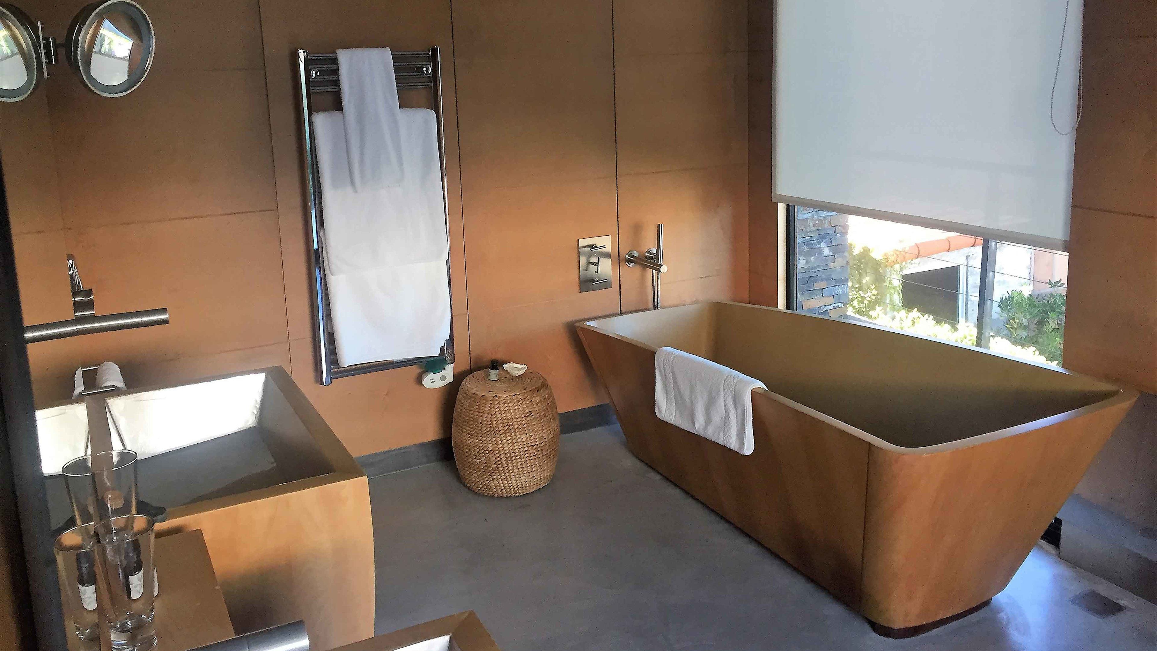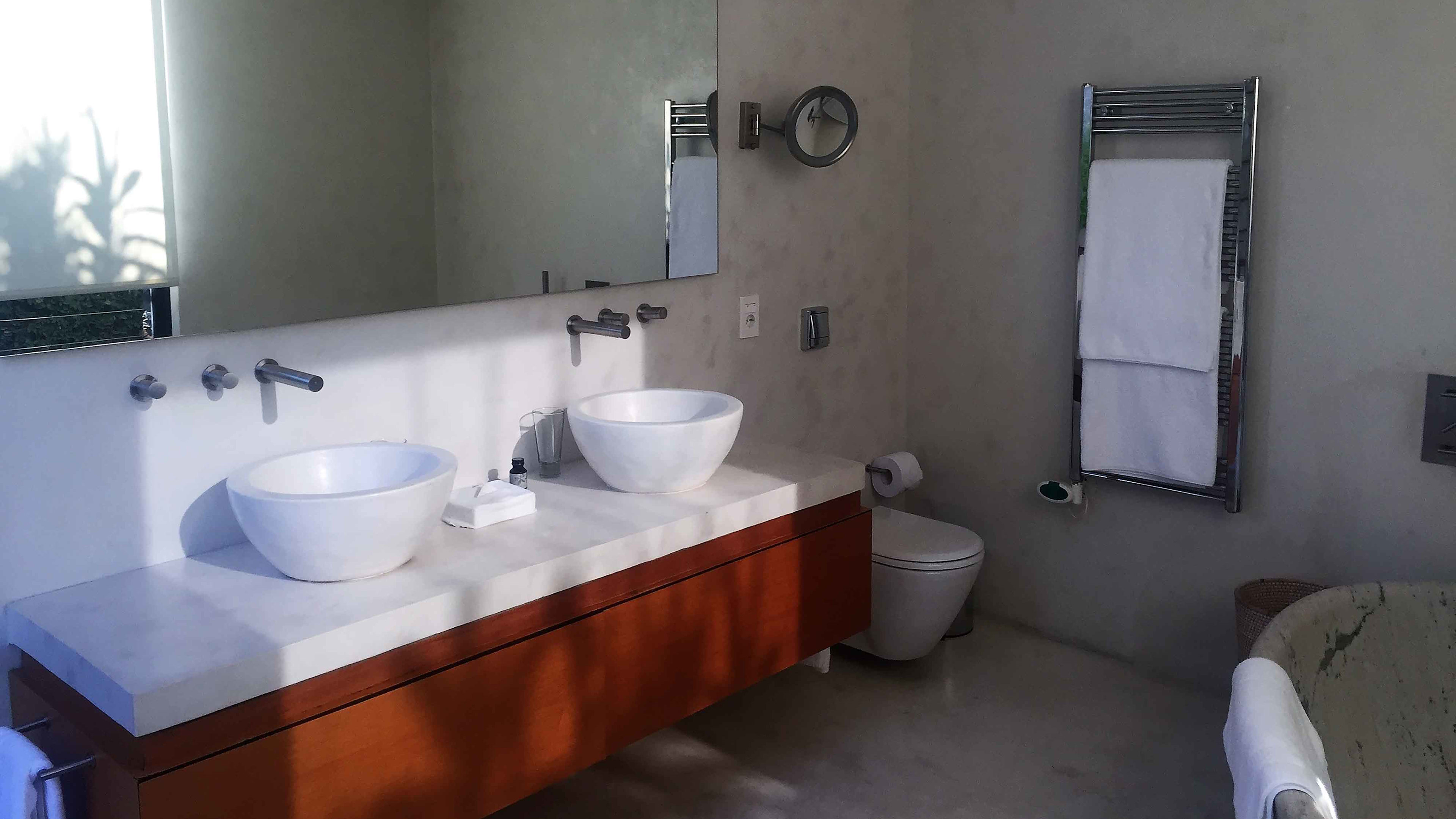 Built of smooth concrete and tiled in black granite, the 22m cantilevered infinity pool sits on sloping ground – once you’re in it, the perspective makes it seem as if you could swim straight out to sea. As if that weren’t transportive enough, it’s also covered in small lights that map out the stars visible from the southern hemisphere, making after-hours dips an otherworldly experience. There are large decked areas on either side with several sun loungers.