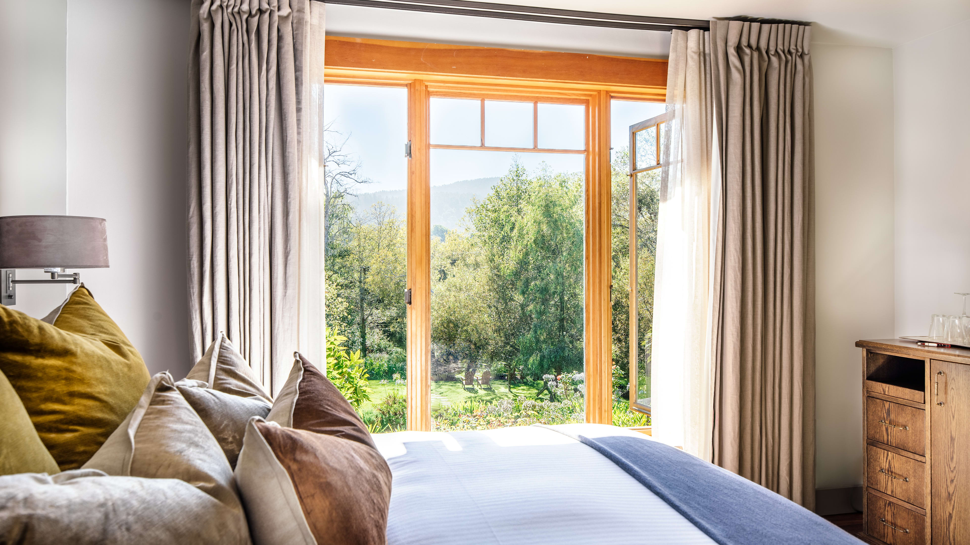 The Creekside Cottage would be perfect for families – it’s tucked away in the grounds (so make as much ruckus as you want), there are two queen-size sofa beds in the living room and a private garden patio. For rustic romance, the Drake Suite in the main building has soaring double-height windows, a mezzanine bedroom with a four-poster bed and a bay window seat looking out to the lawns and the forest beyond.