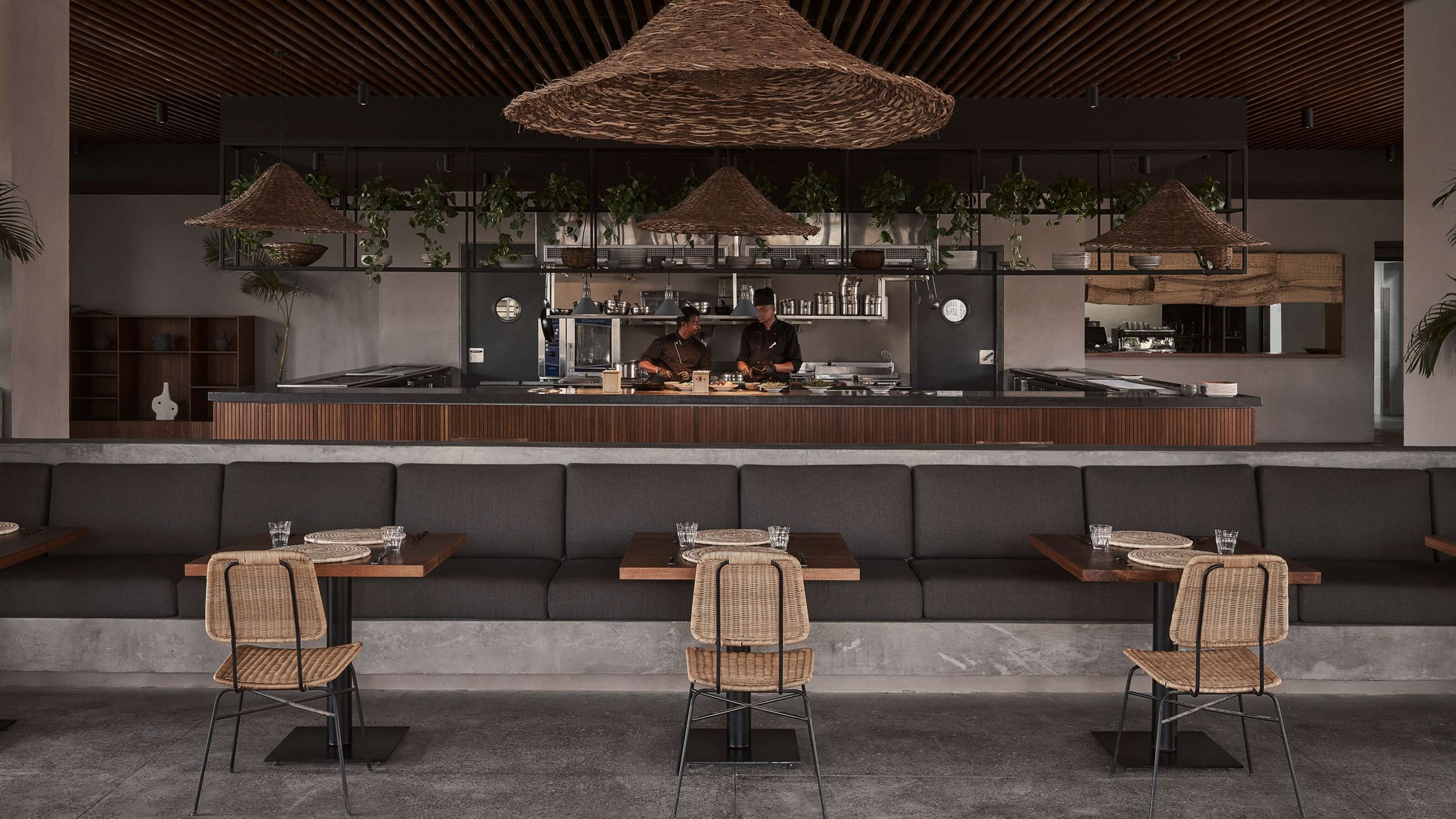 Everyone is encouraged to dig in at the Kitchen Club, the heart-of-the-hotel eatery where dishes are designed to be shared around. Behind a bank of dark countertops you can see the chefs busily creating away in the open kitchen; head chef Edwin Gomez hails from India and he’s added a few home comforts to the menu, such as tandoori and butter chicken curry. Otherwise, he’s cherry-picked from Egyptian, Arabic and Mediterranean favourites and more international dishes for good measure. Try locally loved hawawshi (pitta with minced meat, vegetables and herbs), mahshi (stuffed aubergine, peppers and courgette) or barbecued Red Sea mullet, alongside tomahawk steaks and filet mignon, pastas, burgers and mezze. The dining room is as stylish as the hotel’s other spaces, with wicker lighting and a wooden roof, but we like the terrace, which has squishy sofas in the shade of a bamboo pergola.