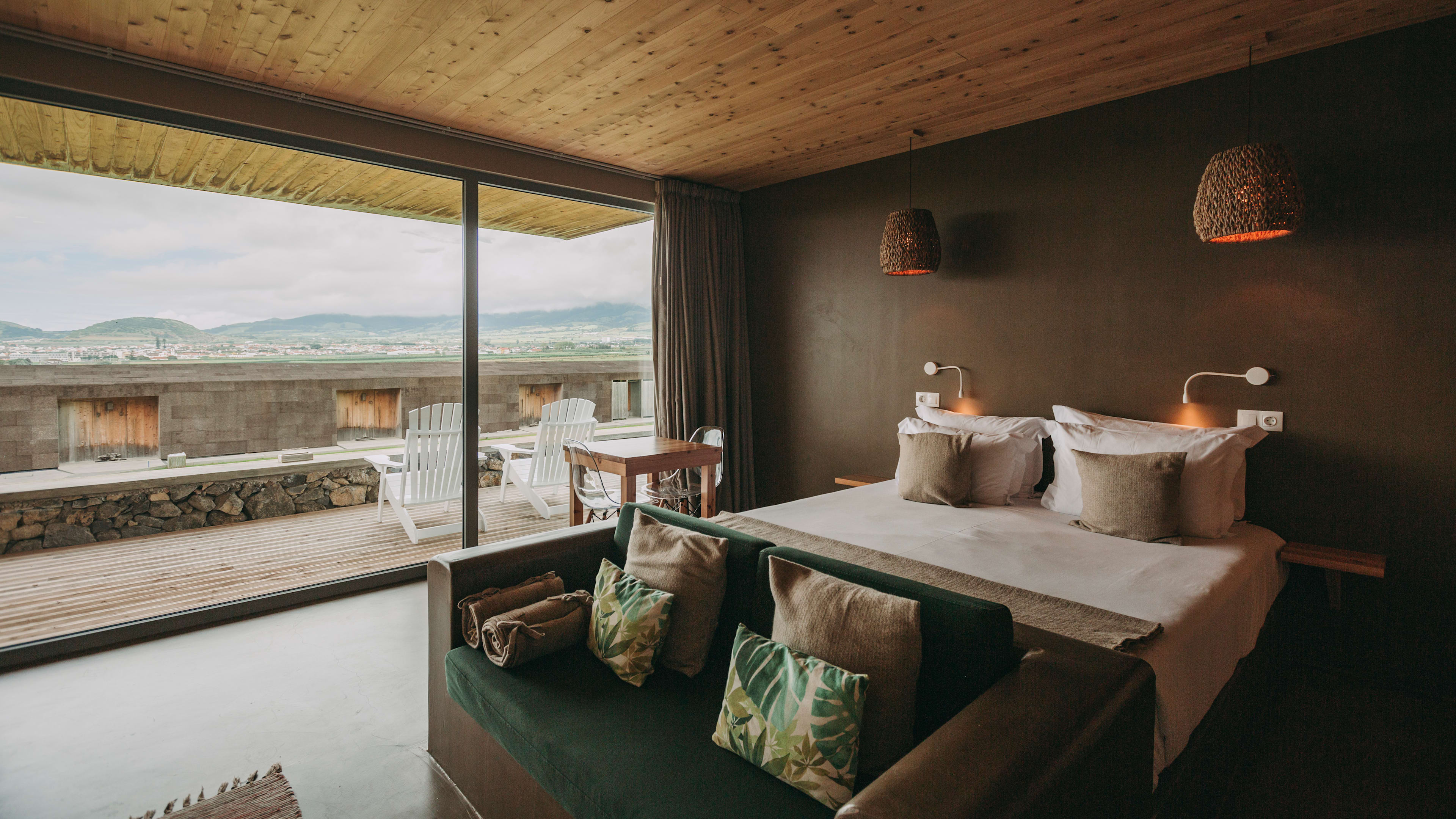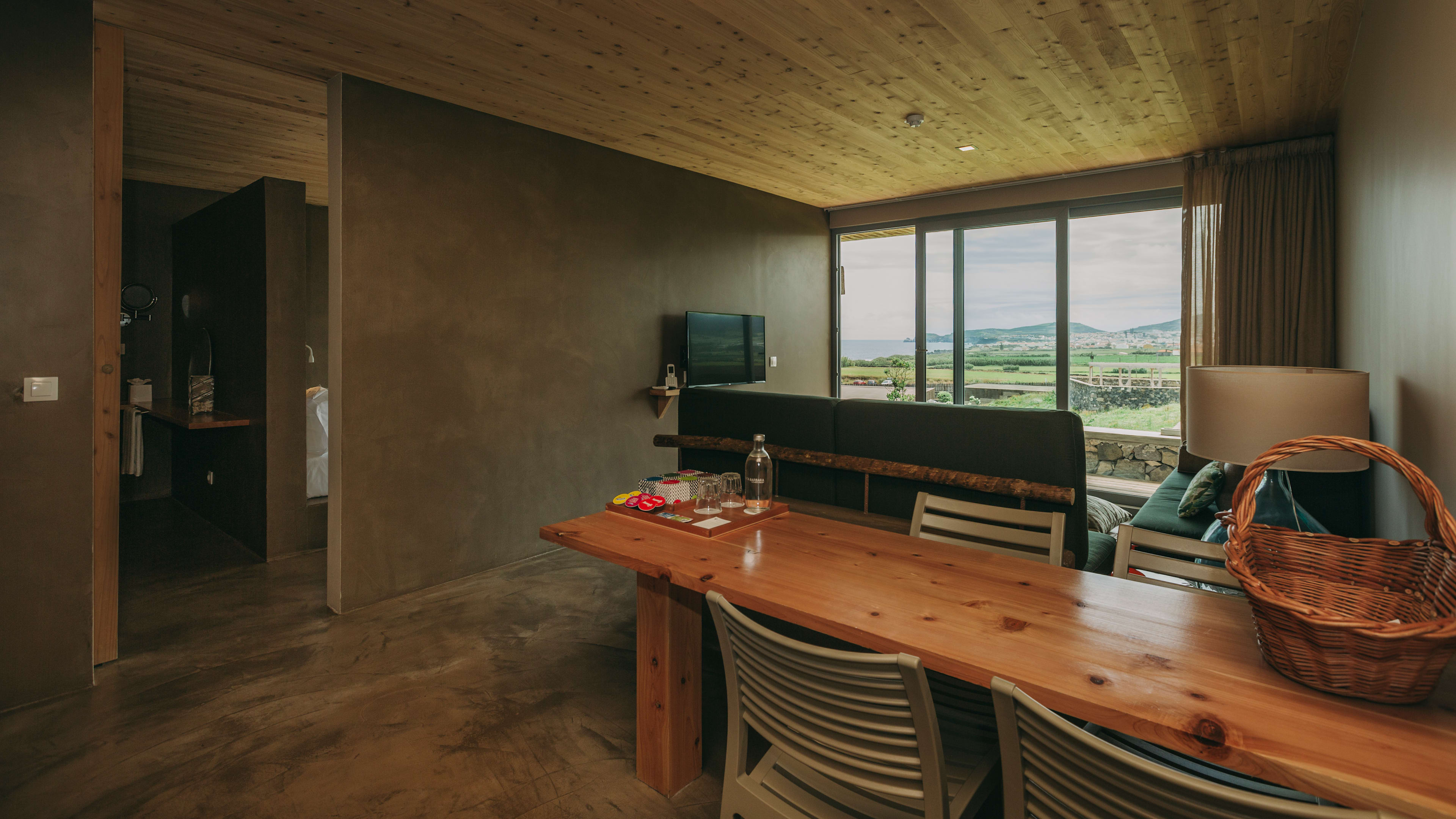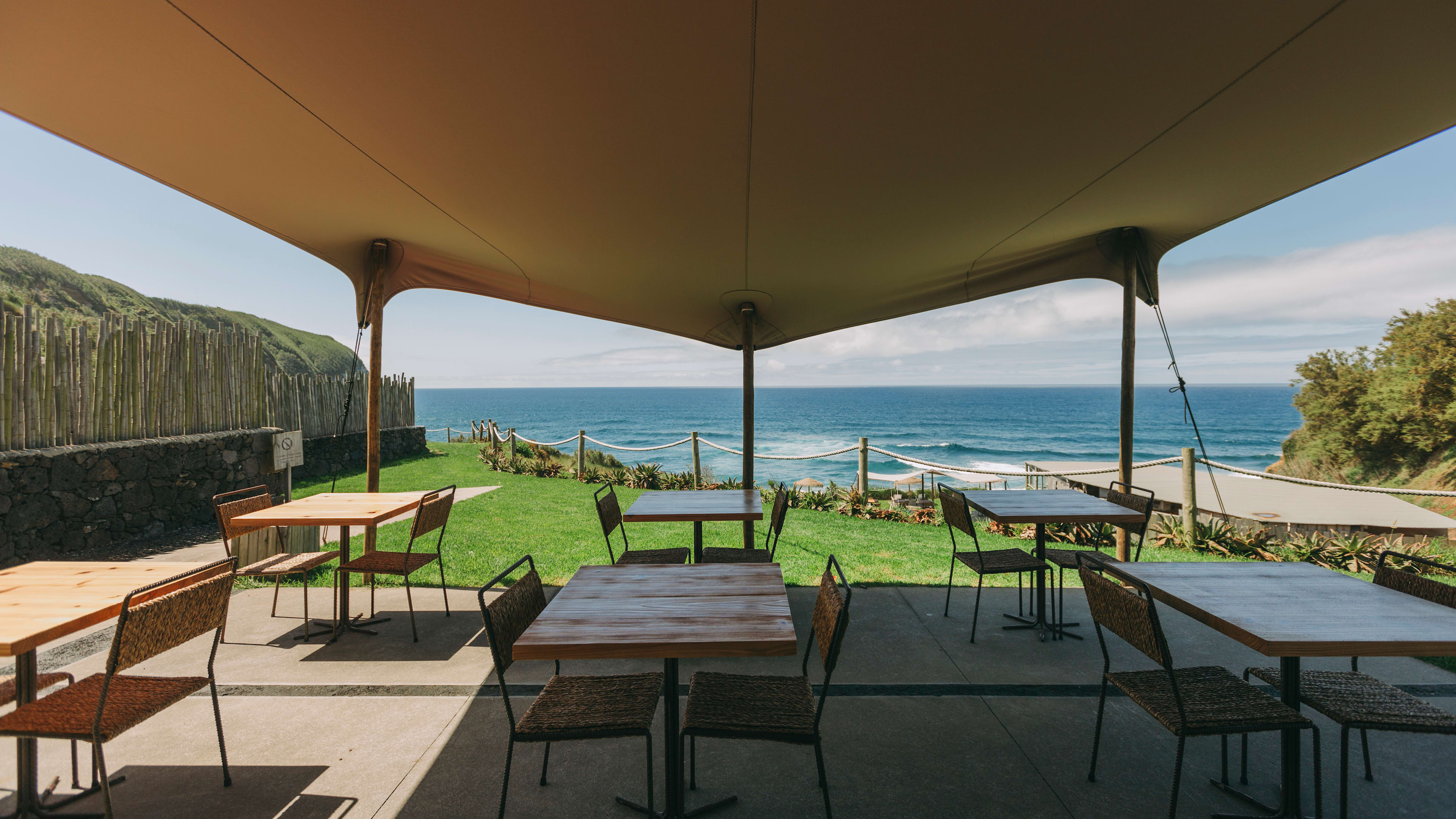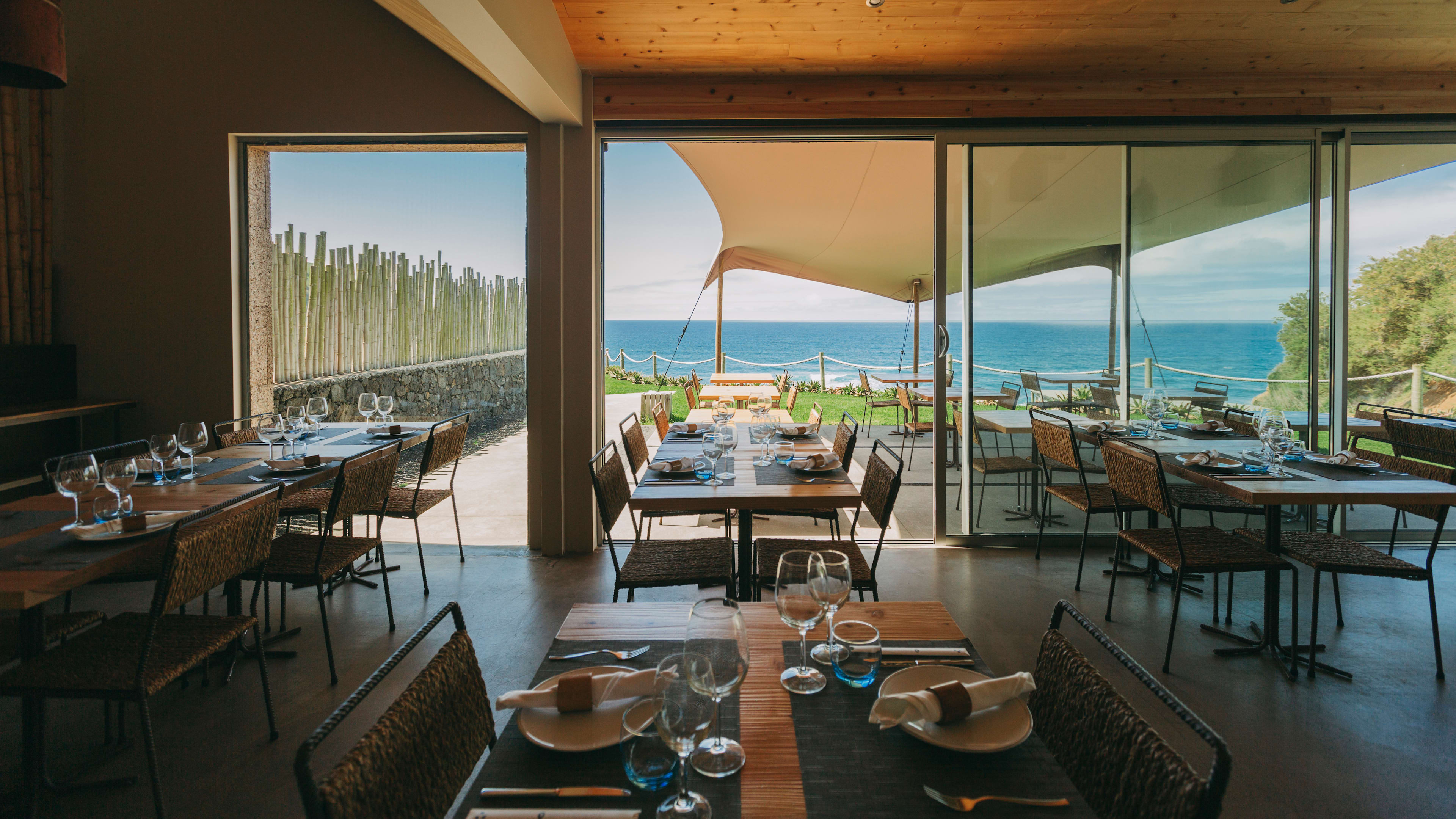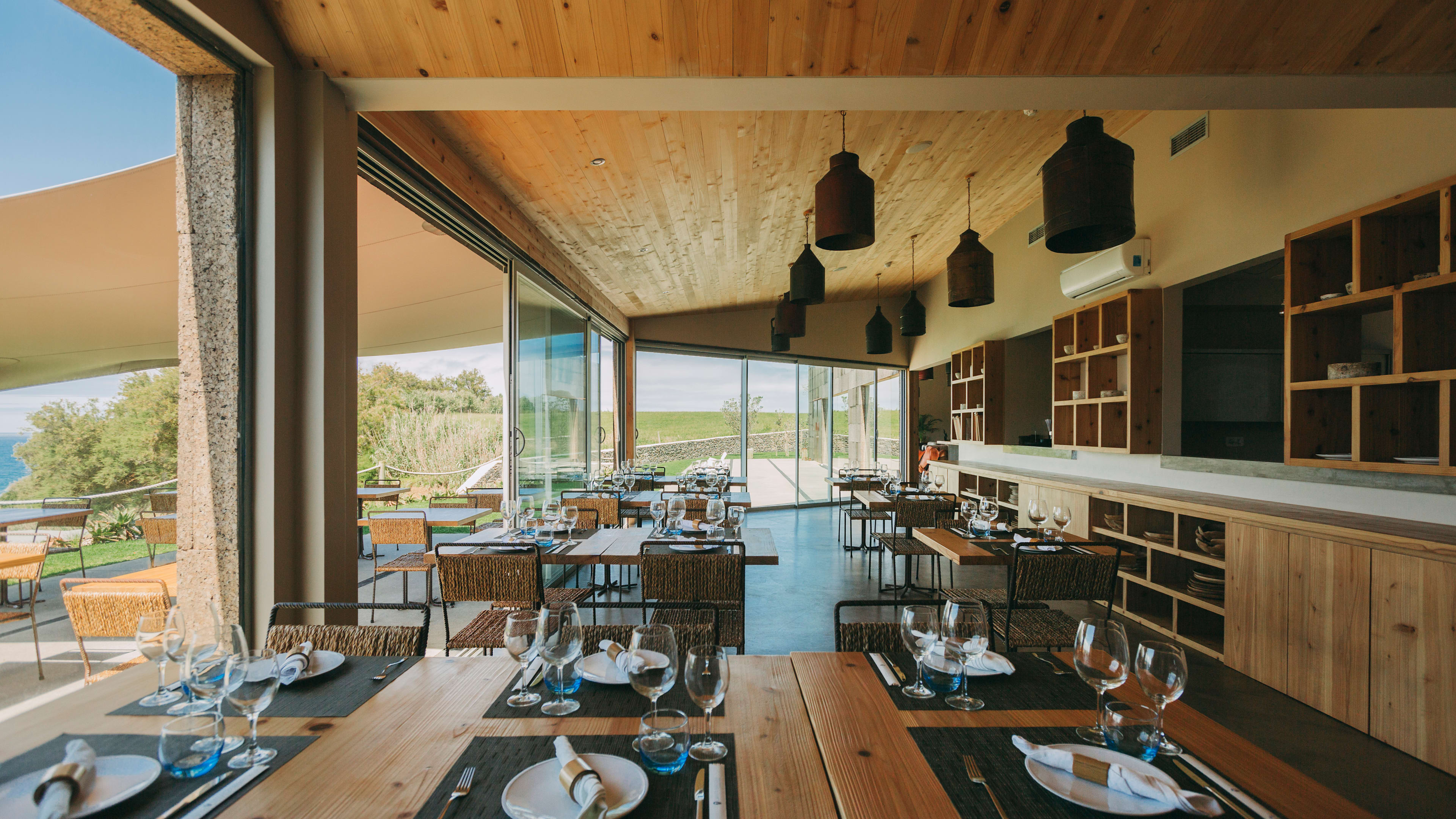 A free-flowing space that leads to the restaurant and the terrace, the resort’s bar is a panoramic spot for a light lunch, snacks or evening drinks. Here, canvas chairs are lined up to take in the sea view through floor-to-ceiling windows, and wood-framed sofas with calico upholstery beckon you to sink into them with an apéritif under the warm glow of pendant lights fashioned from repurposed oil containers. The cocktail menu includes all the classics, a good choice of gins and a handful of original concoctions with an emphasis on rum that befits its Azorean setting. On the wine list, you’ll find tipples from the Azores, Portugal and a good selection of organic bottles (wine tasting can be arranged through the concierge).