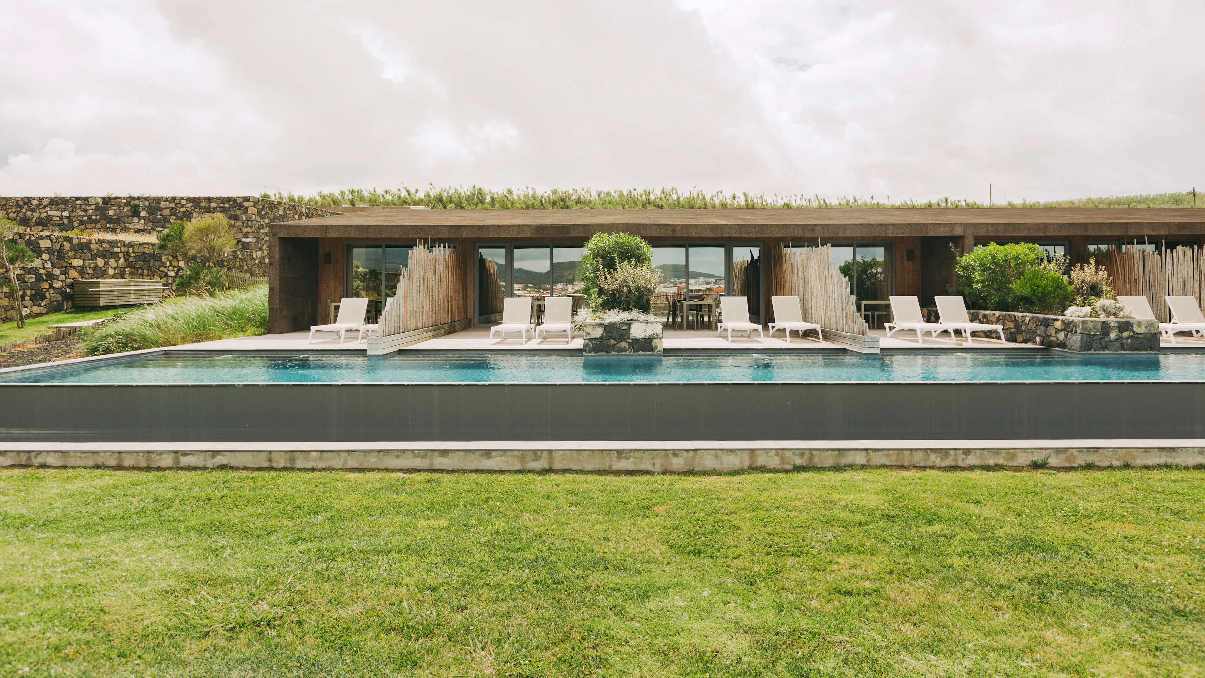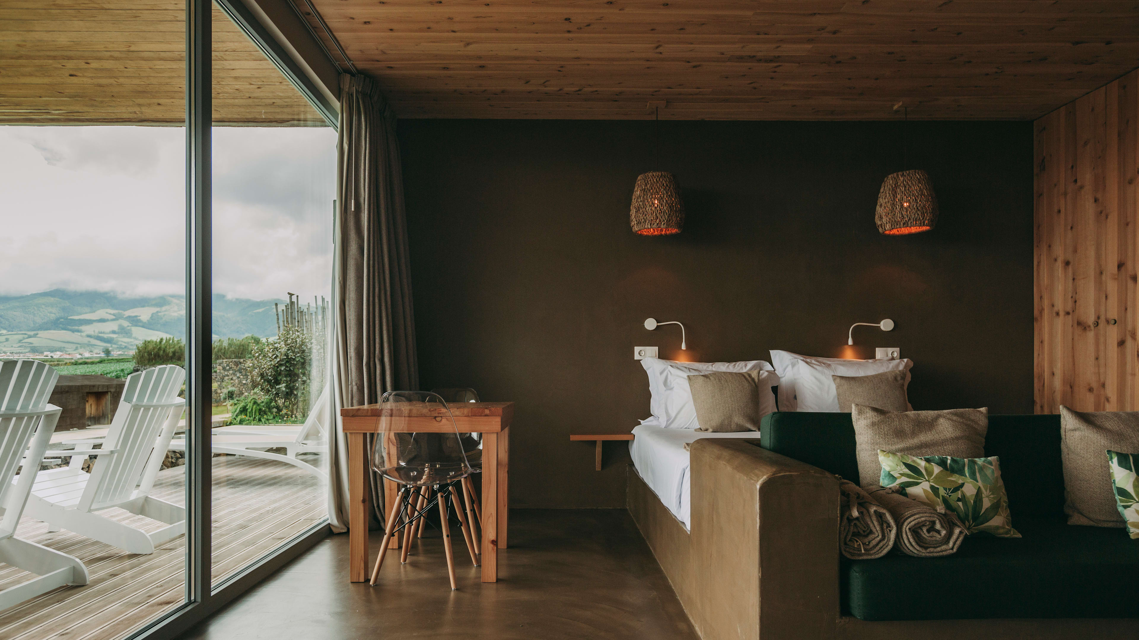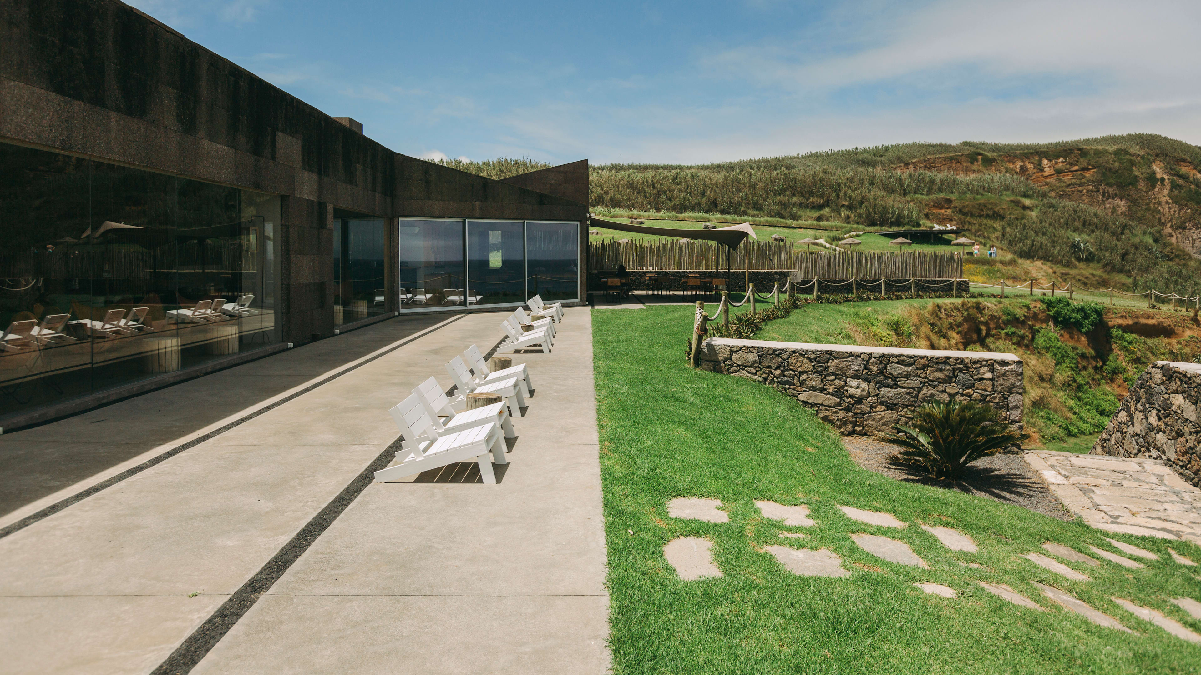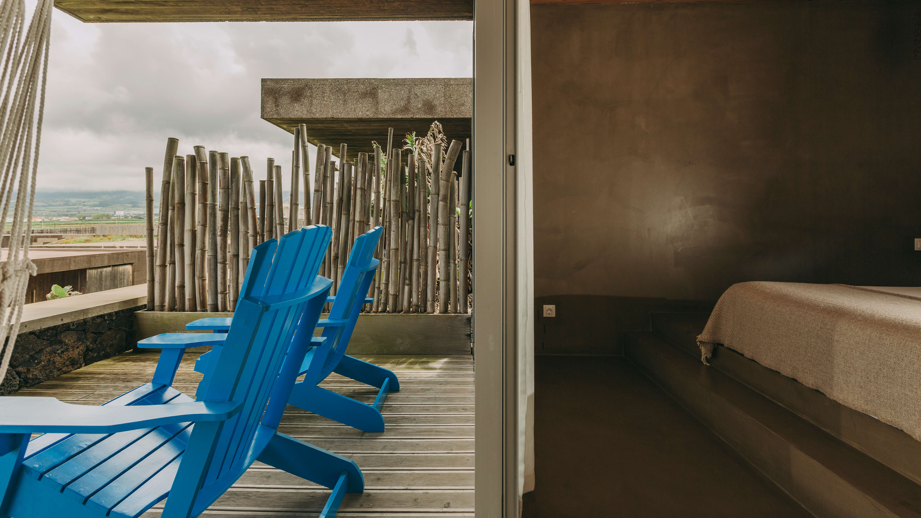 A free-flowing space that leads to the restaurant and the terrace, the resort’s bar is a panoramic spot for a light lunch, snacks or evening drinks. Here, canvas chairs are lined up to take in the sea view through floor-to-ceiling windows, and wood-framed sofas with calico upholstery beckon you to sink into them with an apéritif under the warm glow of pendant lights fashioned from repurposed oil containers. The cocktail menu includes all the classics, a good choice of gins and a handful of original concoctions with an emphasis on rum that befits its Azorean setting. On the wine list, you’ll find tipples from the Azores, Portugal and a good selection of organic bottles (wine tasting can be arranged through the concierge).