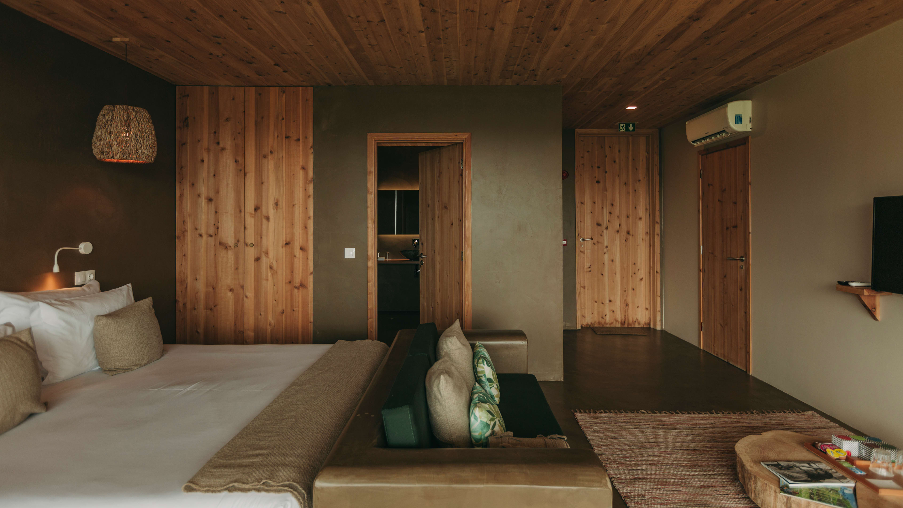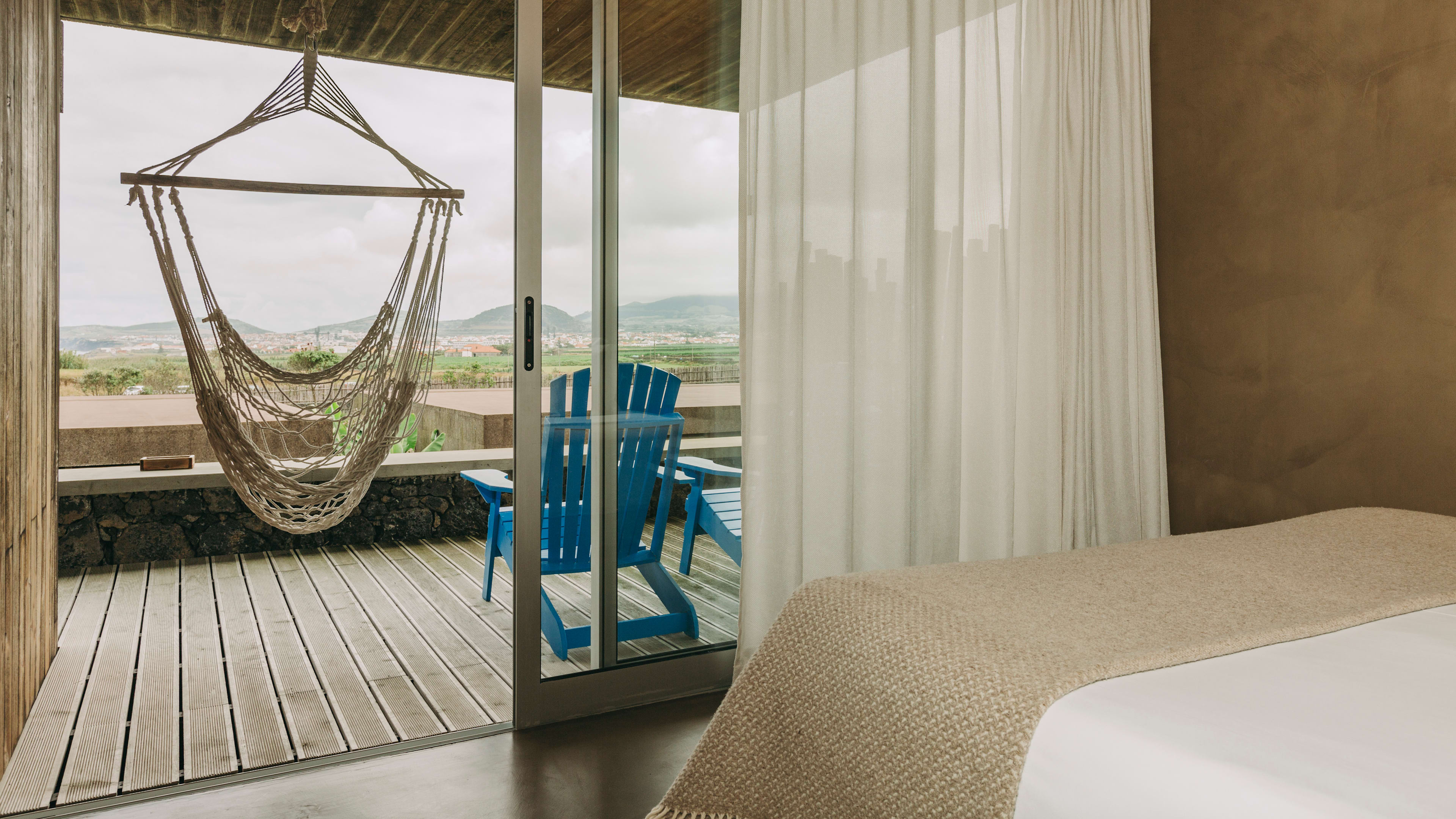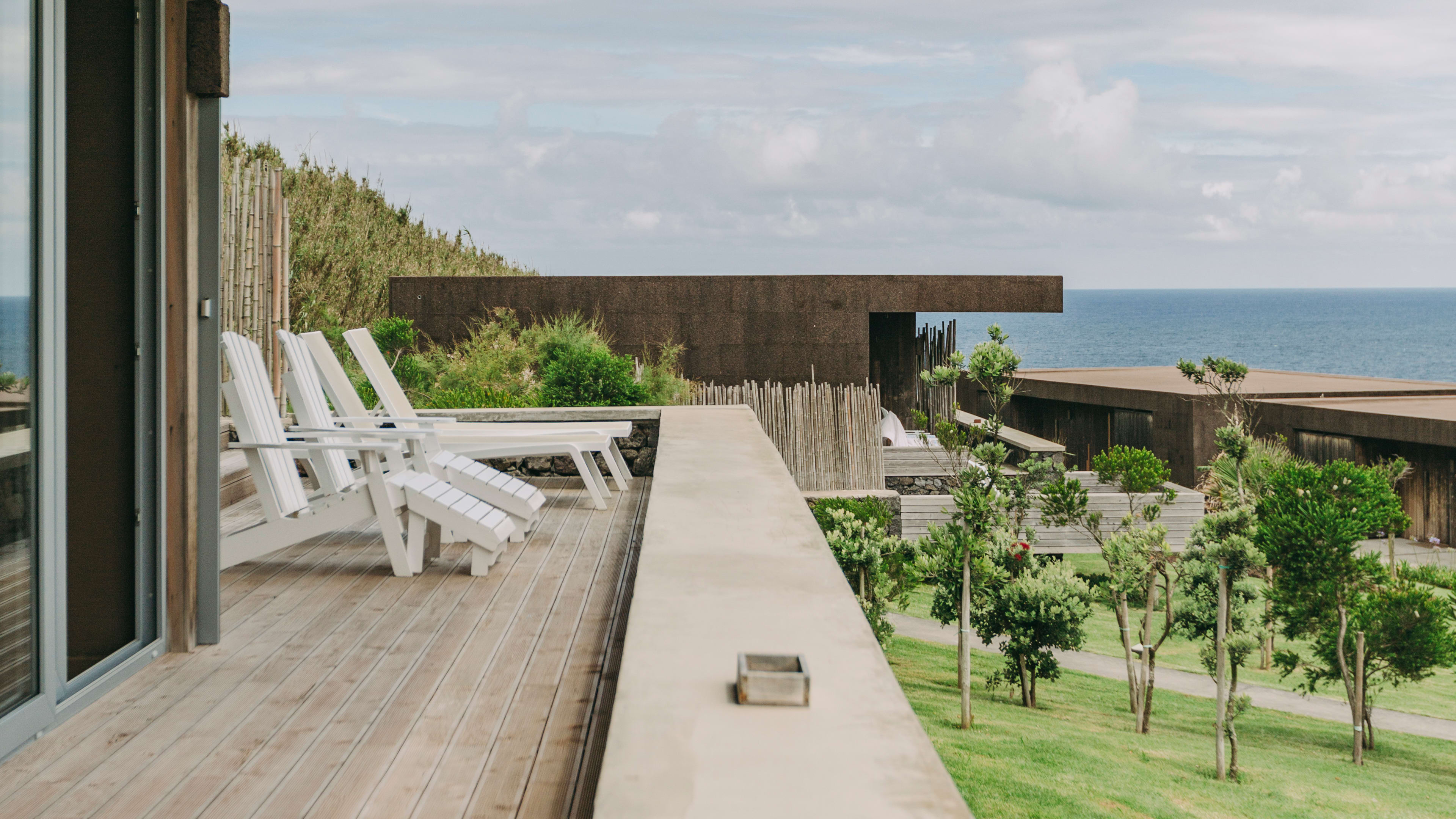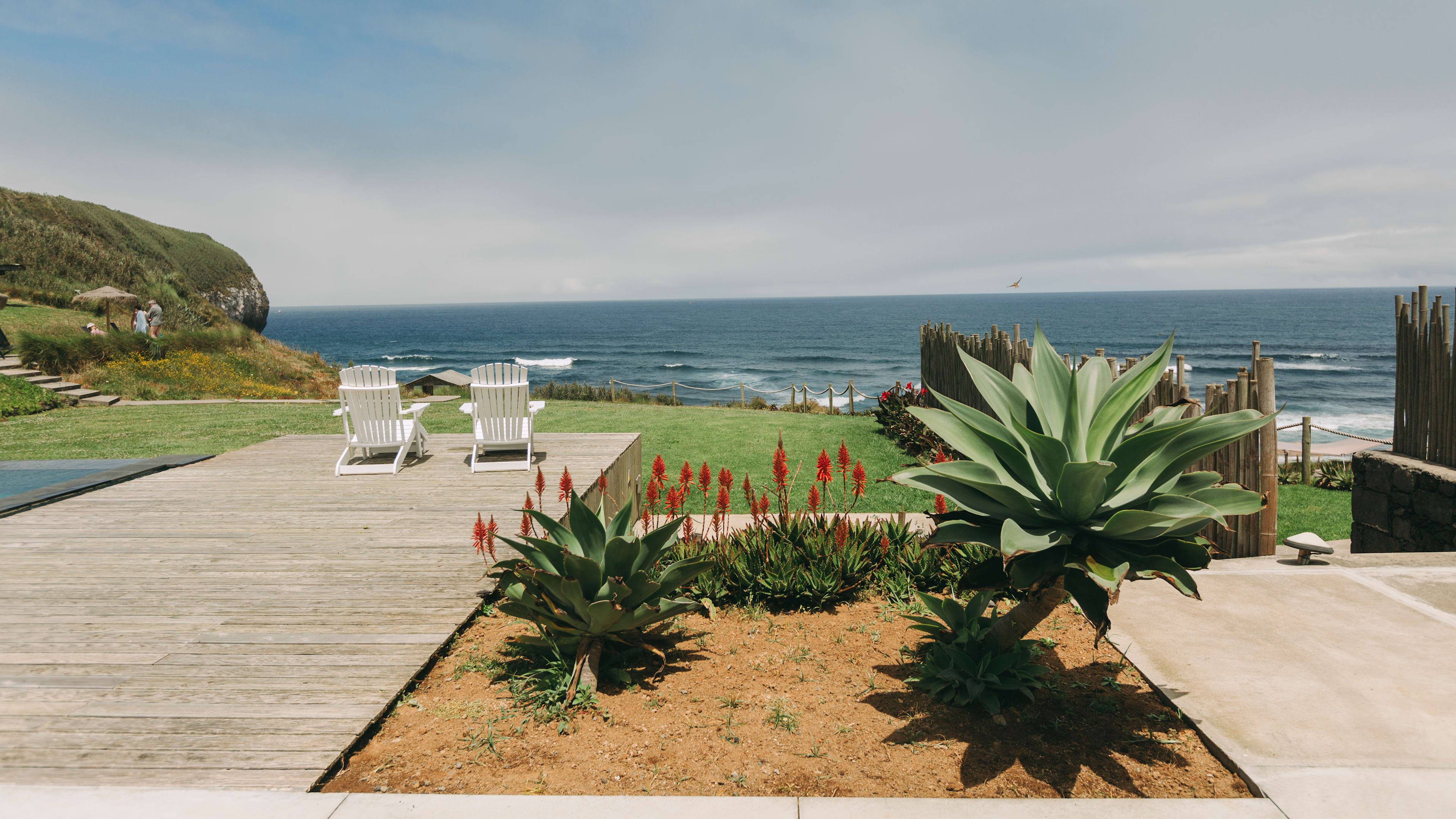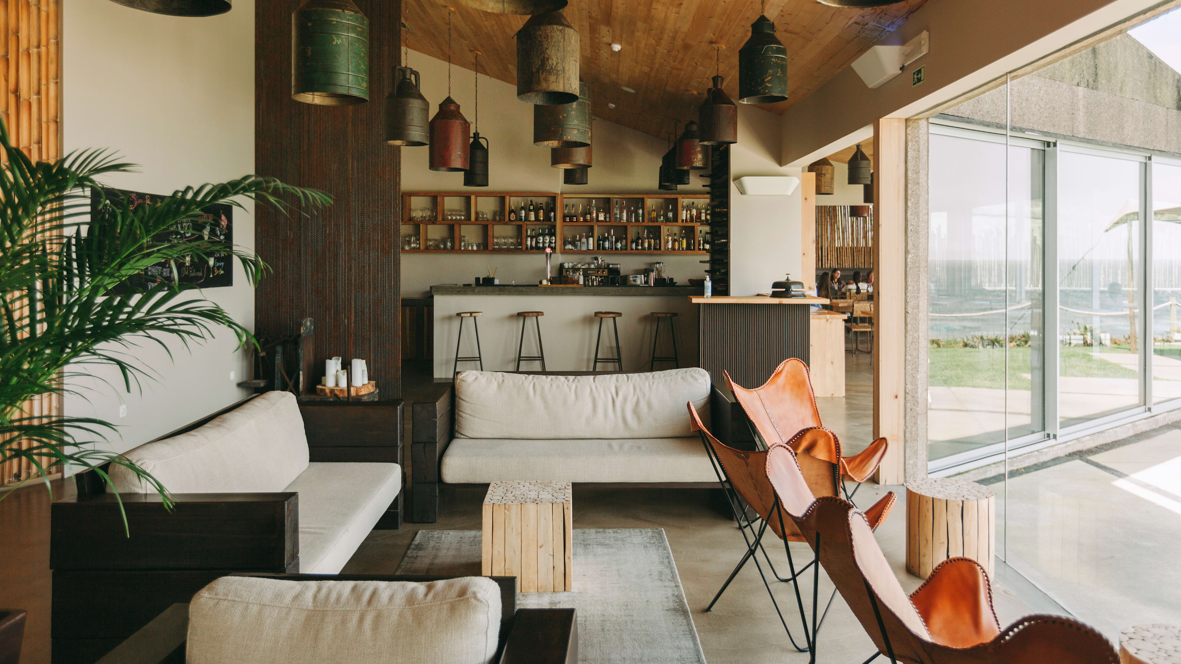 A free-flowing space that leads to the restaurant and the terrace, the resort’s bar is a panoramic spot for a light lunch, snacks or evening drinks. Here, canvas chairs are lined up to take in the sea view through floor-to-ceiling windows, and wood-framed sofas with calico upholstery beckon you to sink into them with an apéritif under the warm glow of pendant lights fashioned from repurposed oil containers. The cocktail menu includes all the classics, a good choice of gins and a handful of original concoctions with an emphasis on rum that befits its Azorean setting. On the wine list, you’ll find tipples from the Azores, Portugal and a good selection of organic bottles (wine tasting can be arranged through the concierge).
