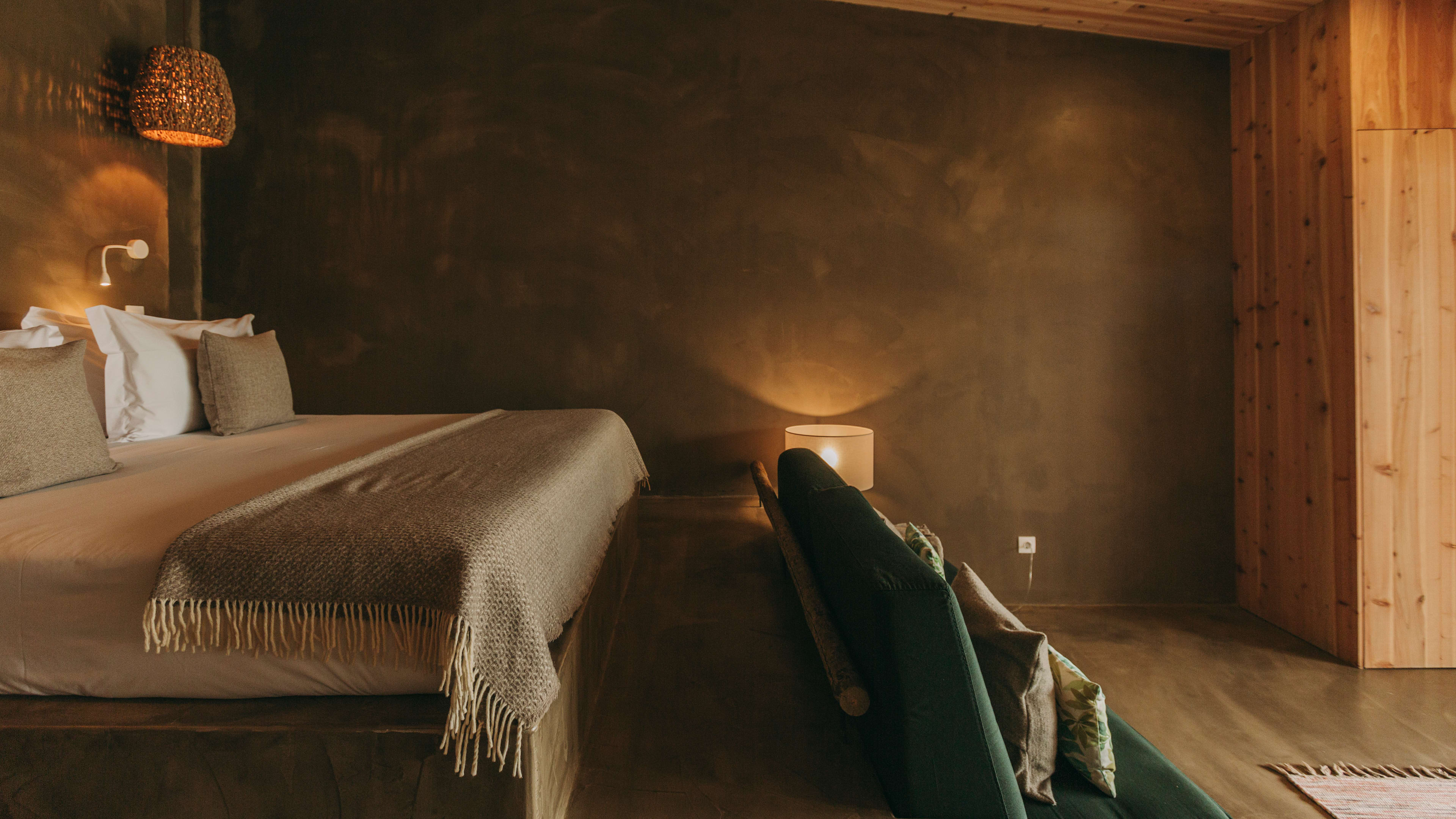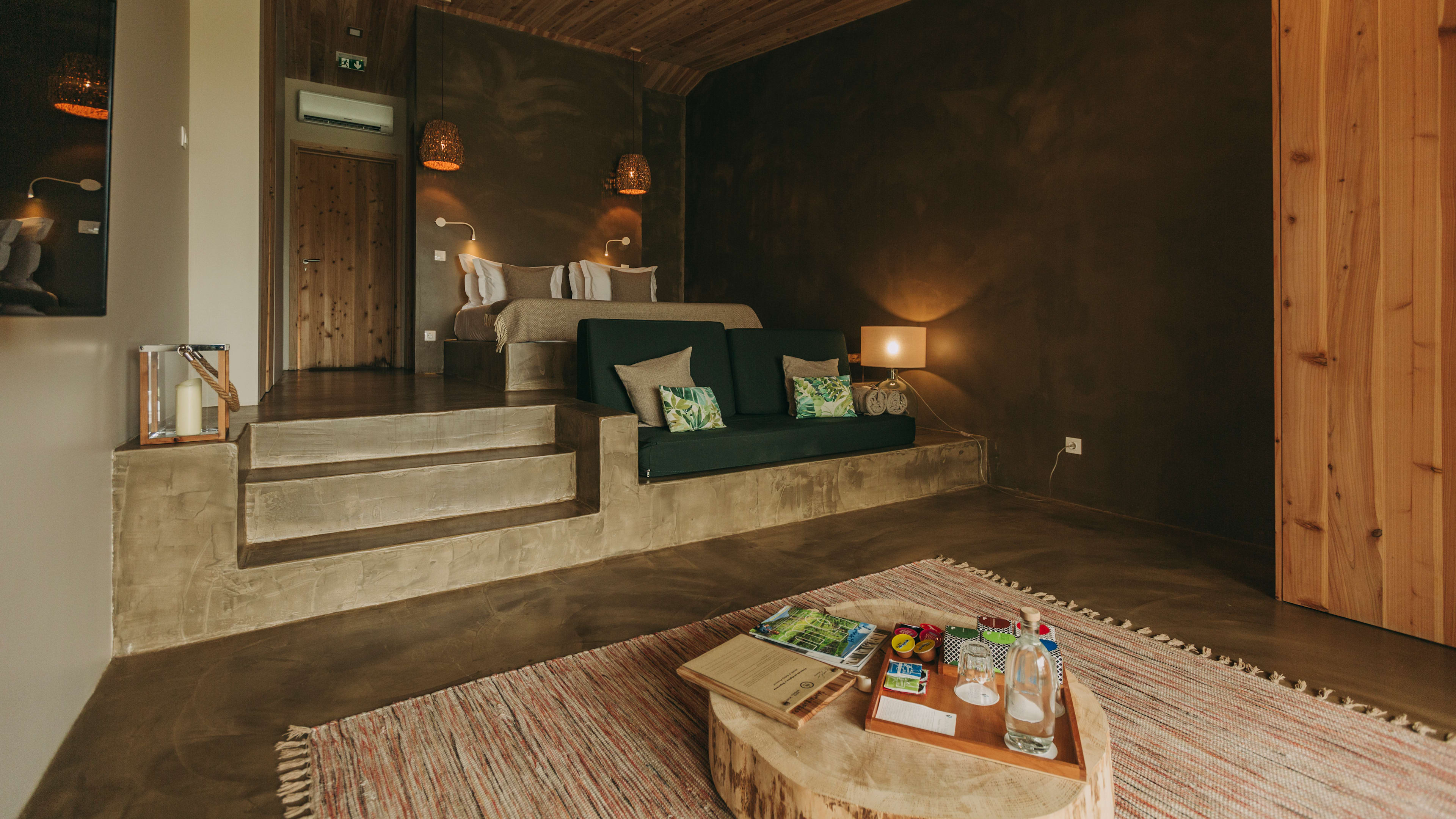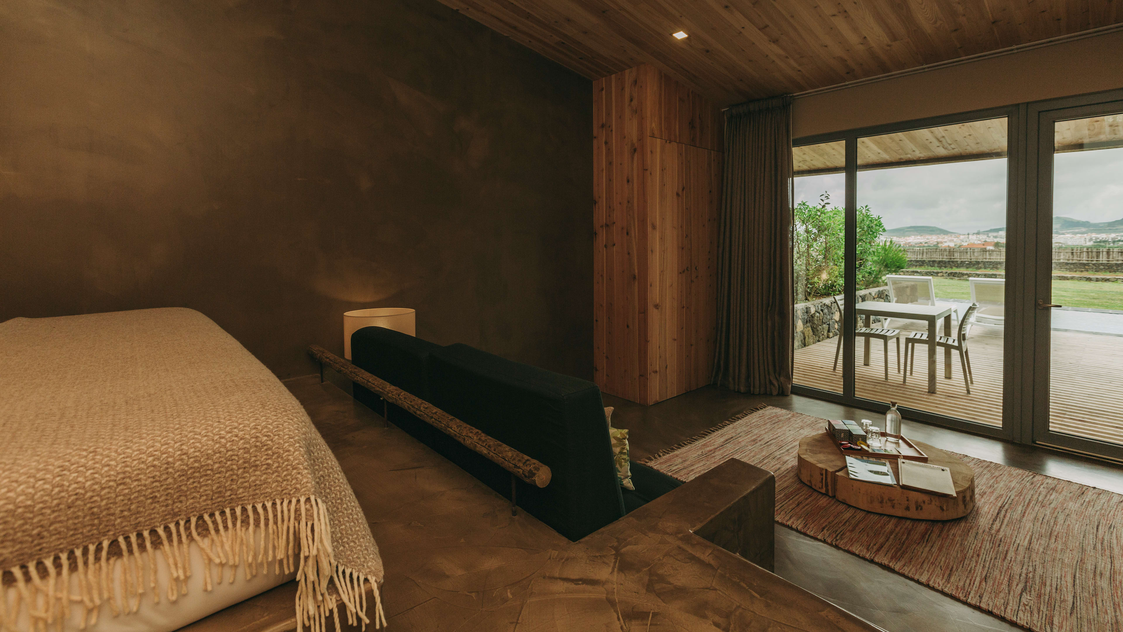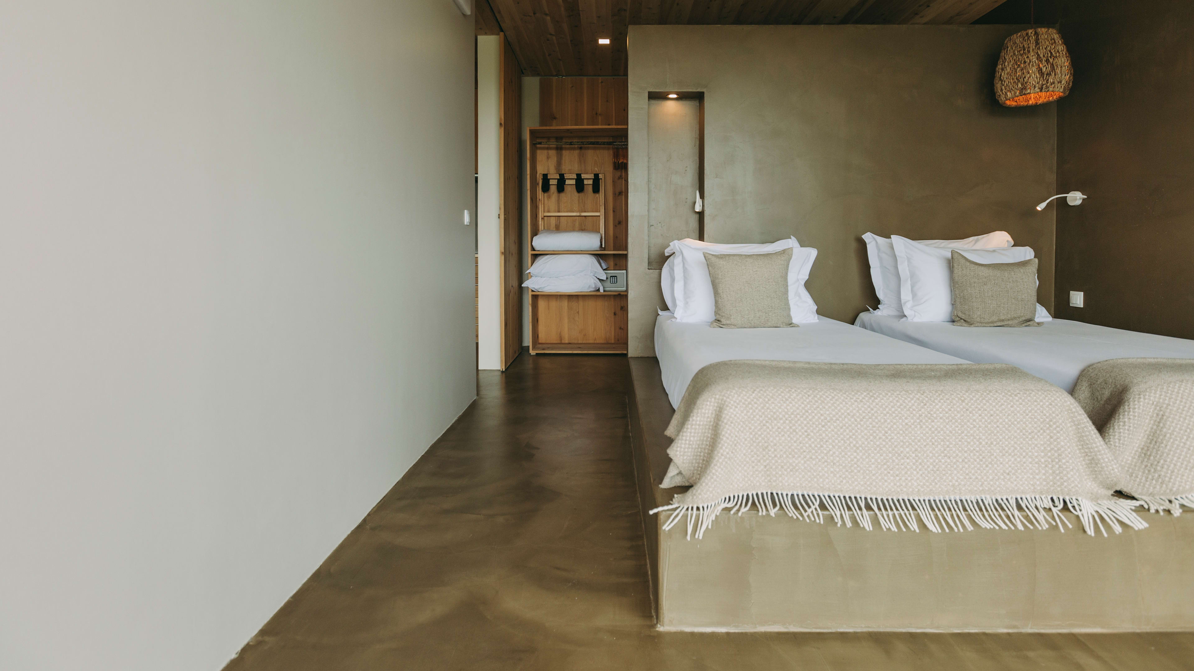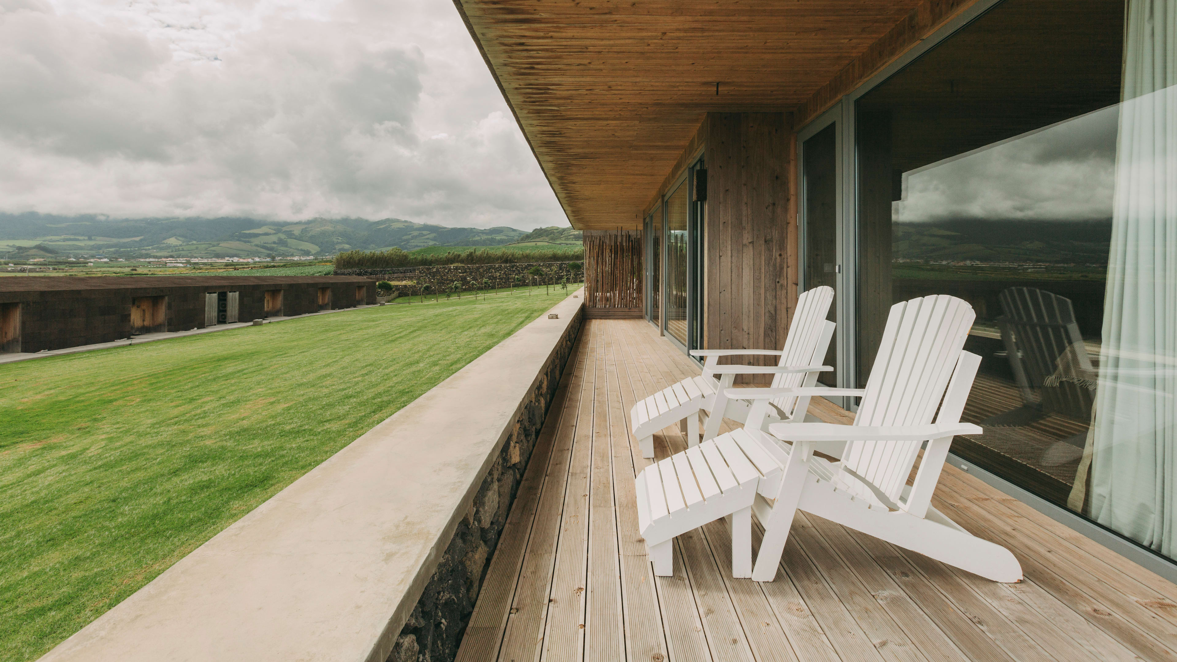 A free-flowing space that leads to the restaurant and the terrace, the resort’s bar is a panoramic spot for a light lunch, snacks or evening drinks. Here, canvas chairs are lined up to take in the sea view through floor-to-ceiling windows, and wood-framed sofas with calico upholstery beckon you to sink into them with an apéritif under the warm glow of pendant lights fashioned from repurposed oil containers. The cocktail menu includes all the classics, a good choice of gins and a handful of original concoctions with an emphasis on rum that befits its Azorean setting. On the wine list, you’ll find tipples from the Azores, Portugal and a good selection of organic bottles (wine tasting can be arranged through the concierge).