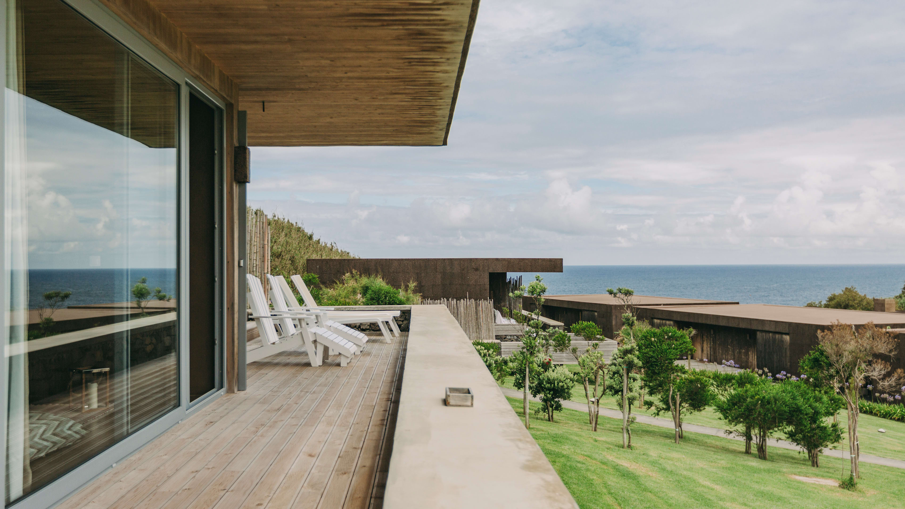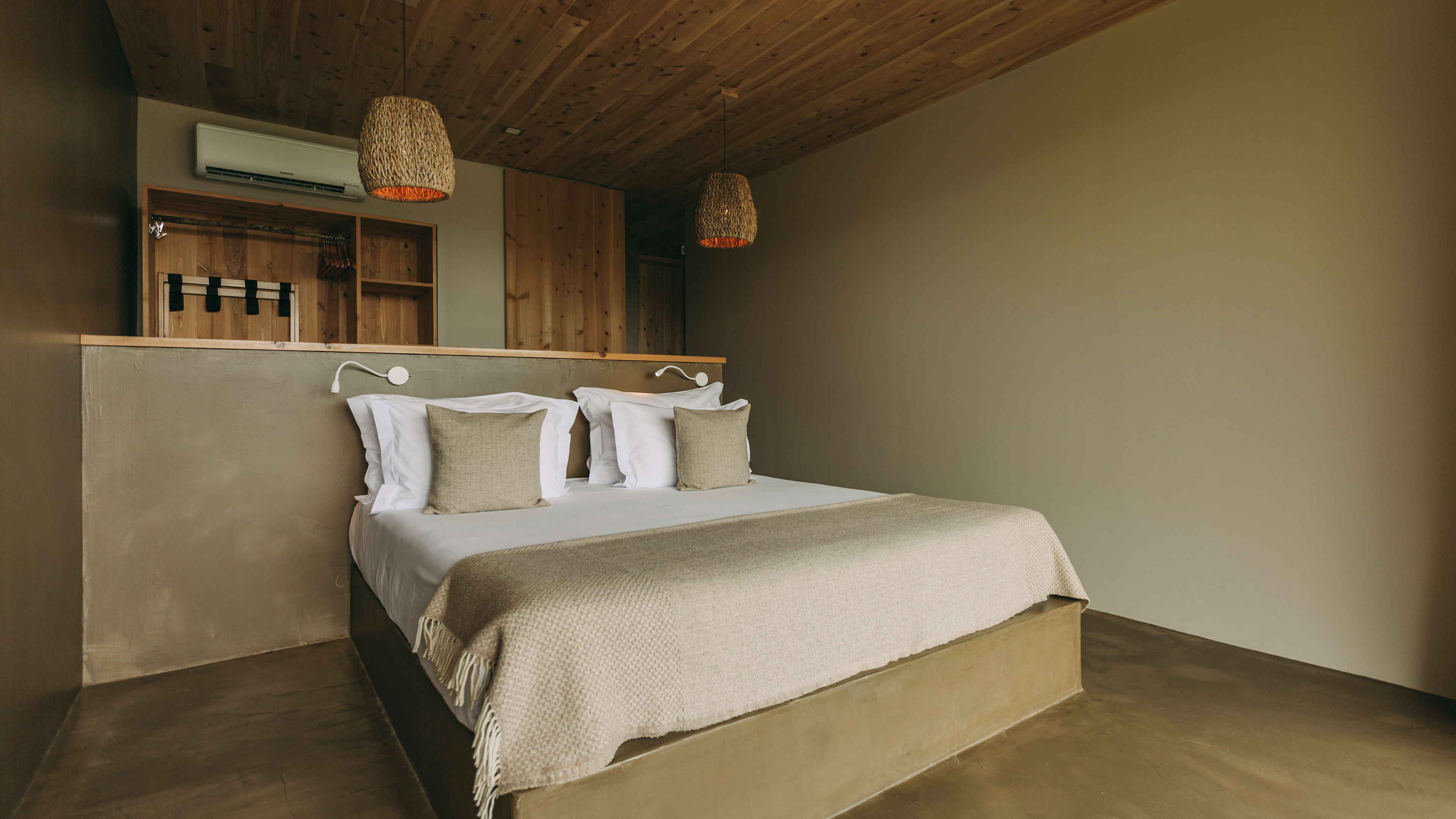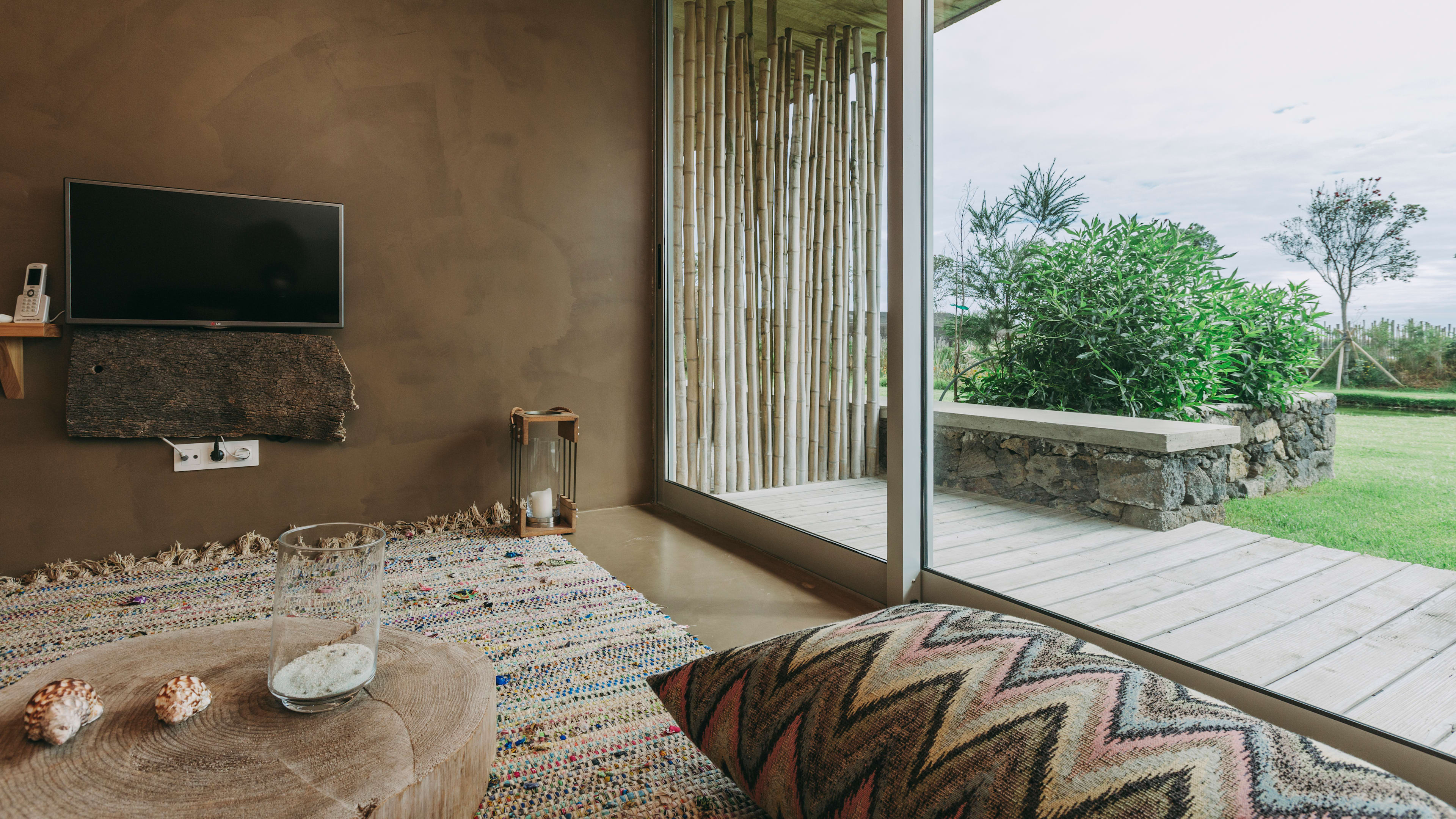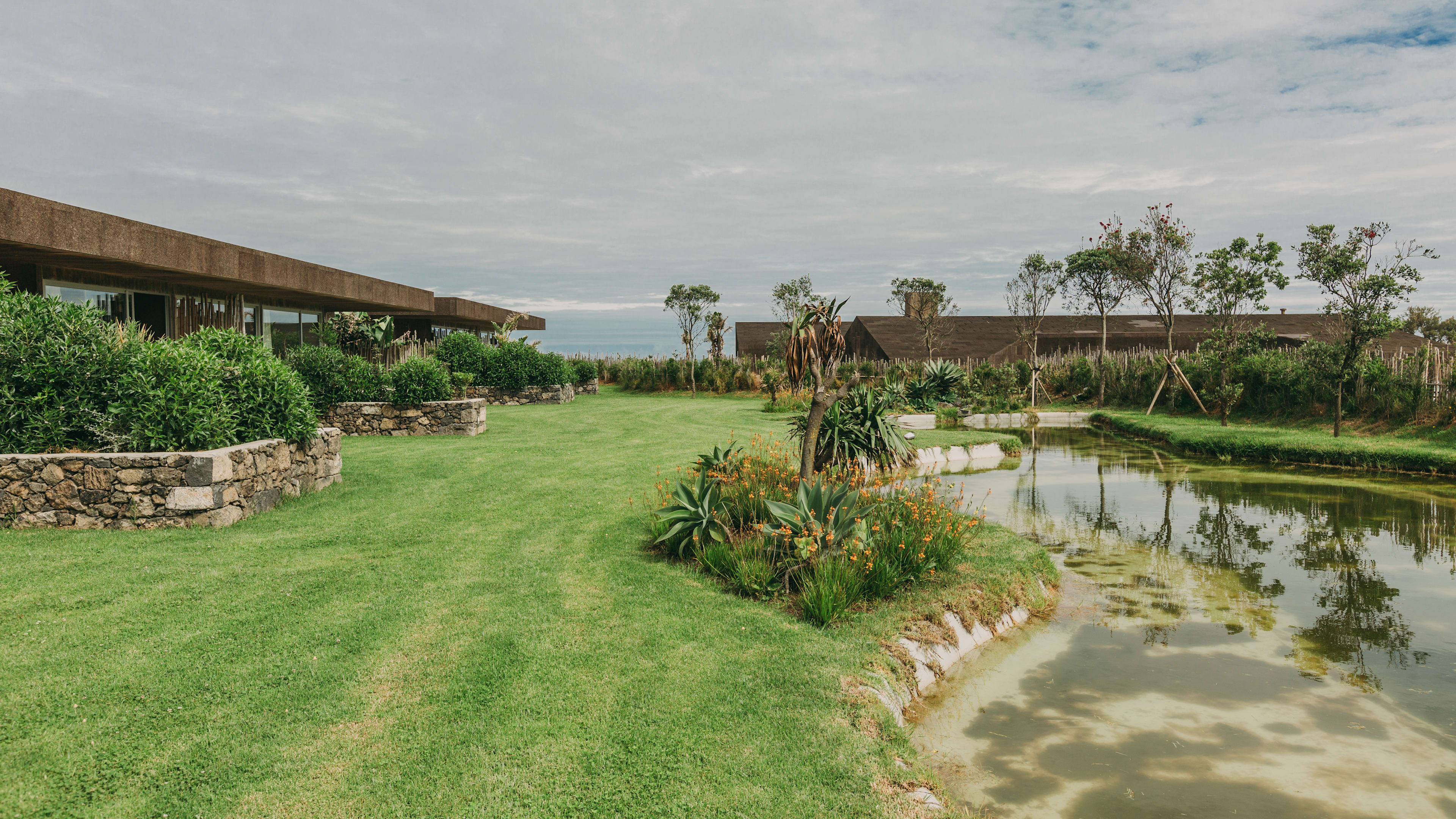 A free-flowing space that leads to the restaurant and the terrace, the resort’s bar is a panoramic spot for a light lunch, snacks or evening drinks. Here, canvas chairs are lined up to take in the sea view through floor-to-ceiling windows, and wood-framed sofas with calico upholstery beckon you to sink into them with an apéritif under the warm glow of pendant lights fashioned from repurposed oil containers. The cocktail menu includes all the classics, a good choice of gins and a handful of original concoctions with an emphasis on rum that befits its Azorean setting. On the wine list, you’ll find tipples from the Azores, Portugal and a good selection of organic bottles (wine tasting can be arranged through the concierge).