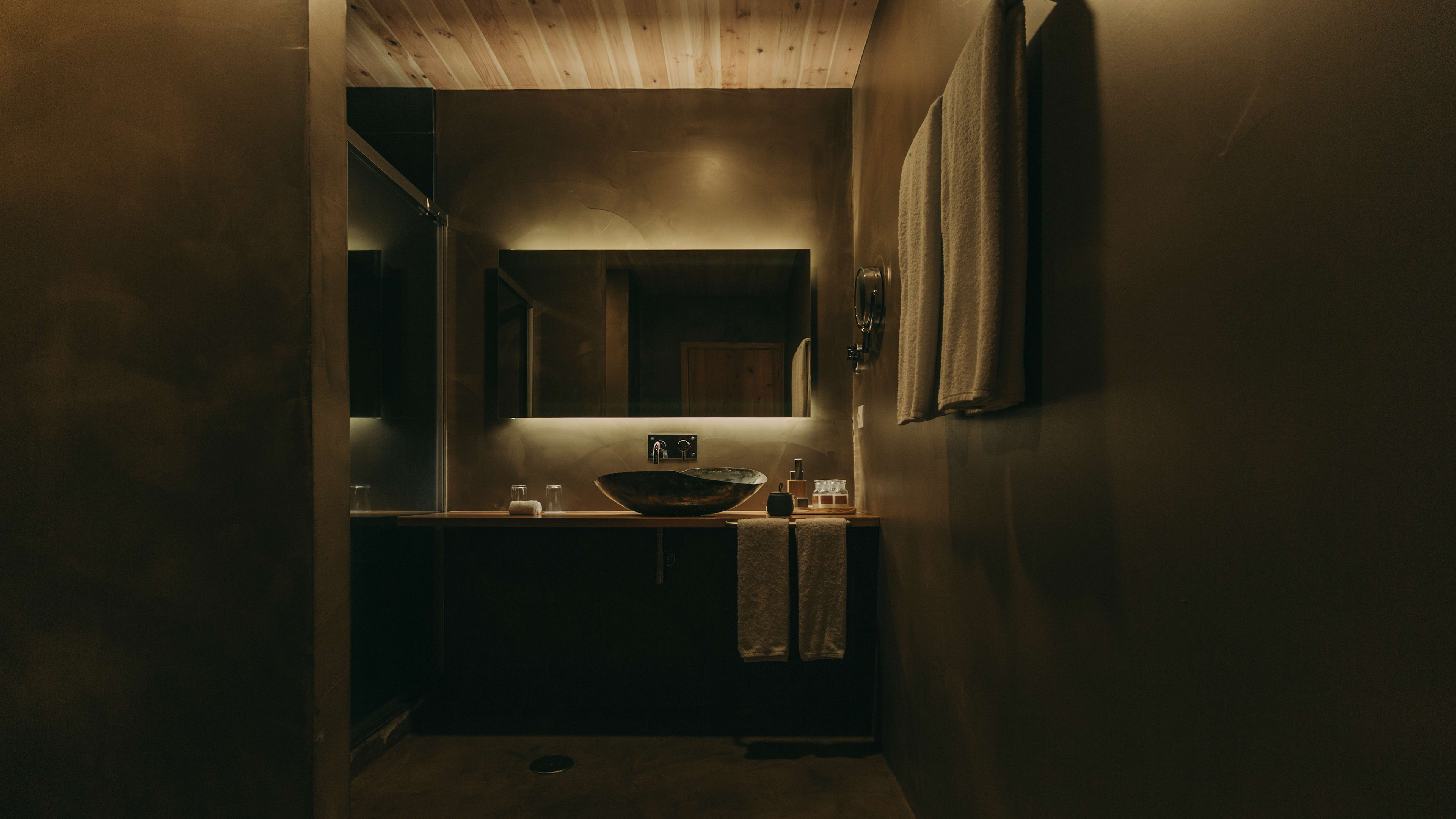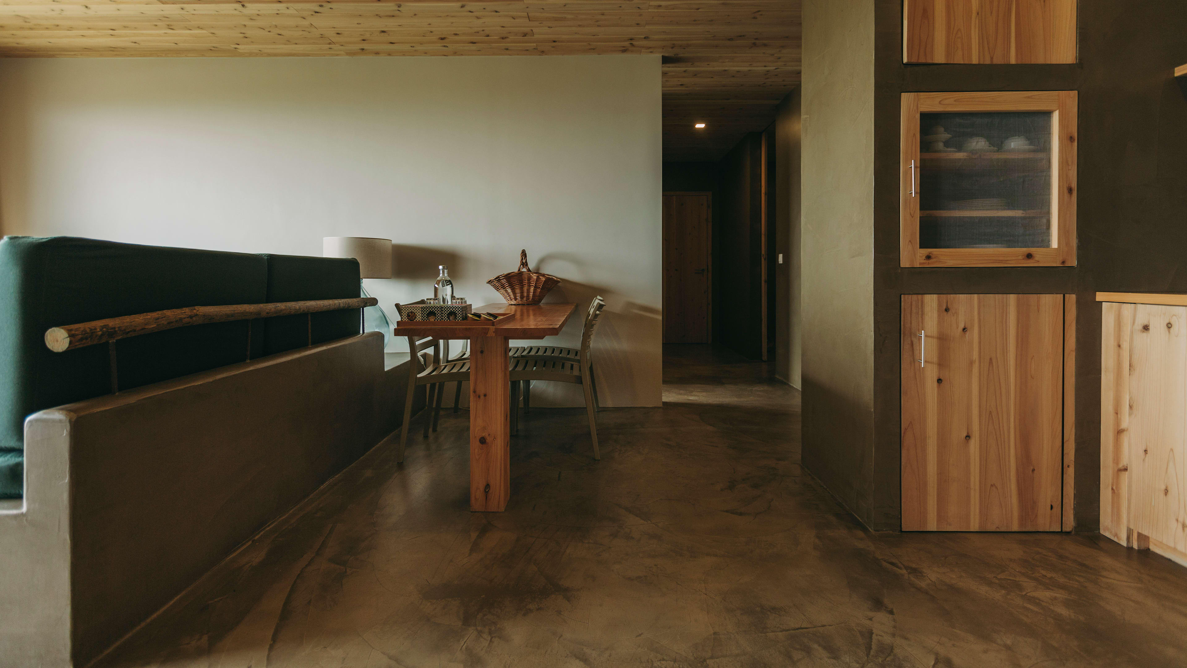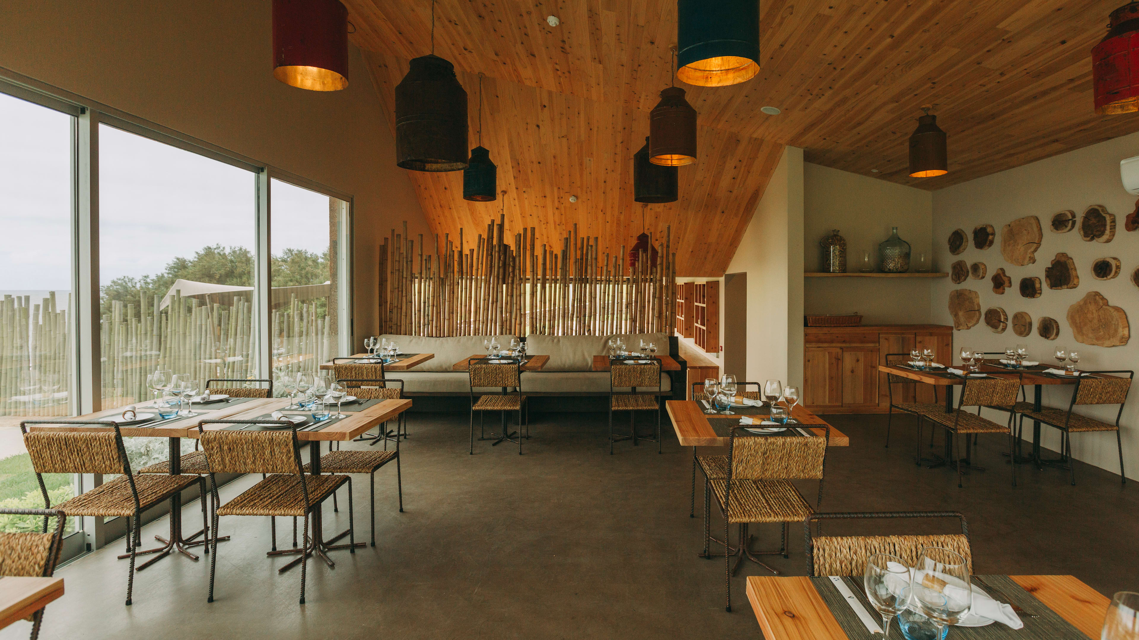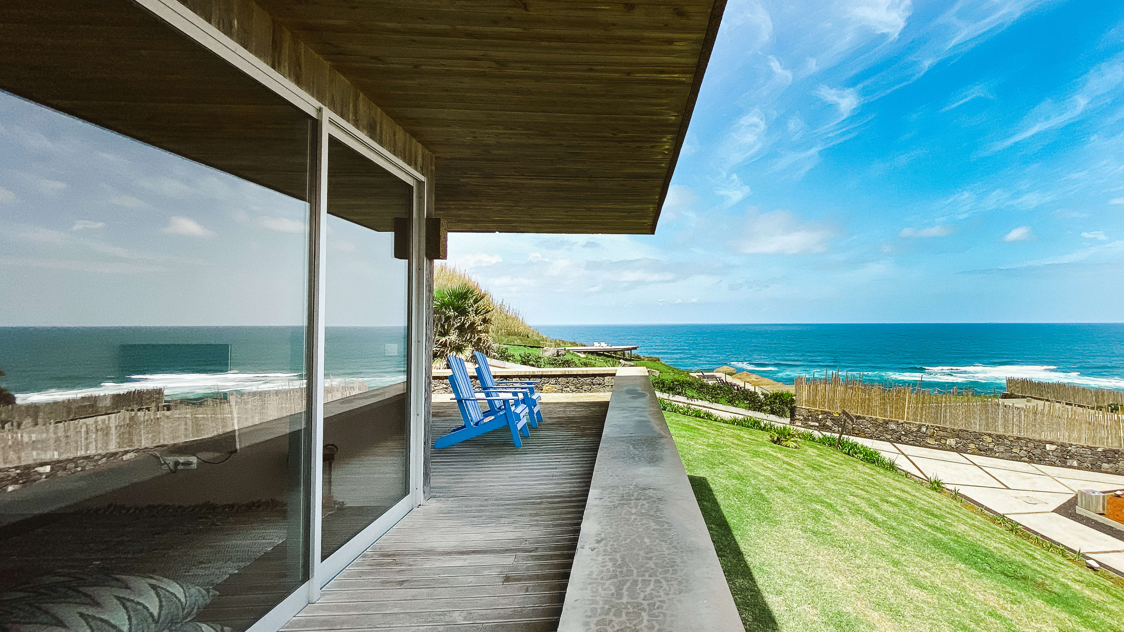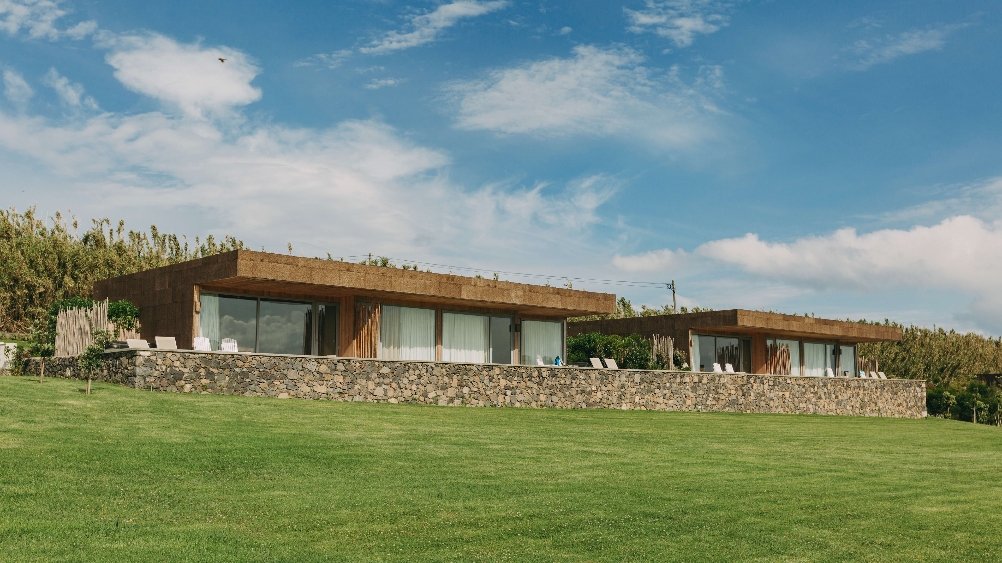A free-flowing space that leads to the restaurant and the terrace, the resort’s bar is a panoramic spot for a light lunch, snacks or evening drinks. Here, canvas chairs are lined up to take in the sea view through floor-to-ceiling windows, and wood-framed sofas with calico upholstery beckon you to sink into them with an apéritif under the warm glow of pendant lights fashioned from repurposed oil containers. The cocktail menu includes all the classics, a good choice of gins and a handful of original concoctions with an emphasis on rum that befits its Azorean setting. On the wine list, you’ll find tipples from the Azores, Portugal and a good selection of organic bottles (wine tasting can be arranged through the concierge).
