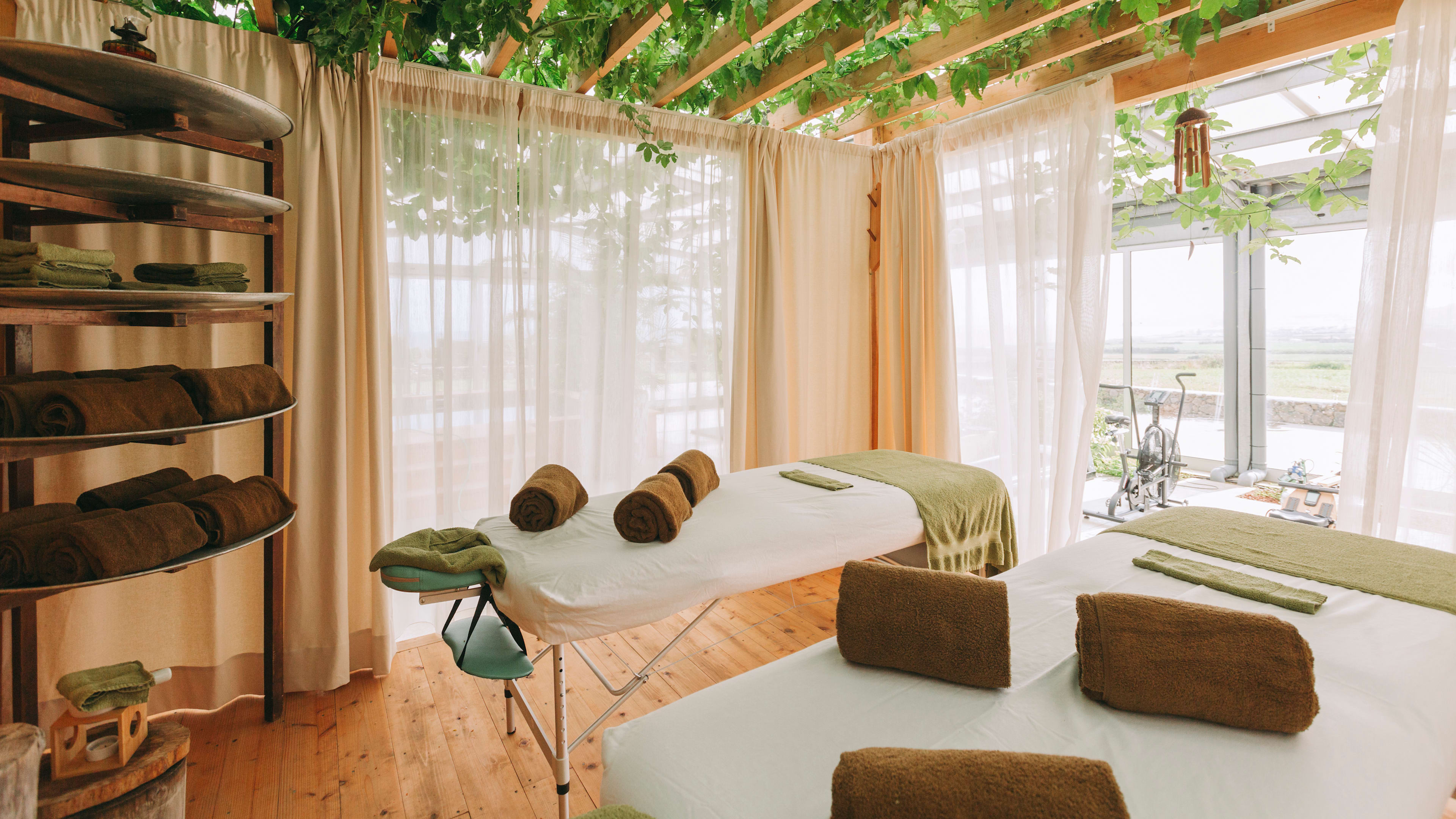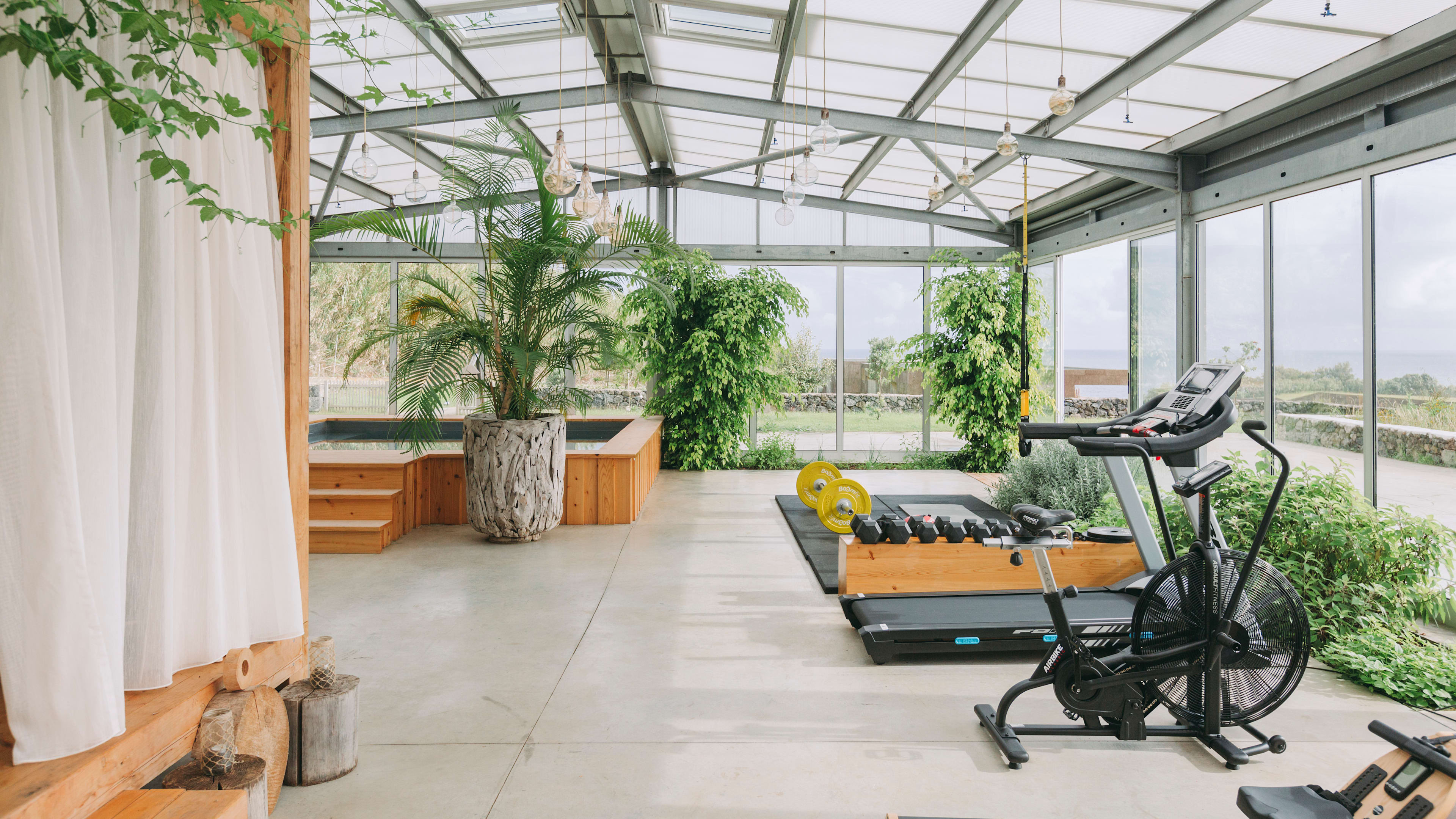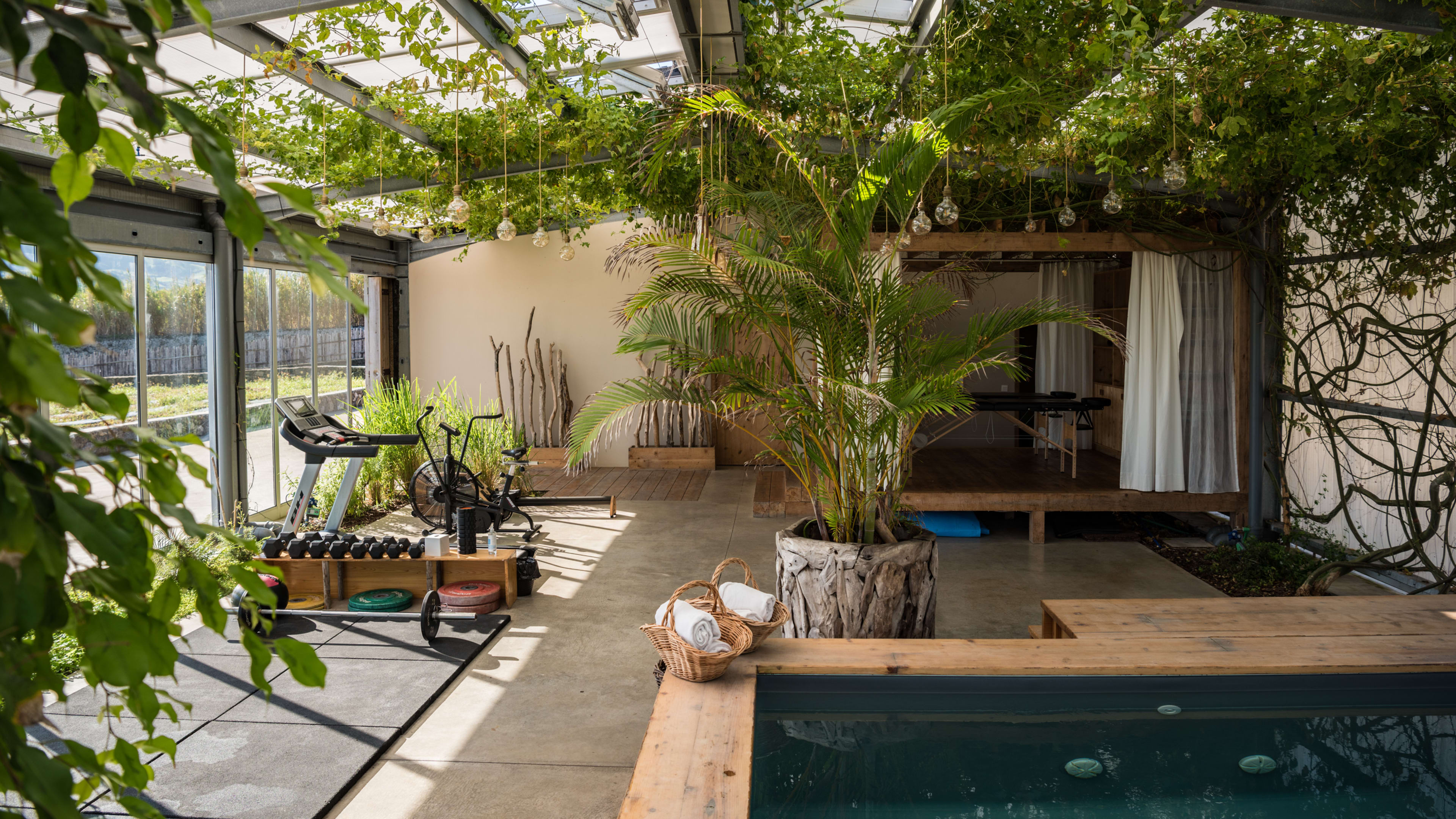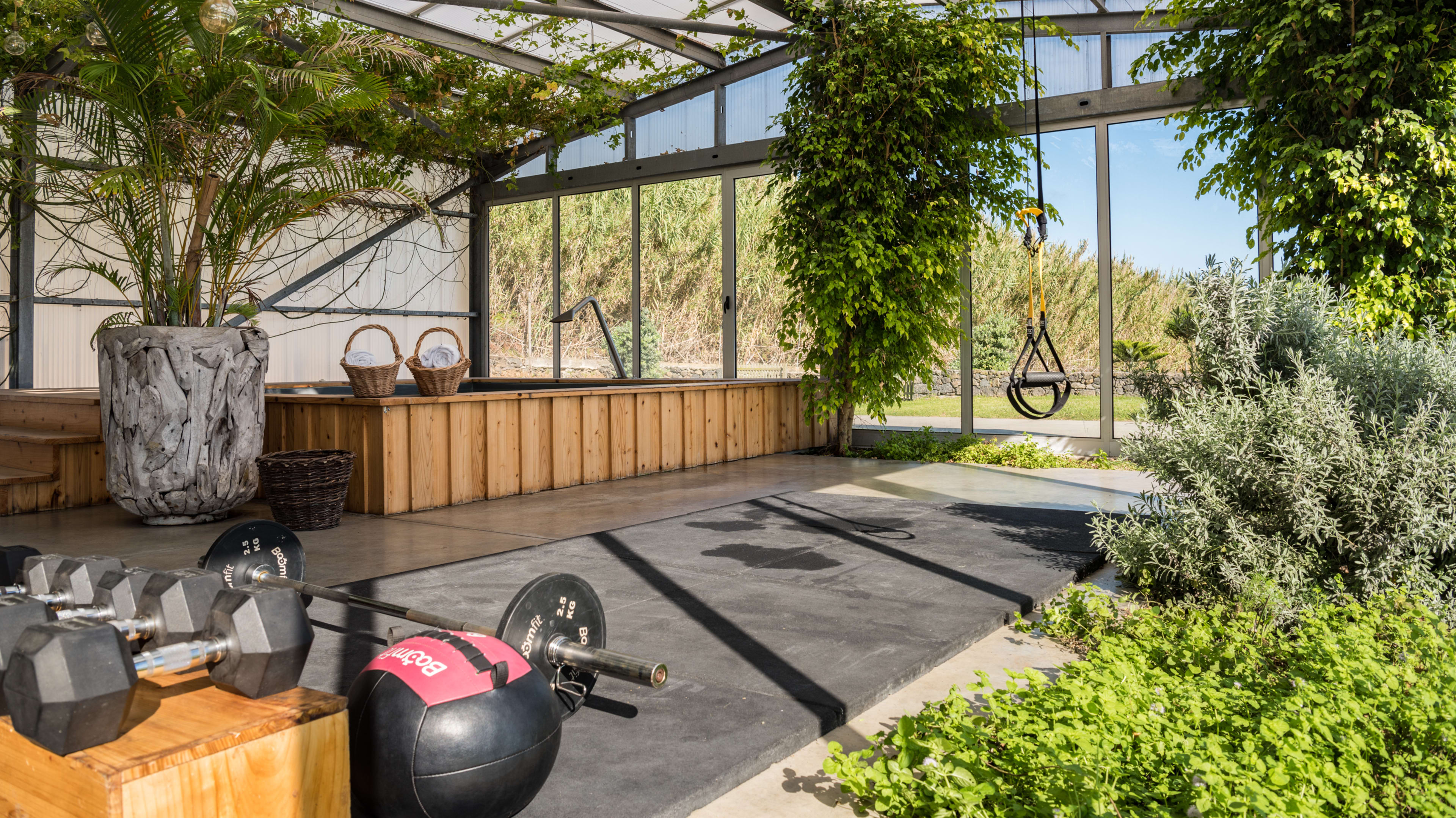 What resembles a plant-strewn greenhouse is in fact the hotel’s wellness retreat, comprising a gym, curtained treatment sala and raised plunge pool. The gym comes with free weights, a rowing machine, exercise bike and treadmill and personal training is available. Between the main pool and the beach, an additional massage hut sits on the cliff.