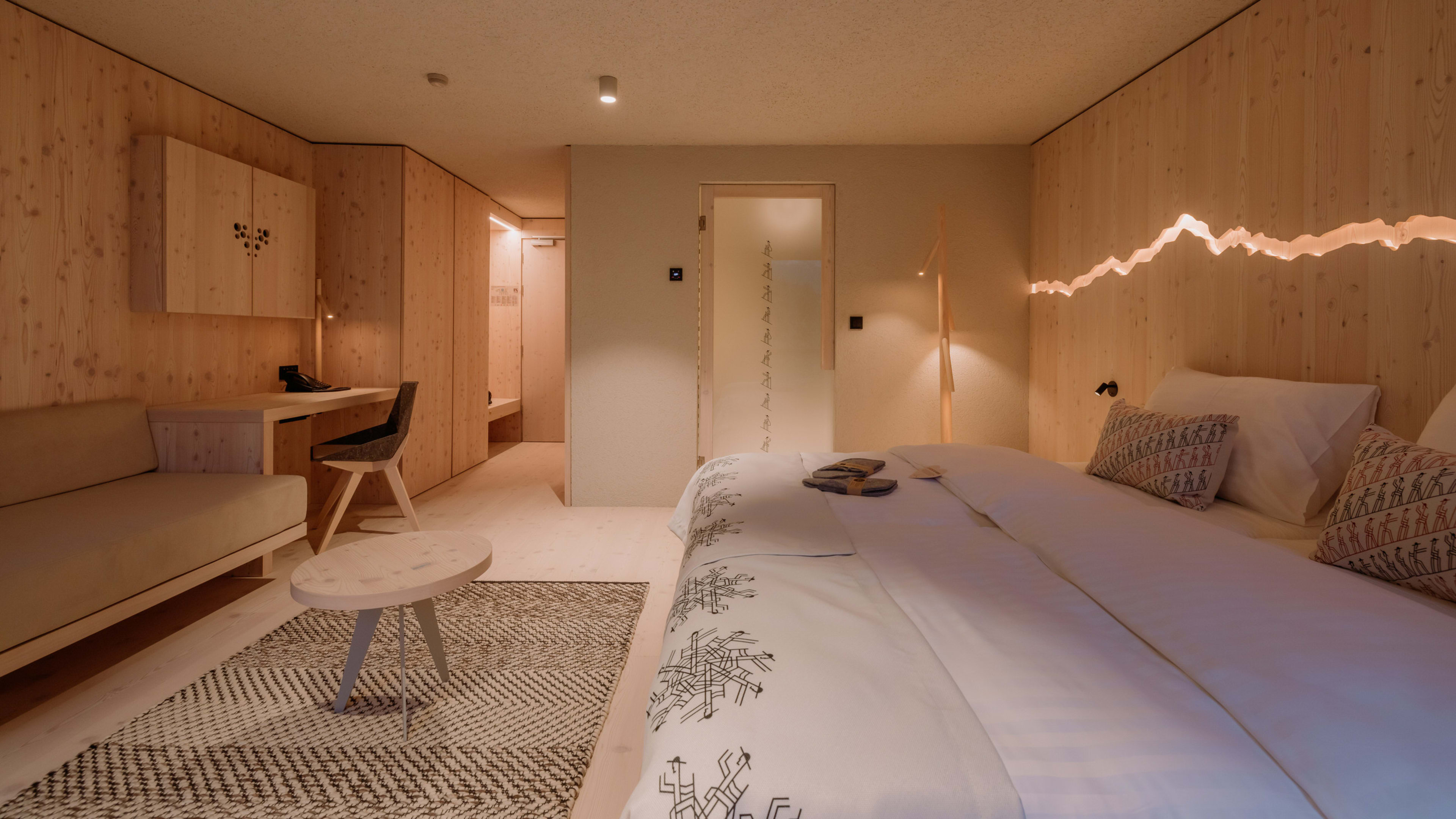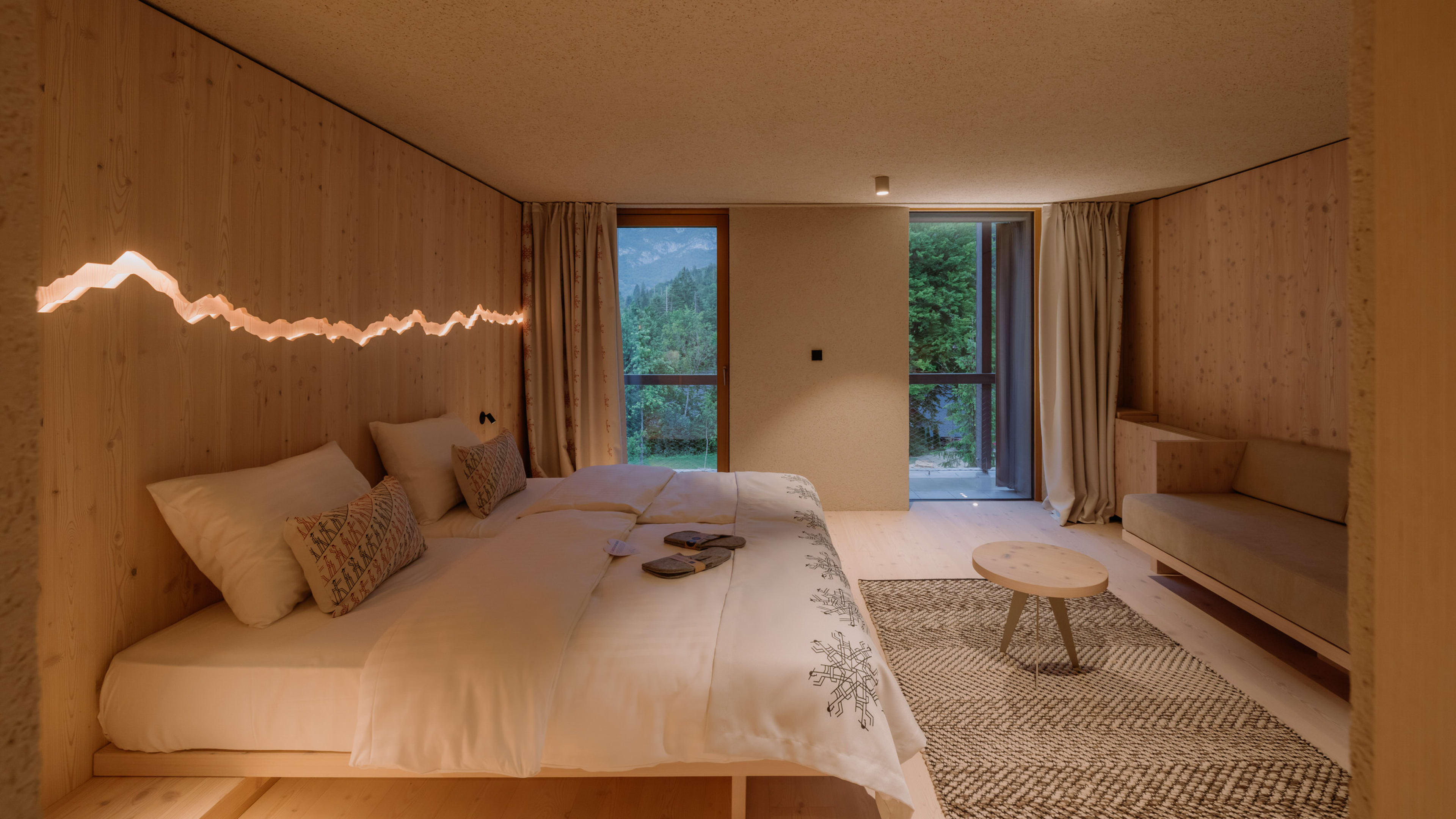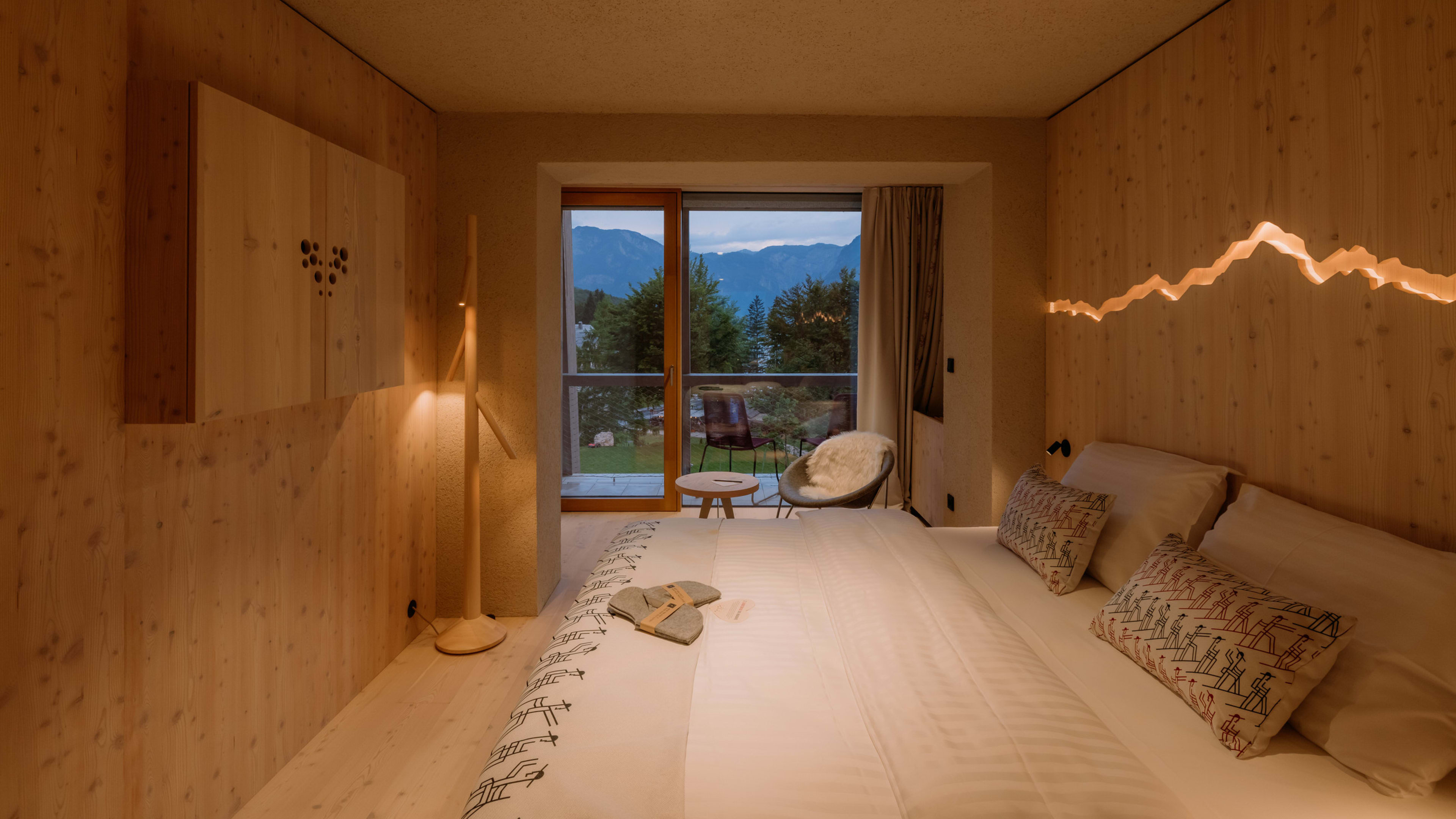 A larch-lined warren of restorative wellness to the rear of the hotel, the adults-only spa is a highlight of any stay at Hotel Bohinj. Its design is compartmentalised – a space of corridors and cocooning zones of calm, comprising Finnish and Turkish saunas, a relaxation lounge with views down to the lake, a garden-facing terrace and spa pool, and three treatment rooms (bring your own tunes to stream through Bluetooth speakers to accompany your massage or facial). All the senses are catered for here: there’s an ice fountain, steam room, and experience showers; to reach the spa’s refreshment station, you pad barefoot across a textured, reflexology walkway. Downtime in the indoor lounge deploys chromotherapy and salt crystals to promote healing as well as rest. Two hours’ access a day is free to hotel guests, but you’ll want to book in for a massage or body treatment: our tip is to opt for one that includes time on the zero-gravity heated water-bed for a cosseting sense of weightlessness.