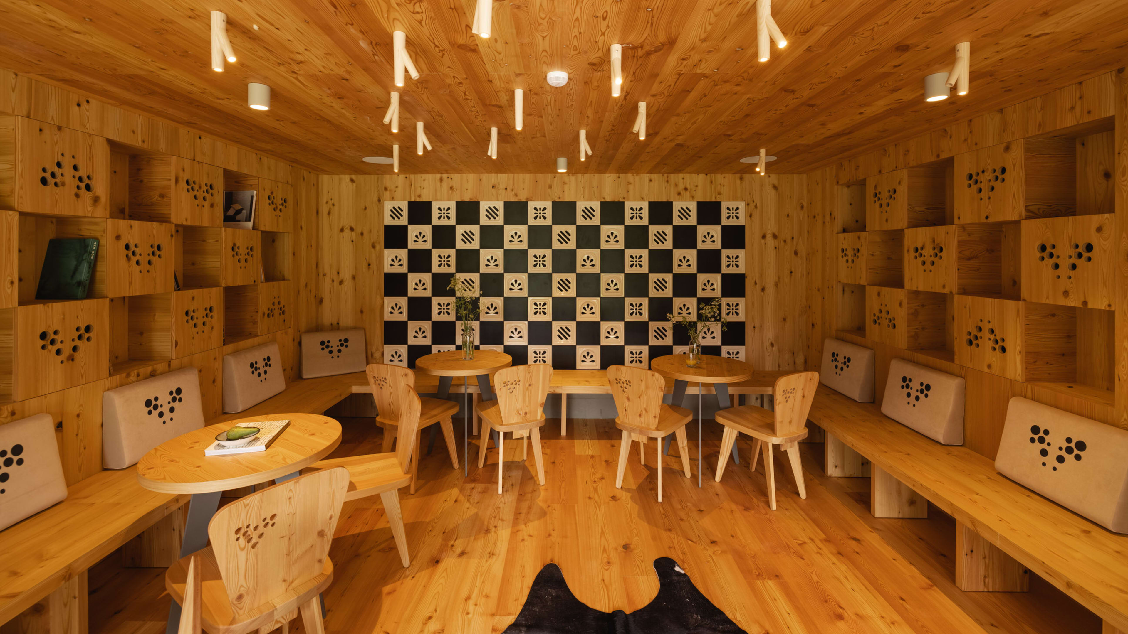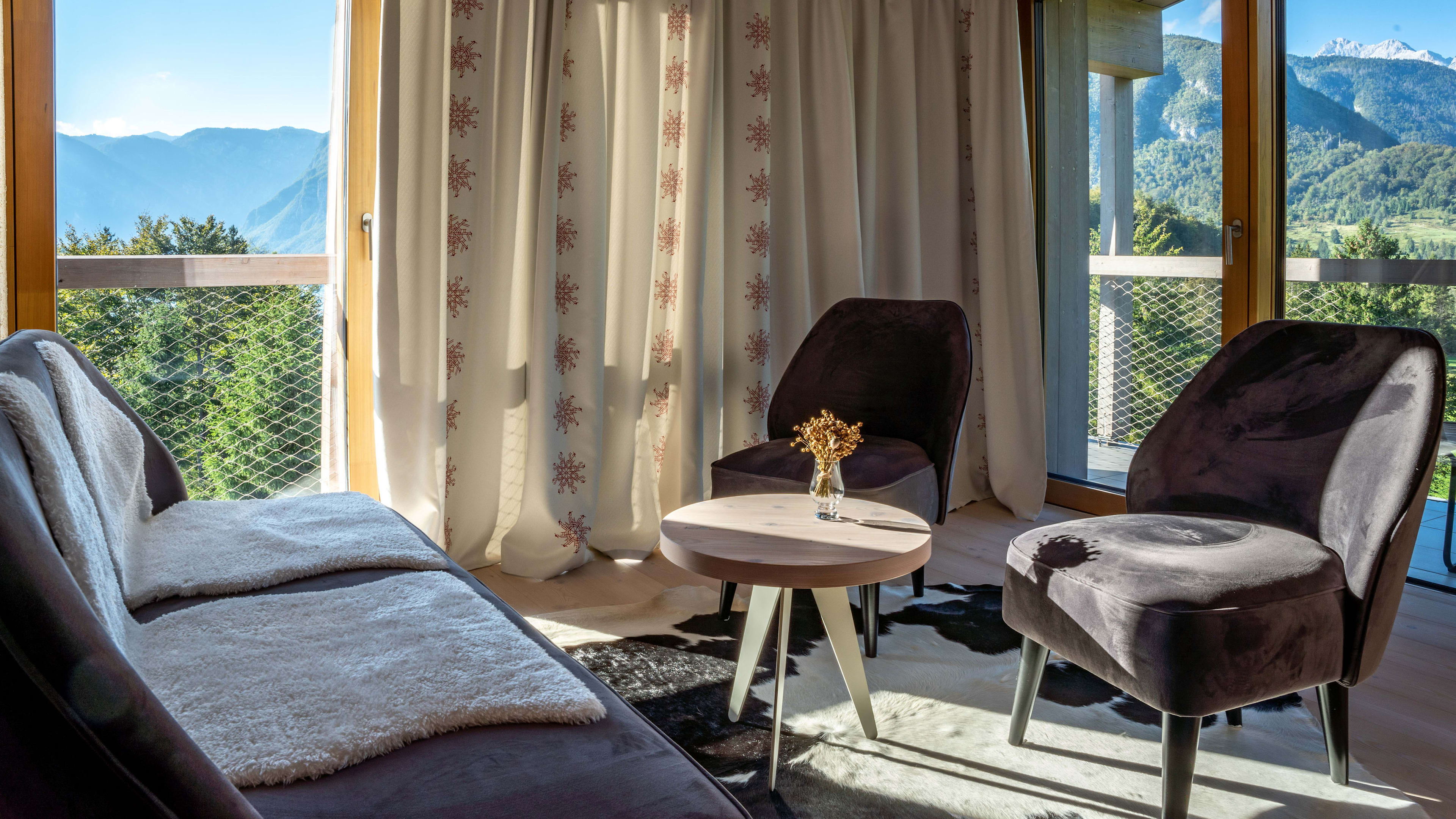 There are free-flowing lounge spaces off the lobby, including cow-hide-dressed tub chairs and tables by reception, a mezzanine lounge overlooking the entrance, and tables in the restaurant that double as drinking spots. To one side of reception, a secluded lounge has a checkerboard wall of traditional oven-doors turned into an installation and is a cosy spot for coffees or apéritifs. Downstairs, the Club is Hotel Bohinj’s dedicated drinks lounge – open till 2am and the venue for a calendar of live music and DJ sets (Saturday nights are a highlight). A cellar wall of resting bottles indicates the Club’s other key passion – wine: this is where group and individual tastings of the grape and the good are held with a sommelier, introducing the hotel’s all-Slovenian vintages (in summer, sessions migrate to tastings around the outdoor fire pit).