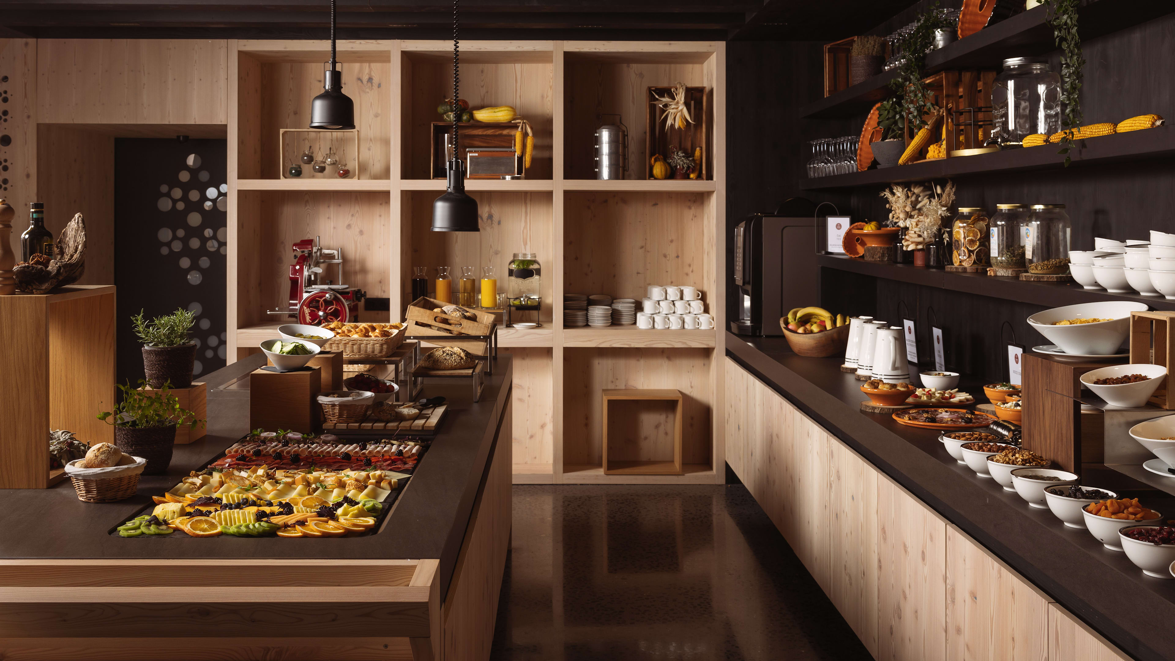 Off the lobby, Hotel Bohinj’s restaurant is an all-day dining spot, its larch-lined, airy dining room, flooded with light from floor-to-ceiling windows overlooking the front of the hotel. The space is partitioned by a shelf-wall dotted with plants. Breakfast is a buffet affair that’ll have you boomeranging from table to counter for fresh fruit, pastries, bread, cereals and yoghurt, plus top-ups of coffee and juice. A menu that changes with the seasons and showcases local produce in artfully presented plates caters to lunchtime and evening diners, accompanied by a broad choice of Slovenian wines.