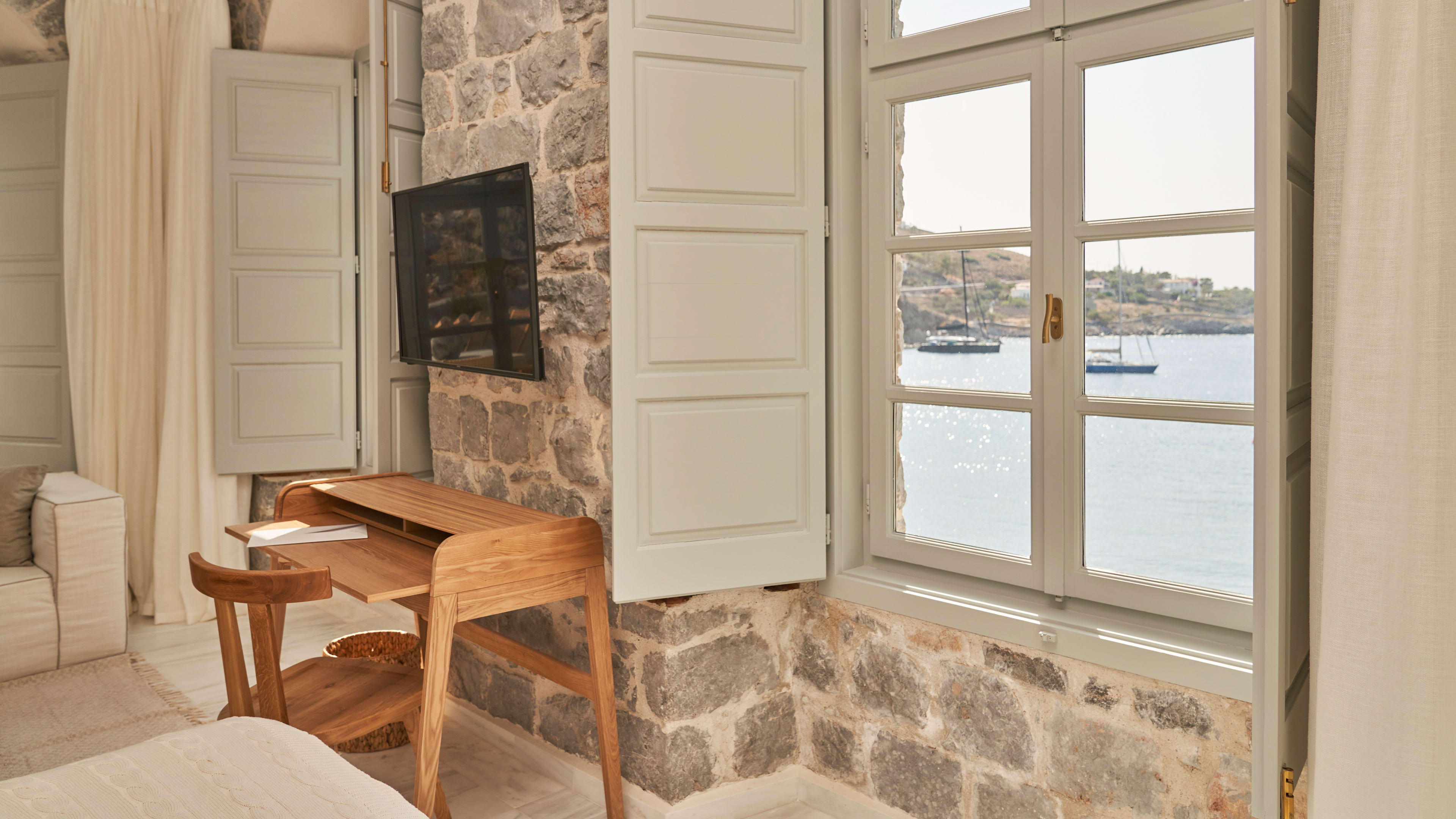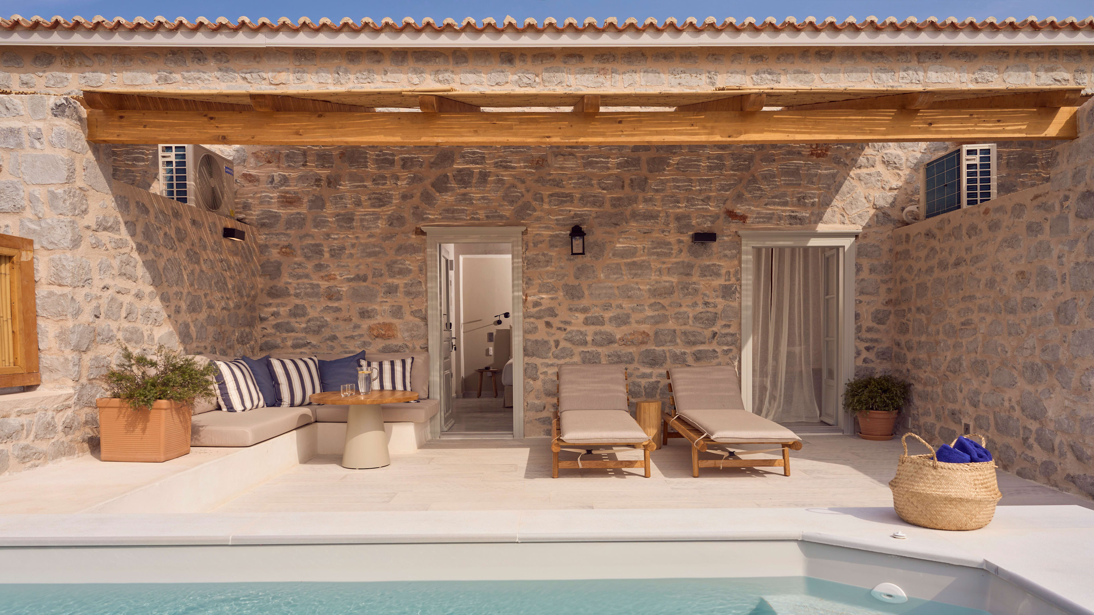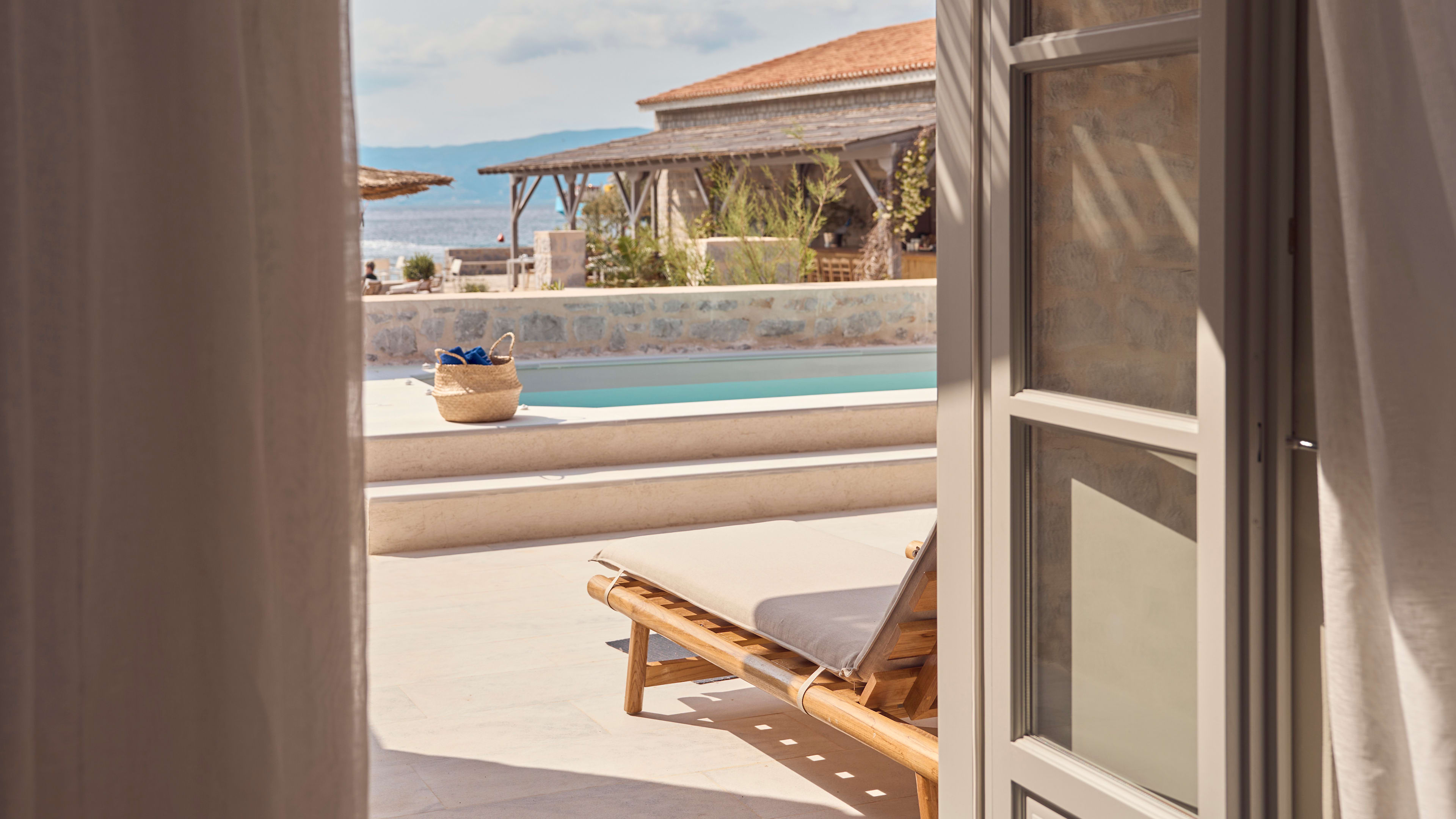 The hotel’s a part of Grecian history too, with a small 18th-century Orthodox church and remnants of its time as a military base for important 19th-century naval officer Admiral Miaoulis.
