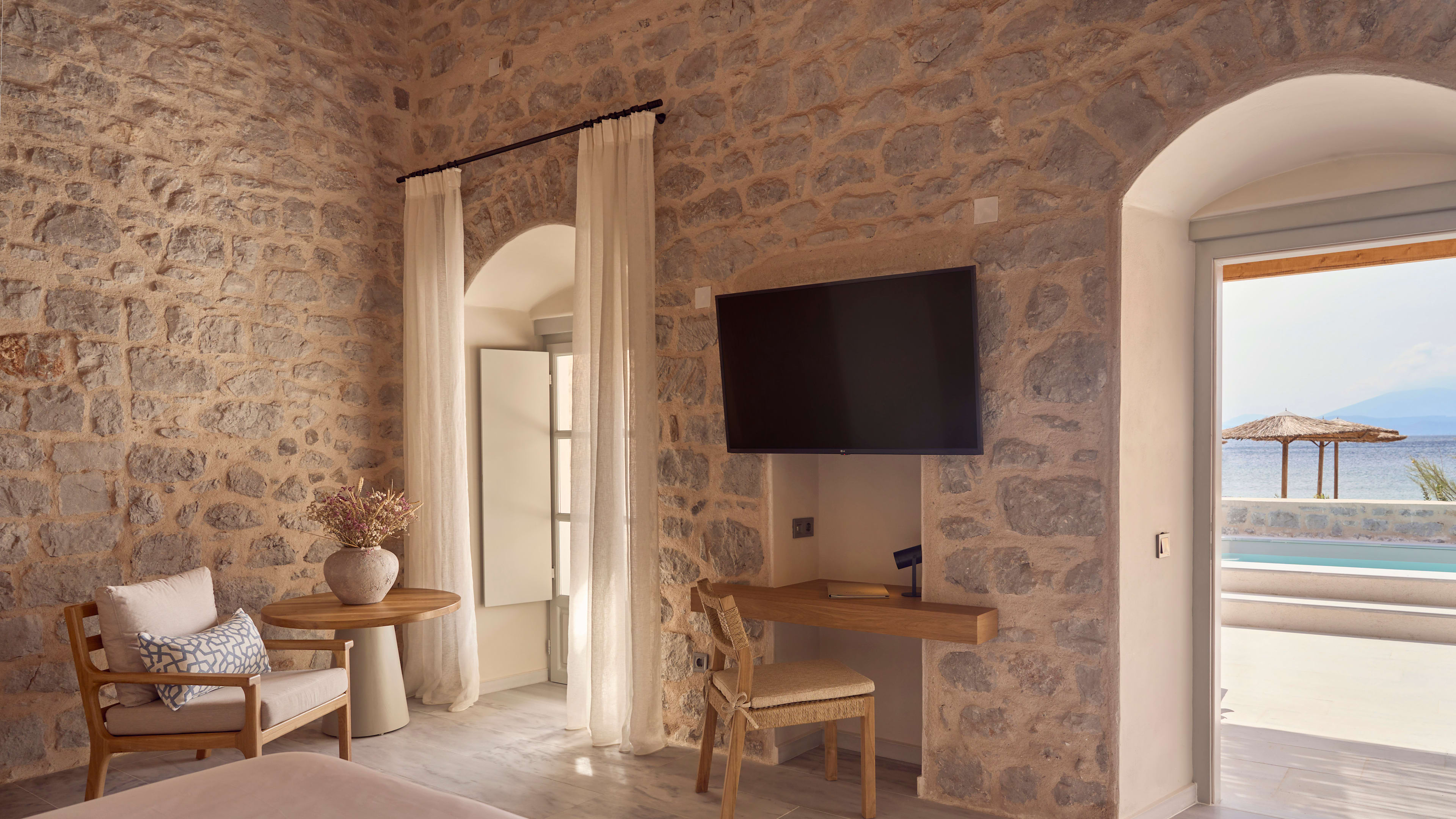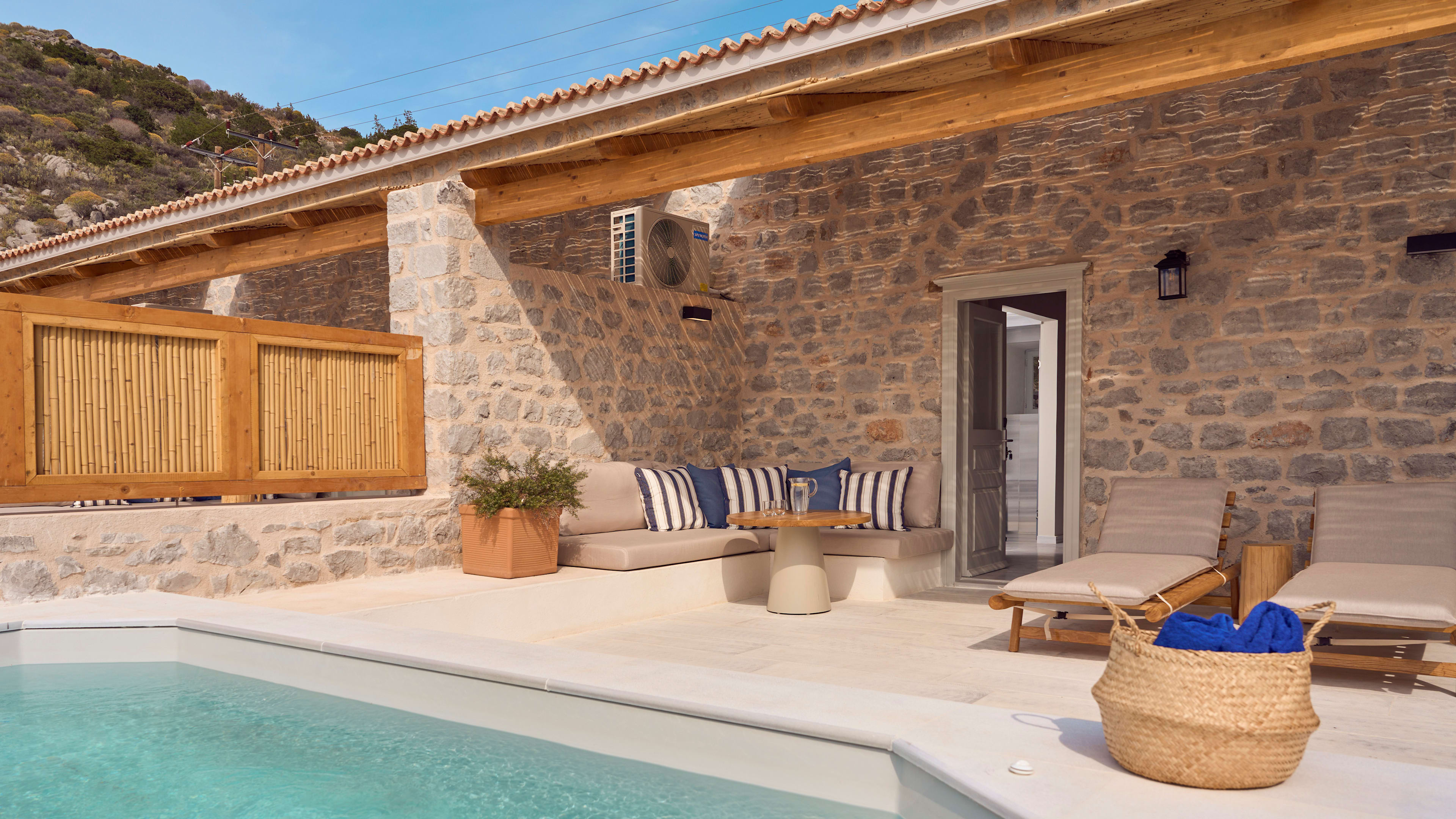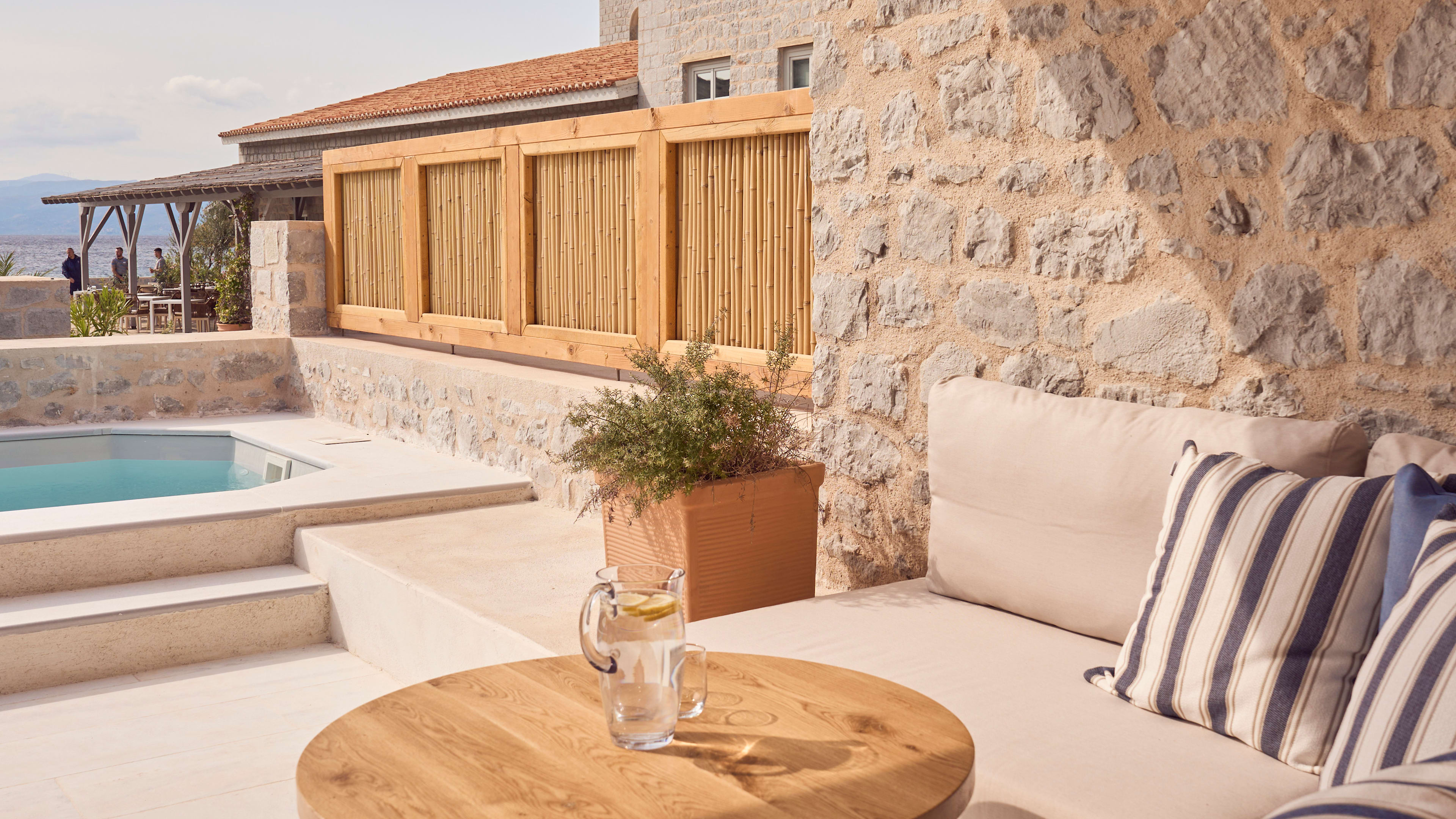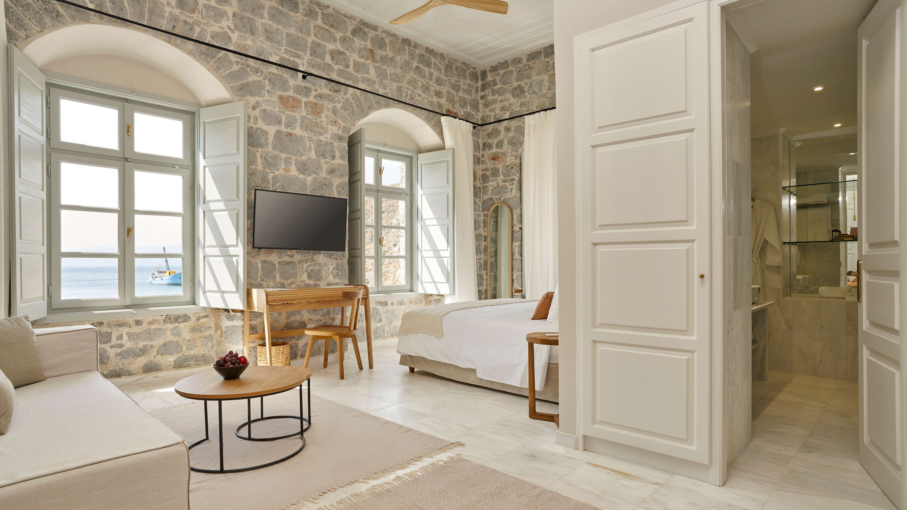 The hotel’s a part of Grecian history too, with a small 18th-century Orthodox church and remnants of its time as a military base for important 19th-century naval officer Admiral Miaoulis.