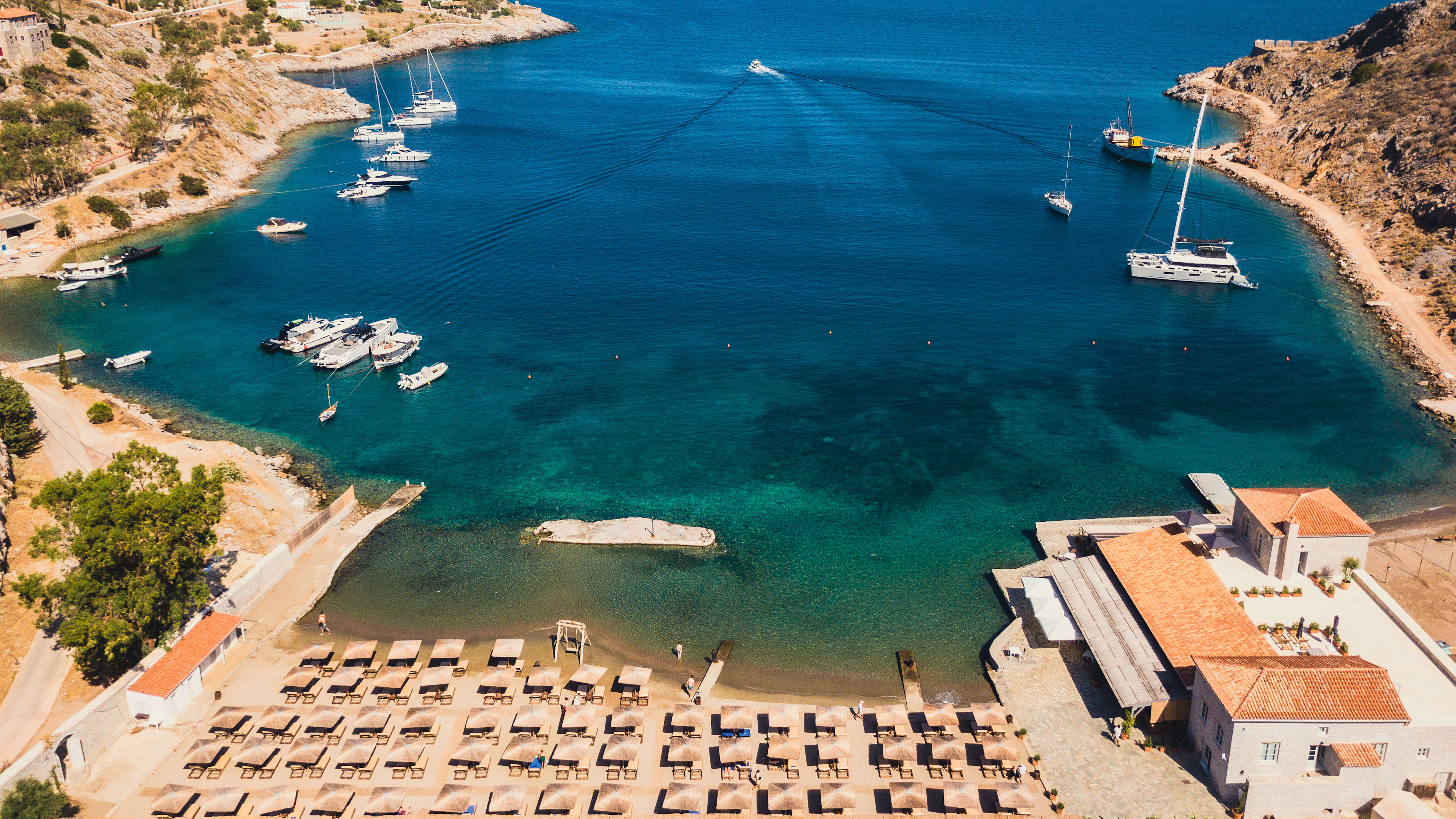 The hotel isn’t just by the beach, it’s by the only sandy beach in the whole of Hydra. So, Mandraki Resort has made the most of its fortuitous position, spacing out sunloungers and parasols that are free for guests to use. The bay is sheltered and safe for swimming, and there are moorings for yachts, too, if you fancy a luxurious jaunt along the coastline – the hotel can help to arrange hire of various vessels if you didn’t glide in on your own. There are two resident yogis who hold private sessions on request (for a charge), and a therapist can be called on for massages. Hydra Port is just a three-minute free shuttle ride away, and the stately naval mansions of the 18th and 19th centuries, winding cobbled streets, and a kibosh on modern architecture make Hydra’s main town a picturesque one indeed. Watch fishermen haul in their catches, spy drowsy cats, and stop into the History Museum and the Lazaros Kountouriotis Mansion to learn about the island’s past. Or pull on the island’s countercultural roots; Cubist artist Nikos Hadjikyriakos-Ghika set up an artistic community here in the 1930s, and by the 1960s the likes of Henry Miller and more famously Leonard Cohen (who wrote Bird on a Wire and So Long, Marianne here), had bought properties. The songwriter’s pad is tucked away on a hillside close to the Four Corners grocers, if you want to pay your respects. While wandering, try to hunt down a small door marked ‘poems’, behind which is a book of verse contributed to by residents, and the beautiful 19th-century Rafalias Pharmacy. And, each summer, Slaughterhouse, a Deste Foundation project space, hosts pop-up shows by well-known artists. In the wilds, you can ride or swim with horses, or hike out to Kamini, where there’s an upmarket yacht club (ask for ‘KYC’).