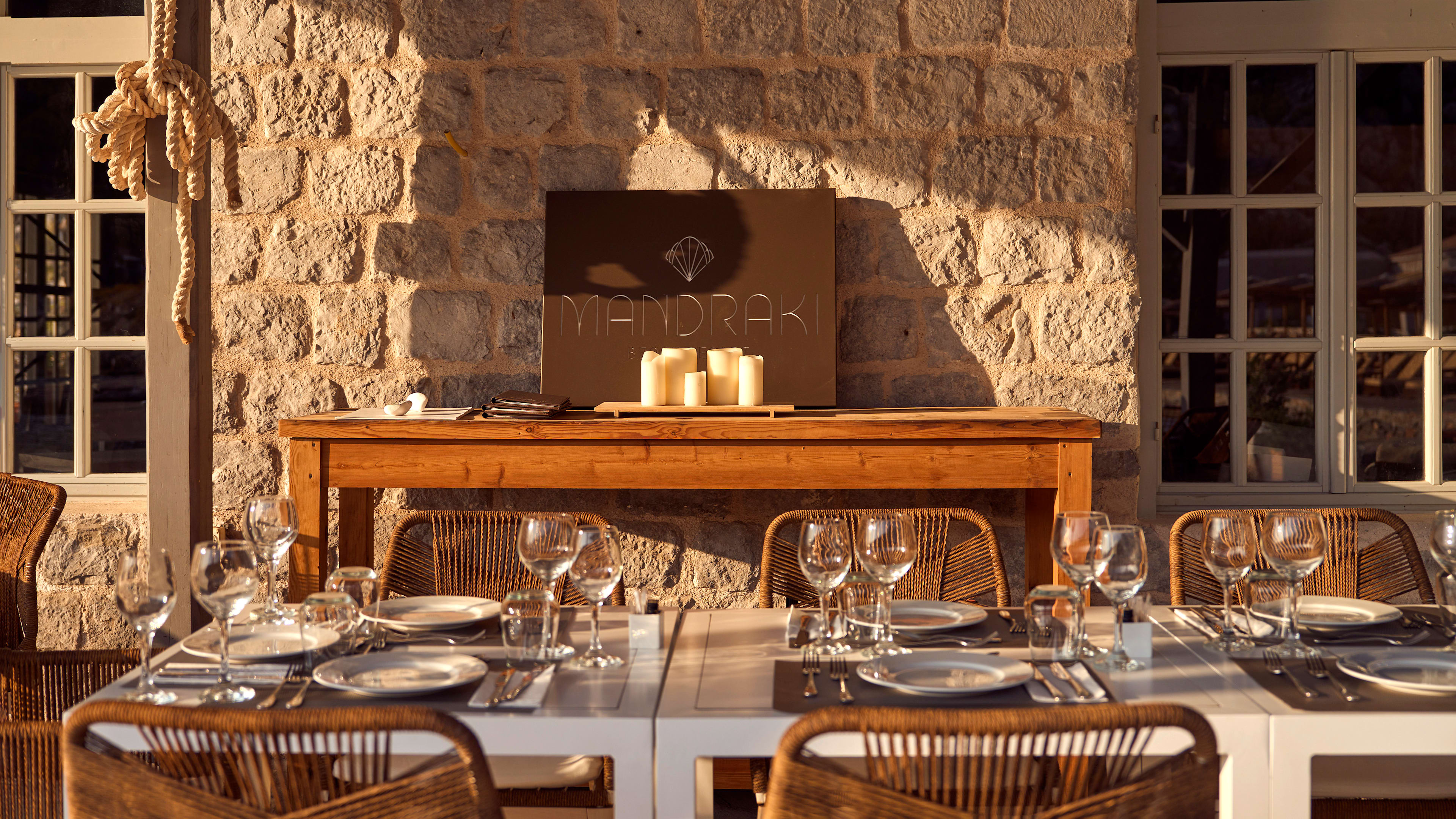 Drinks can be taken on the terrace, or guests can sip and sunbathe. Signature cocktails keep things fruity and refreshing even as temperatures climb – take the Mandraki Spritz with gin, yuzu, lime mint and grapefruit soda; or the Captain M with rum, mango, coconut, guava, and citrus. But frosty glasses of sparkling Greek wine, and champagne mixers are welcome quenchers too. And, if you get peckish, there’s a beach menu of bao buns, sushi rolls, fresh sashimi and lobster burgers.
