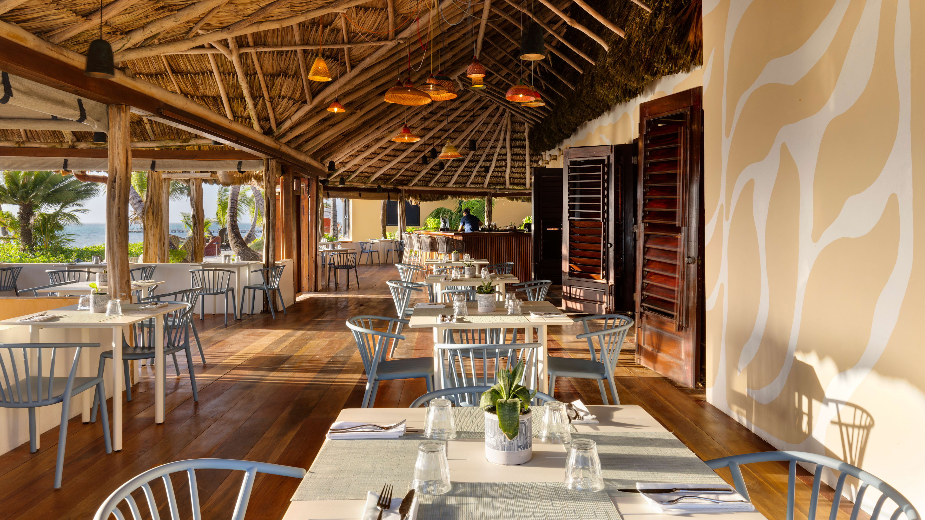 The interior of Mambo – breezy plantation shutters, dark wood tables and chairs, bright paintings and hand-carved sculptures set beneath a soaring thatched palapa rooftop – opens onto an outdoor terrace set with white-cloth draped tables shaded by white umbrellas. No matter if dining inside or outside, you’ll be treated to Caribbean-fusion dishes like jerk seared sea scallops, a robust curried island shrimp and simply prepared catch-of-the-day.