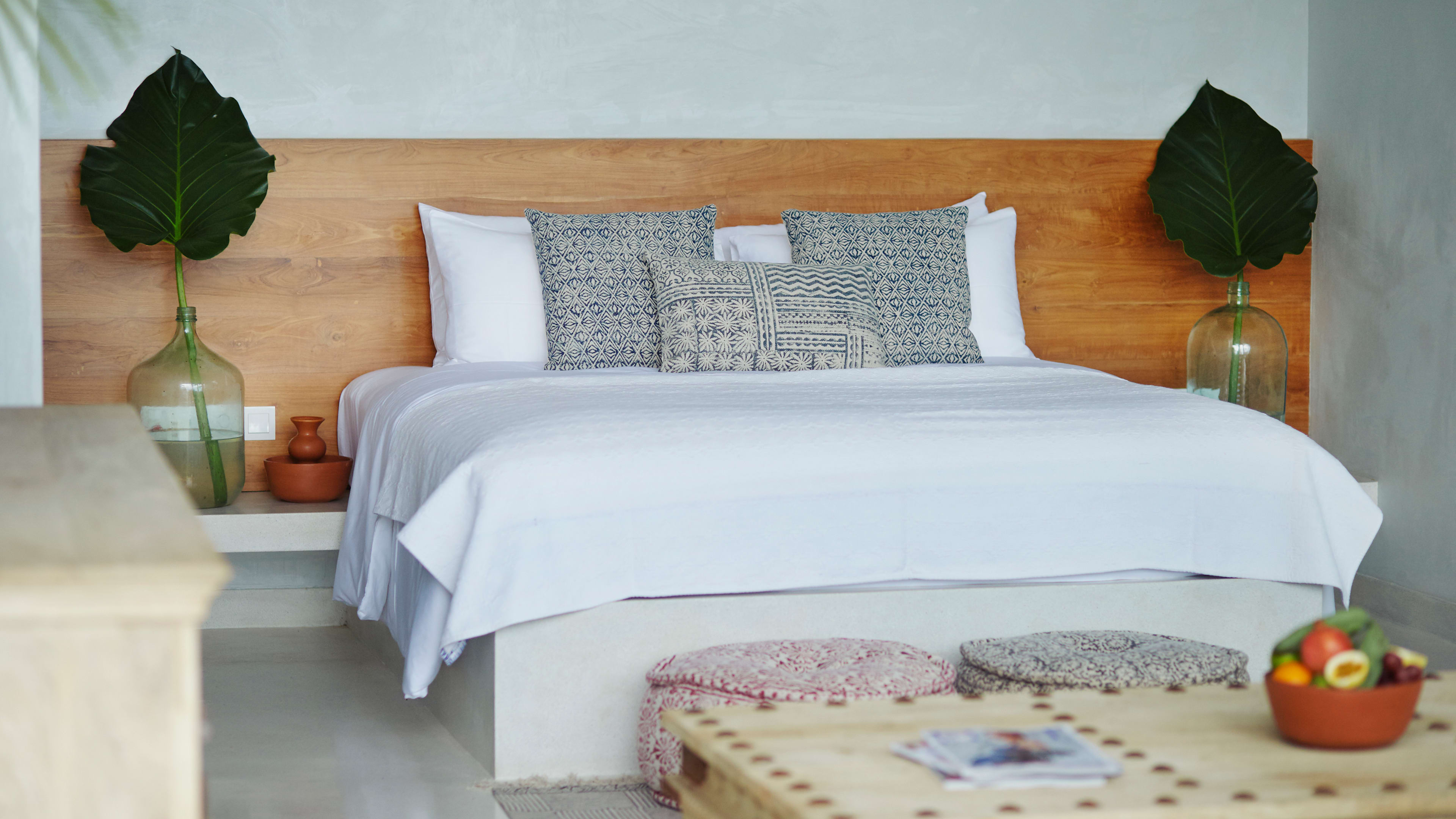 An ornately carved wooden bar, shaped in an arc of polished petals, is the figurative heart of the main house – the place to pull up a high stool and browse the extensive cocktail list or order a bottle of wine to savour from your sofa on the terrace.