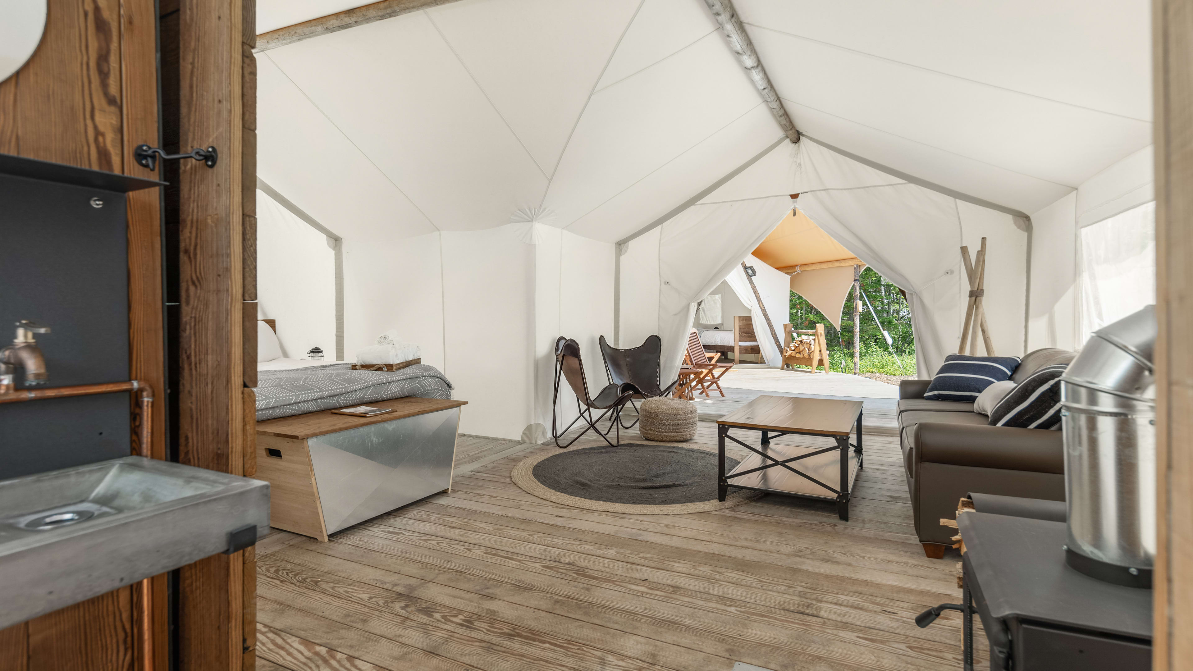 Yoga deck with Lululemon mats and blocks to borrow, a lounge shade pod, nightly campfires, refillable aluminum water bottles, water refill stations, free hot drinks, board games, guest experience coordinators and a small boutique. In tents: USB battery packs, battery-powered fans, lanterns, a wood-burning stove and organic Essential Oils bath products.