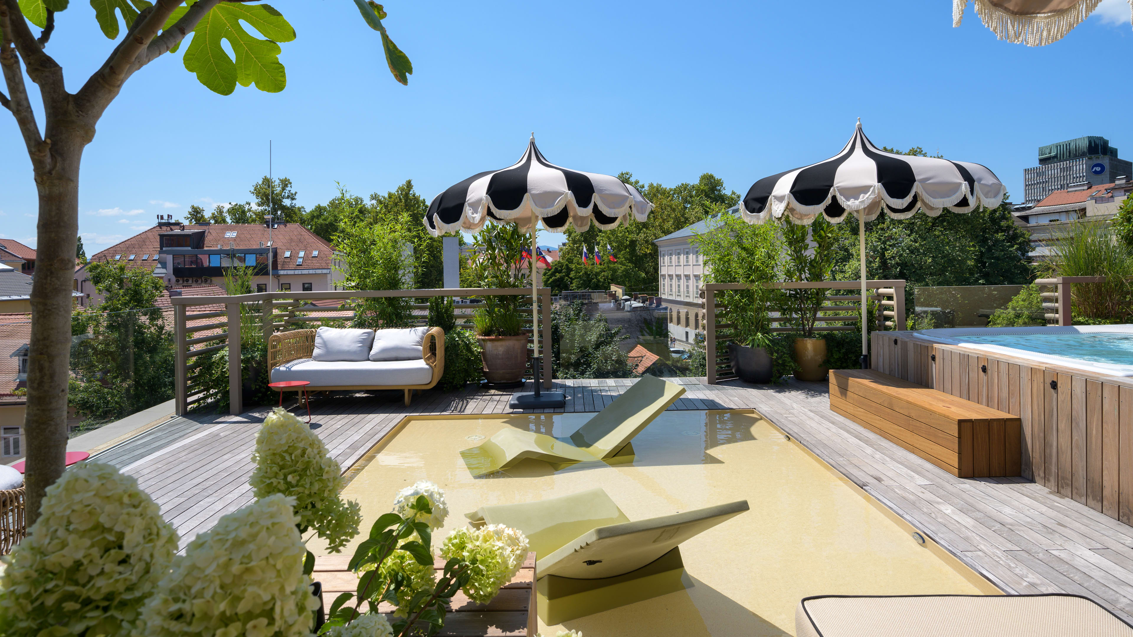 Shades will be sultrily lowered to admire the Ljubljana-castle-topped panorama as you soak on the twin sunloungers set in a shallow pool (paddling-depth only) on the roof terrace (open from March till November).